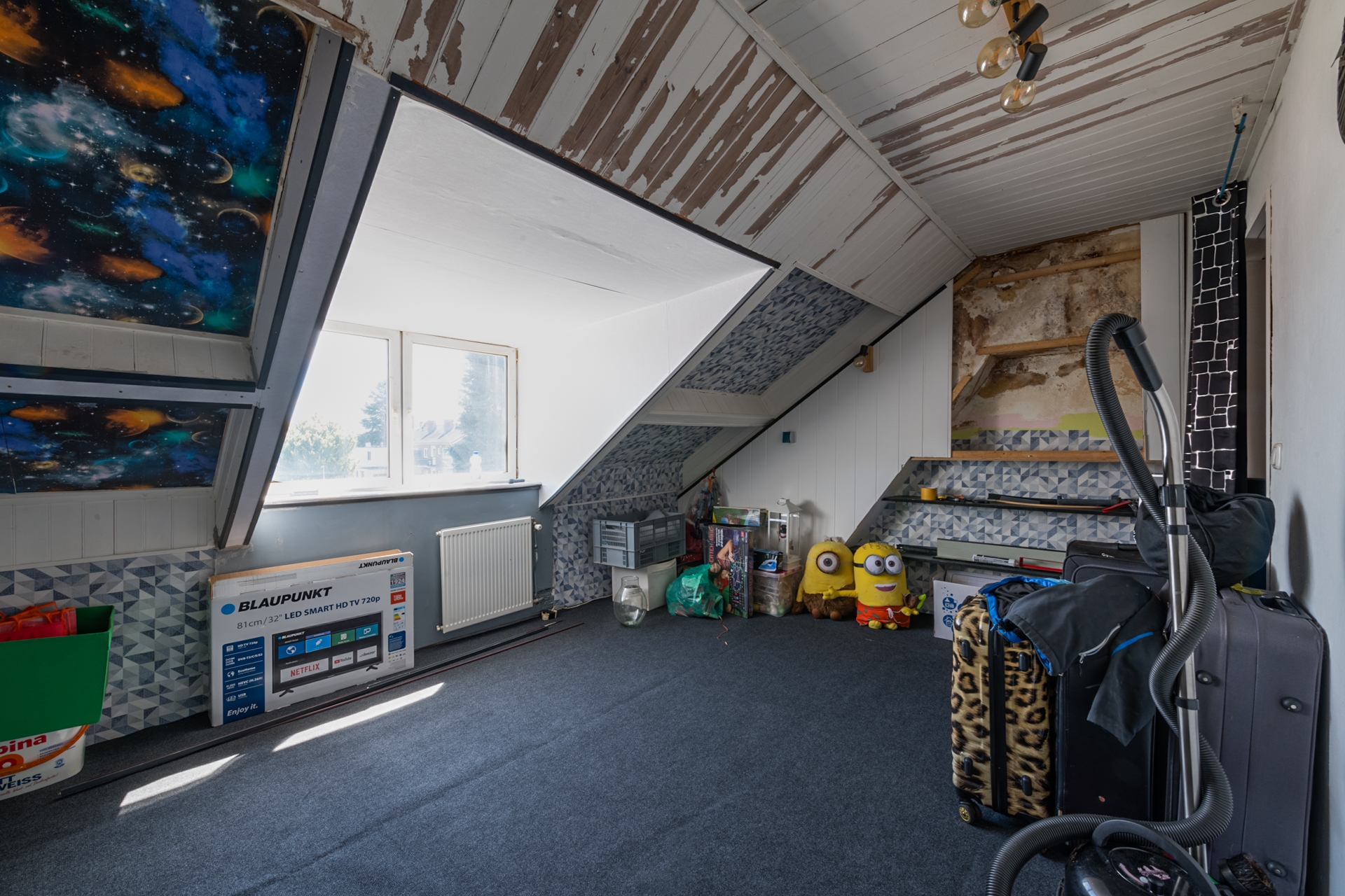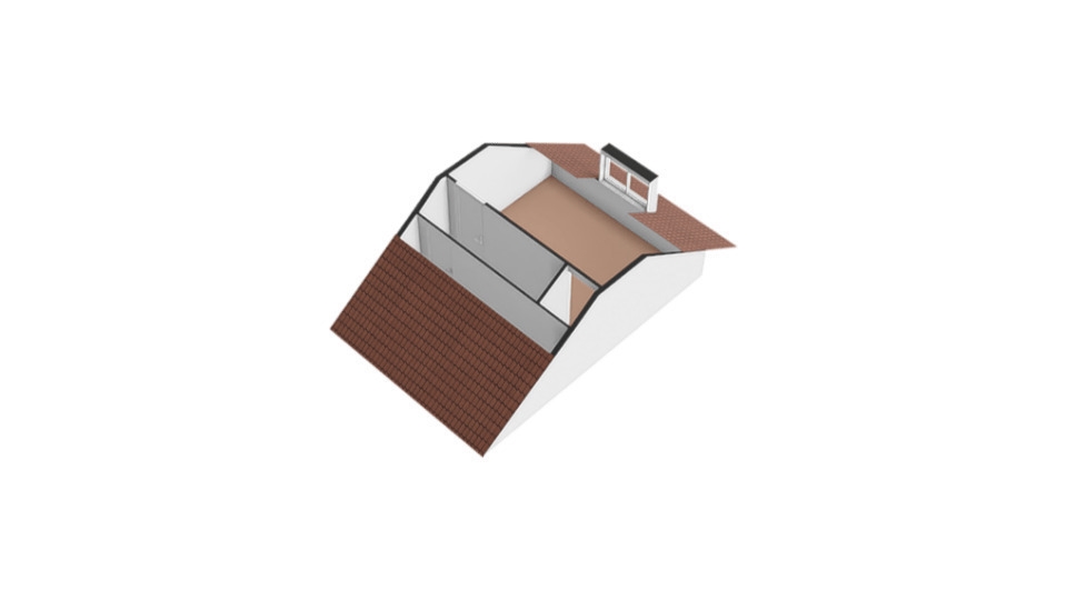 De 2e vaste trap brengt ons naar de zolder. Ook hier een overloop met aan beide zijden een eigen ruimte. De voorzijde biedt plaats aan een fikse berging (463 x 264 cm) met schuine kap en de achterzijde is geschikt als slaapkamer. De geplaatste dakkapel heeft van deze kamer een zeer bruikbare en grote toepassing gemaakt.
