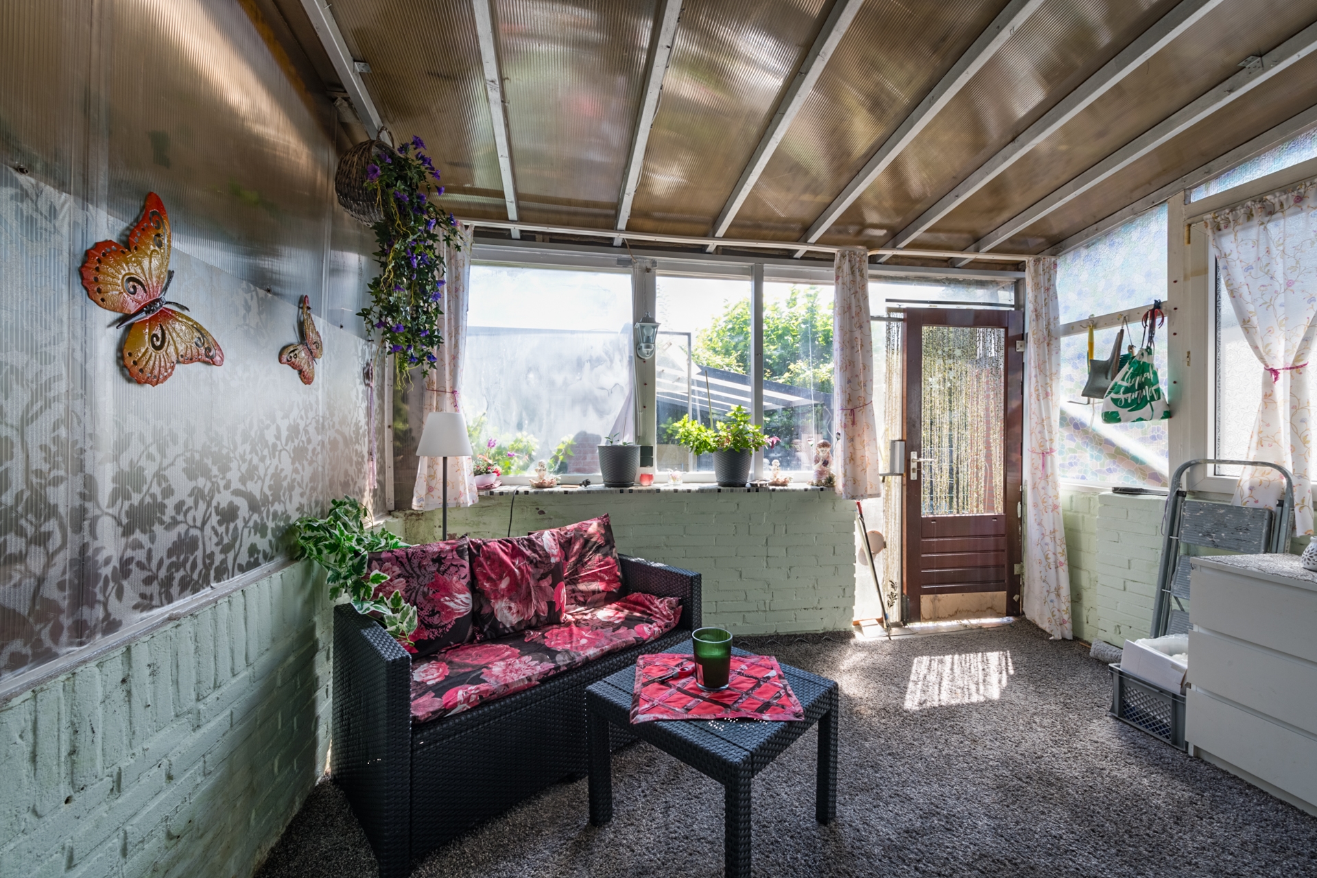 Achter de woonkamer is een lichte serre gebouwd waar in de zomer- en winterdagen genoten kan worden.