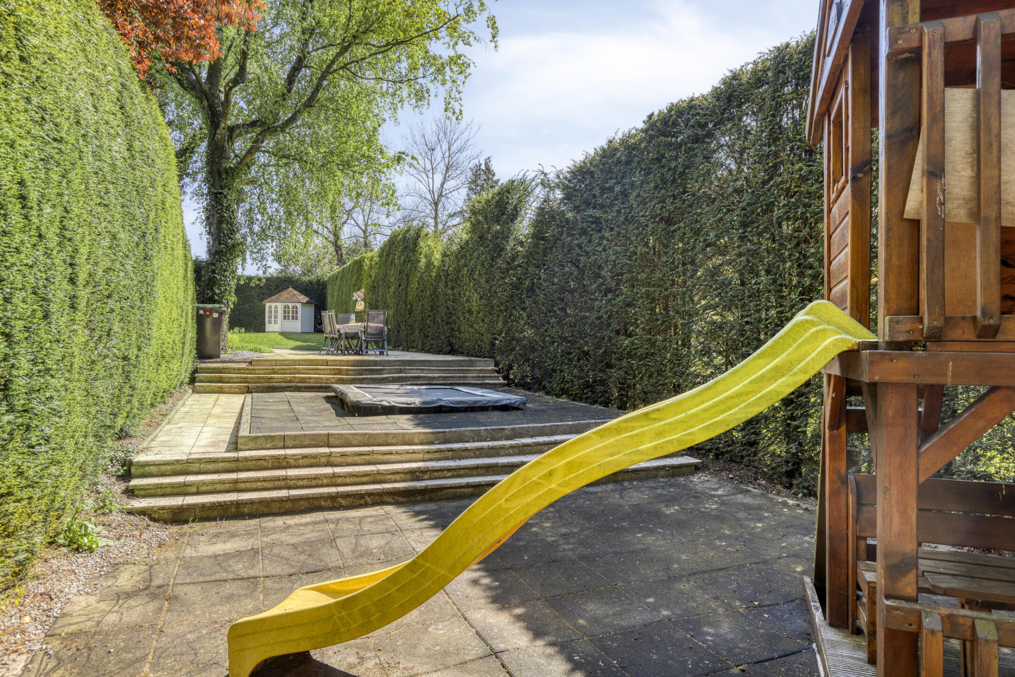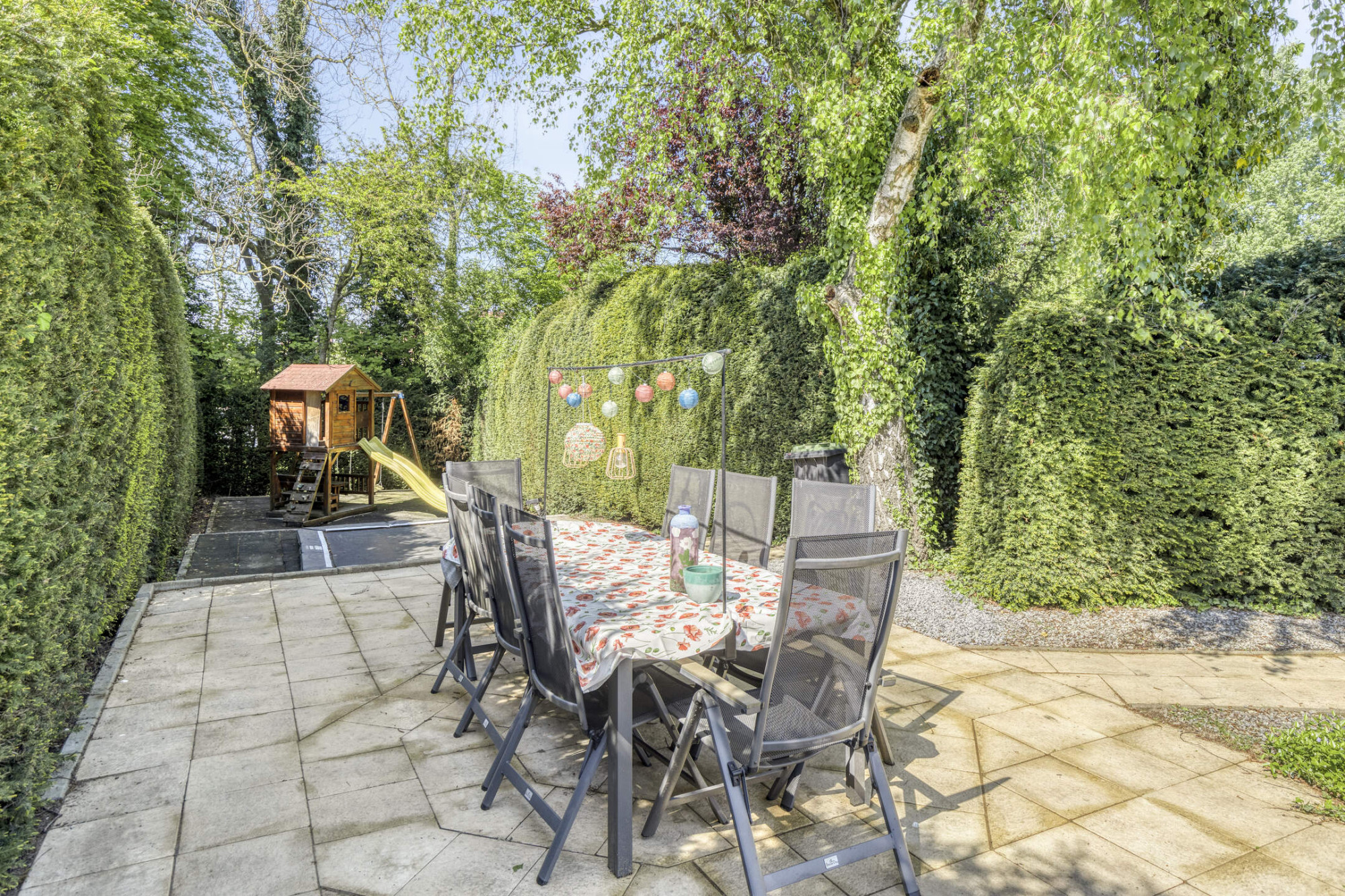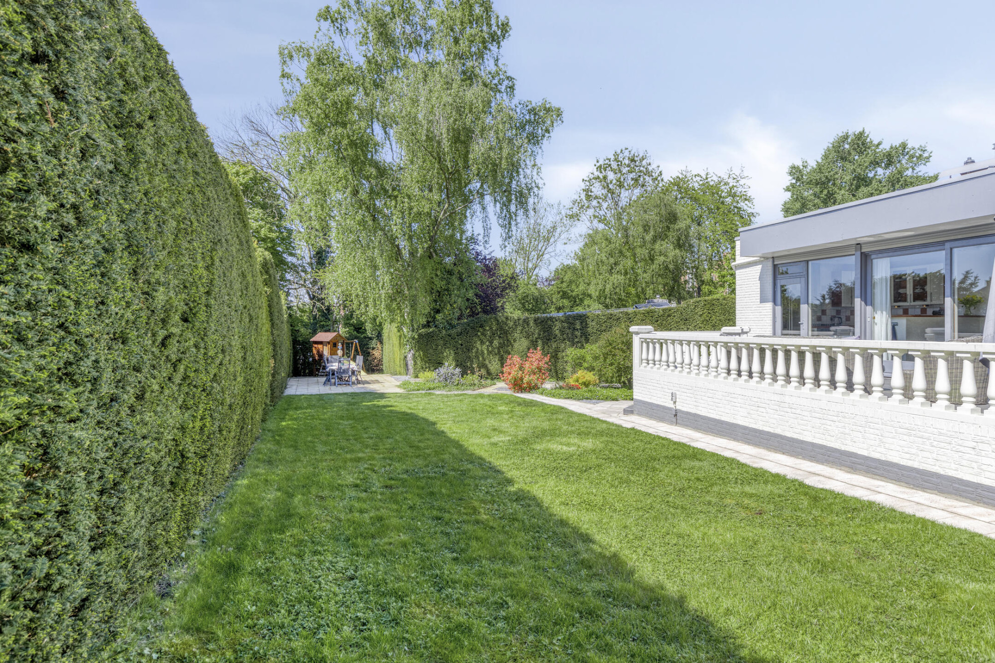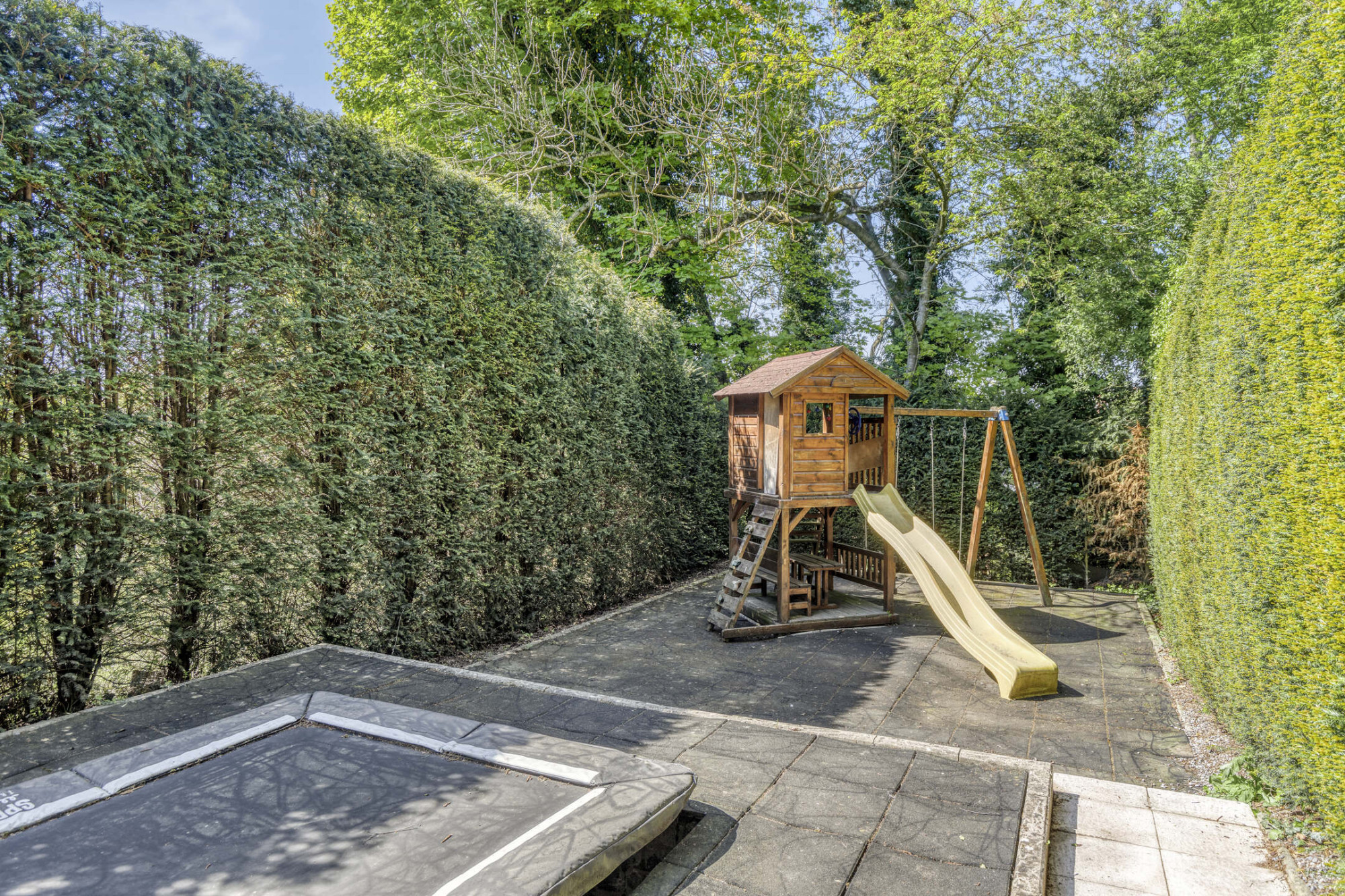 Het zonneterras is geheel betegeld en sluit aan op de riante achtertuin van deze bungalow. De achtertuin biedt volop privacy en is voorzien van gazon, looppaden, diverse beplantingen en bomen, en in de hoek van de tuin is er een speelhoek voor kinderen met een speeltoestel en een trampoline.