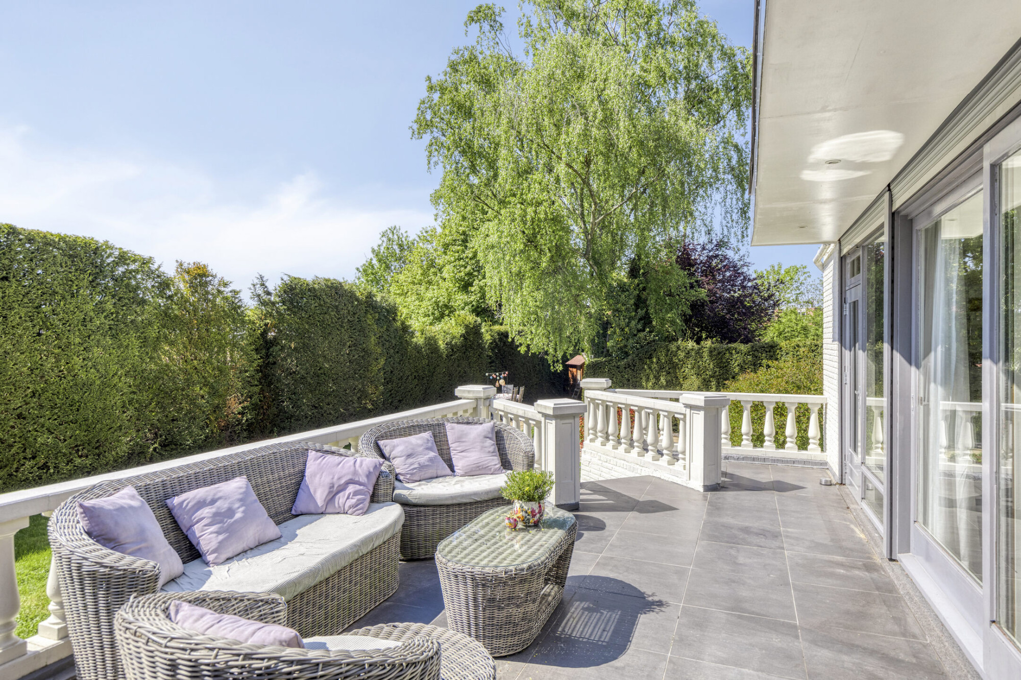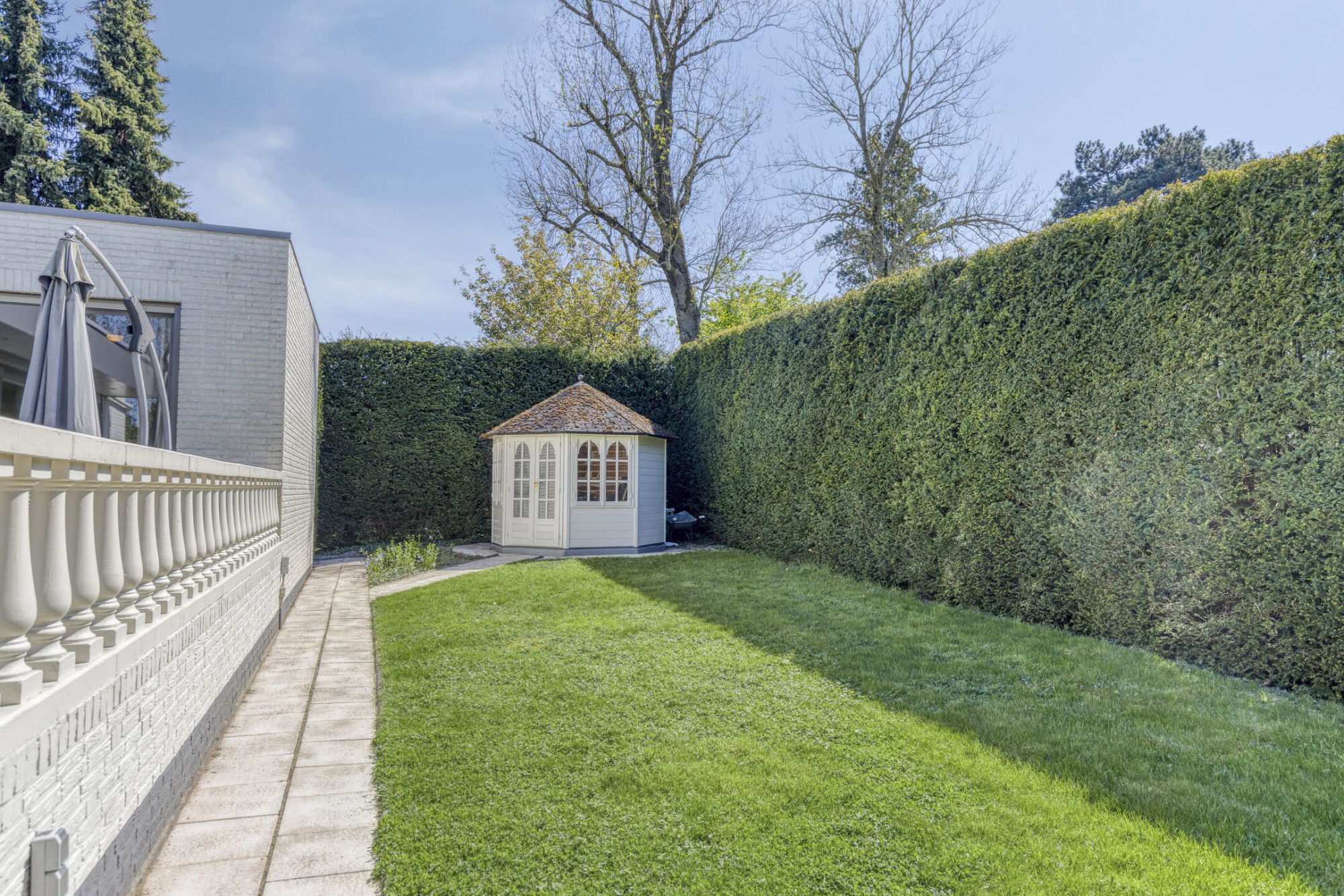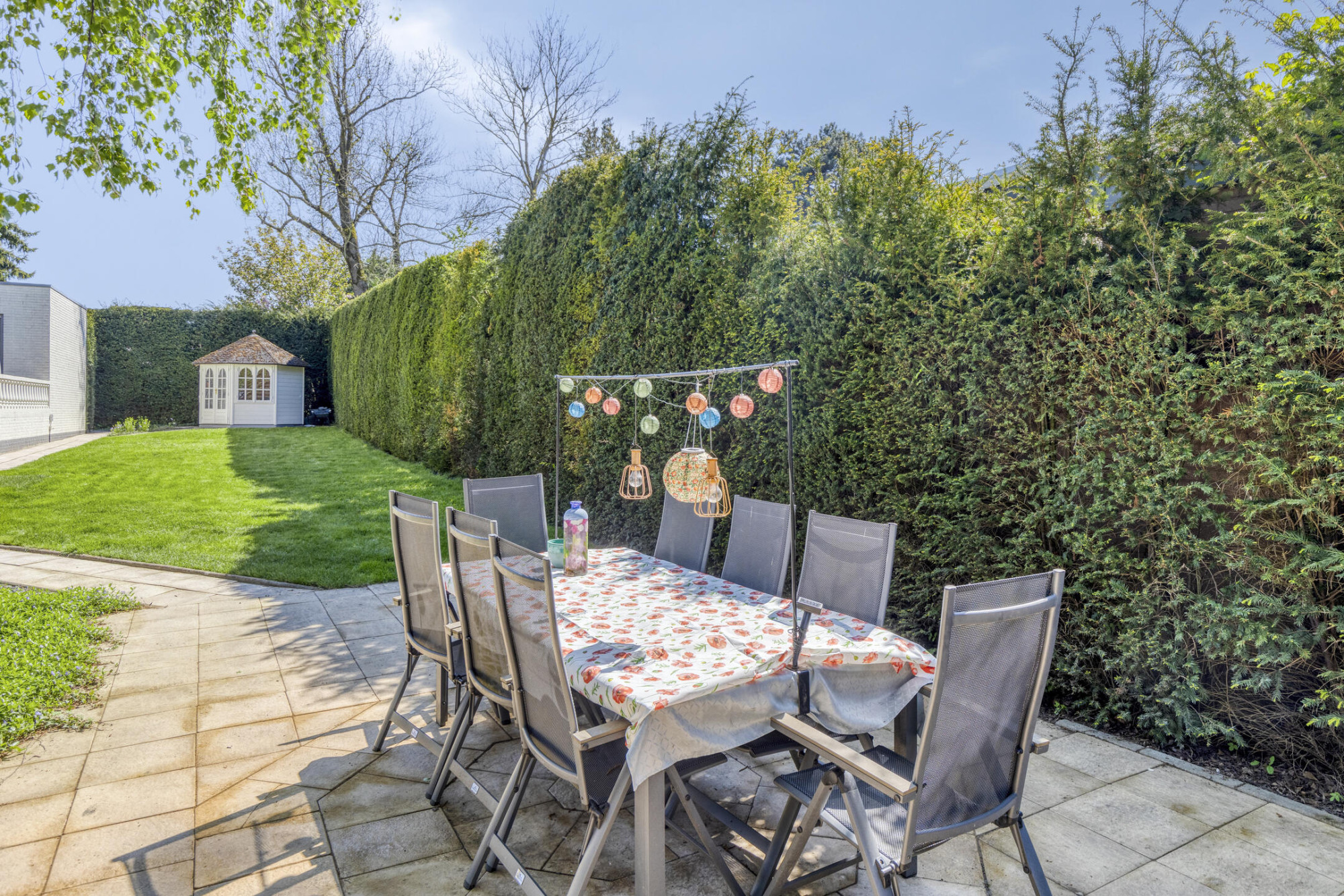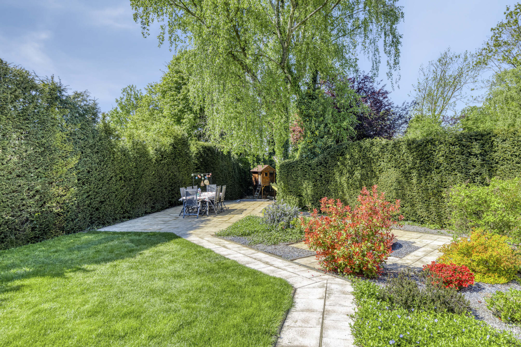 Het zonneterras is geheel betegeld en sluit aan op de riante achtertuin van deze bungalow. De achtertuin biedt volop privacy en is voorzien van gazon, looppaden, diverse beplantingen en bomen, en in de hoek van de tuin is er een speelhoek voor kinderen met een speeltoestel en een trampoline.