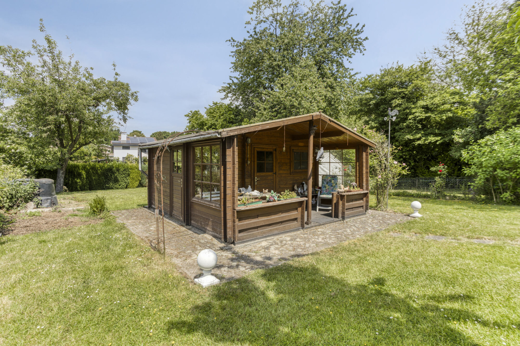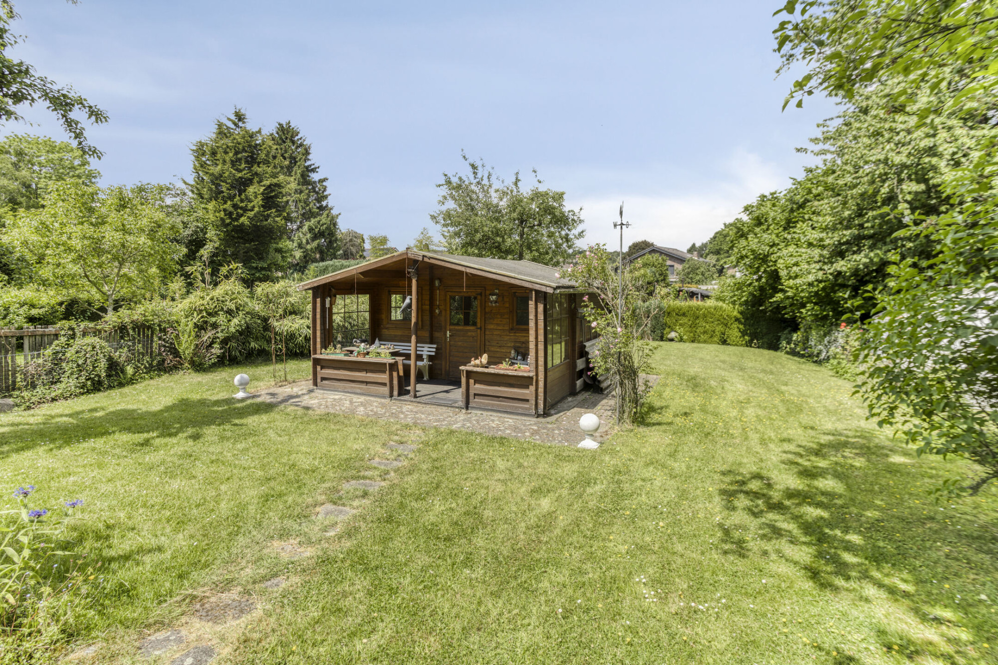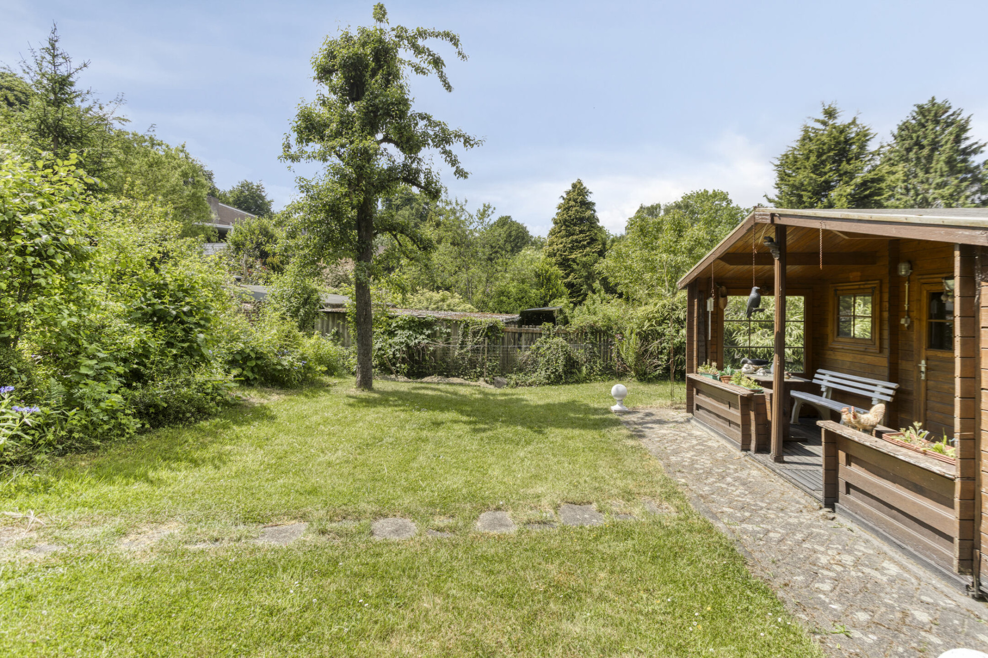 Zeer ruime achtertuin met houten tuinhuis, gazon, diverse aanplanting en op het einde van de tuin is uitmonding van de Anstelerbeek en Strijthagerbeek.