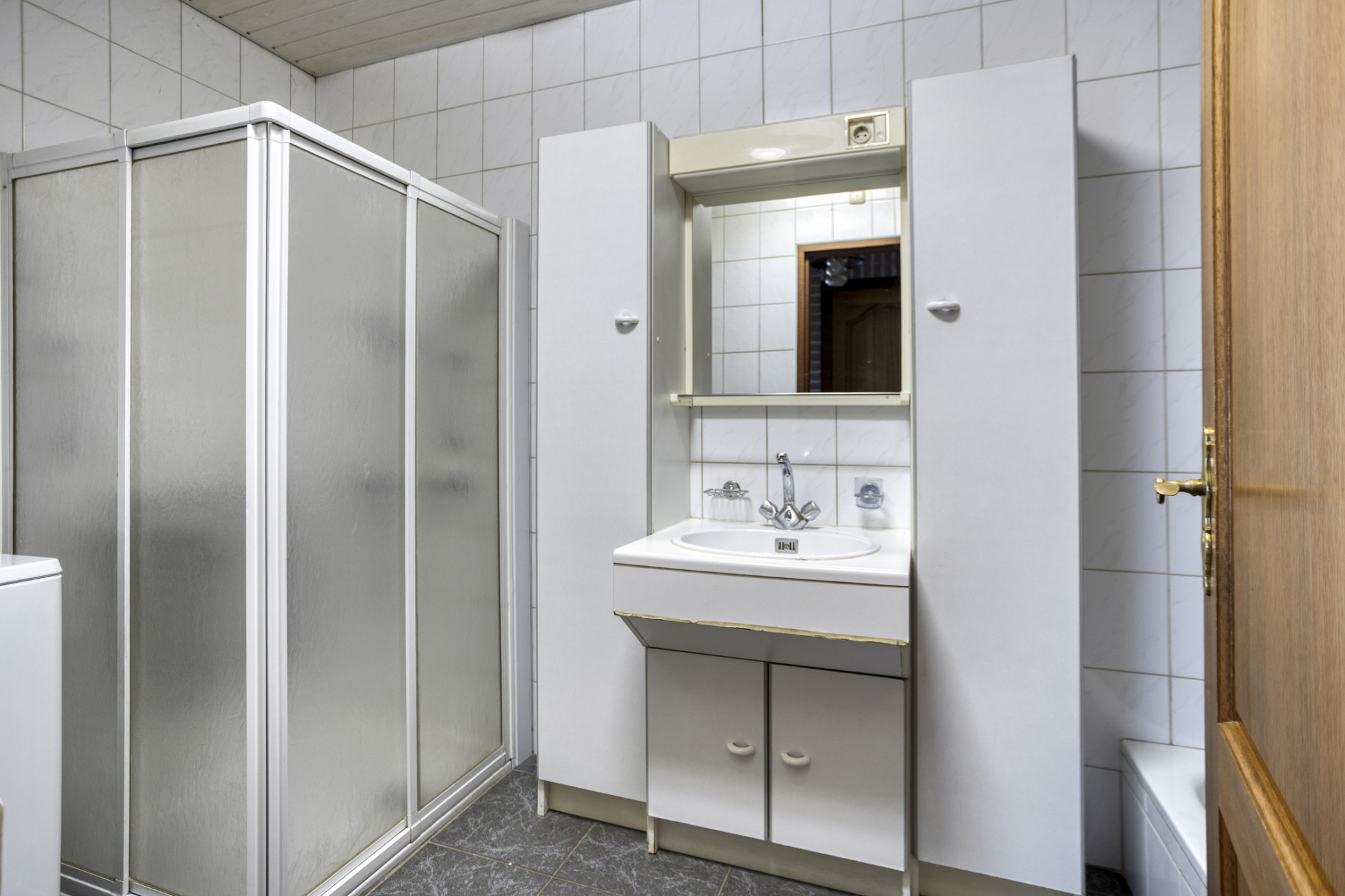 Geheel betegelde badkamer (3.51 x 1.73 m) met douche, vaste wastafel in badmeubel en witgoed aansluitingen.