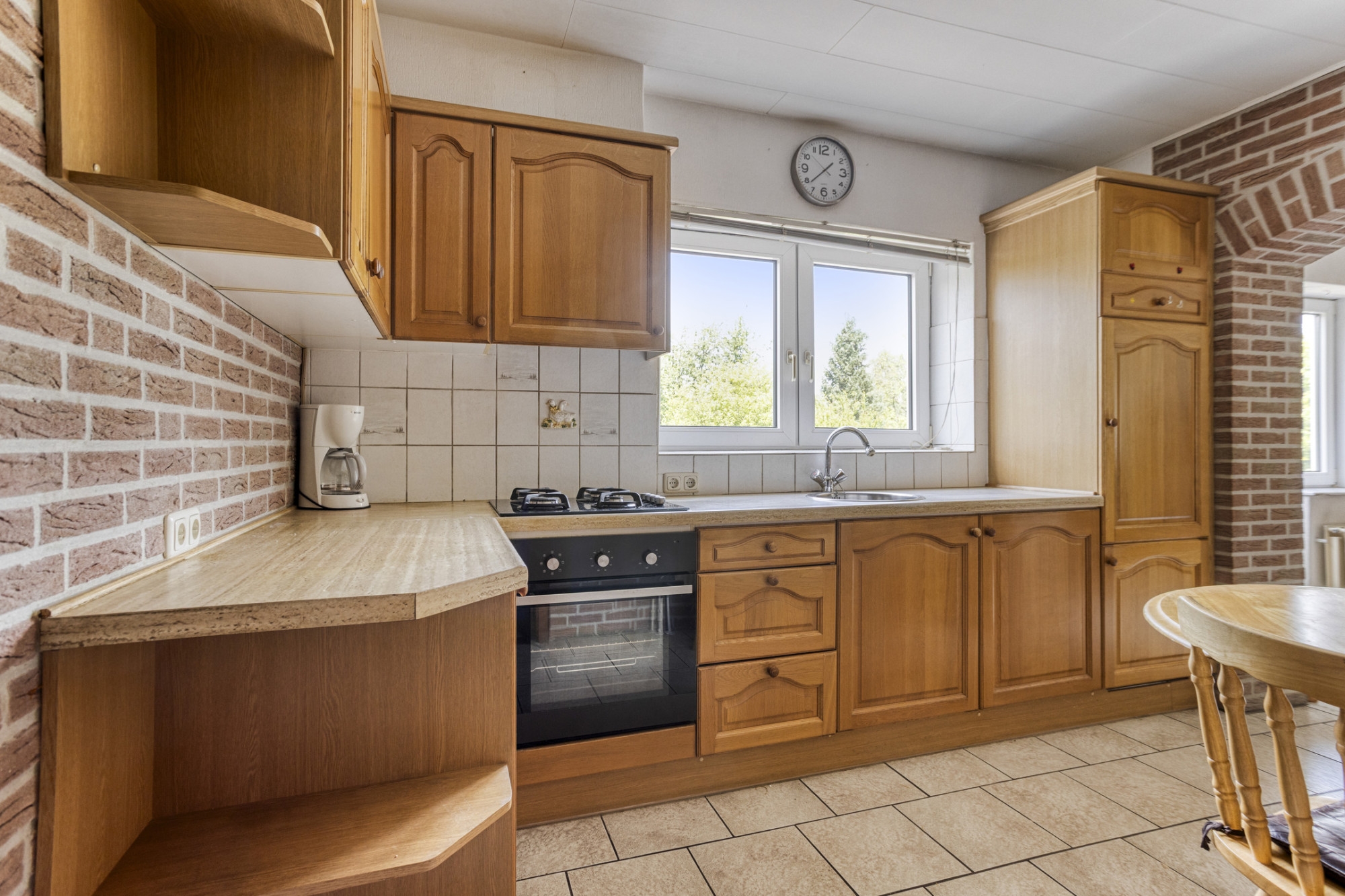 Half open keuken (4.00 x 2.44 m) voorzien van eenvoudige keurige keuken inrichting met met diverse handige onder- en wandkasten en inbouwapparatuur te weten: 4 pits gaskookplaat, RVS afzuigkap, oven en koelkast.