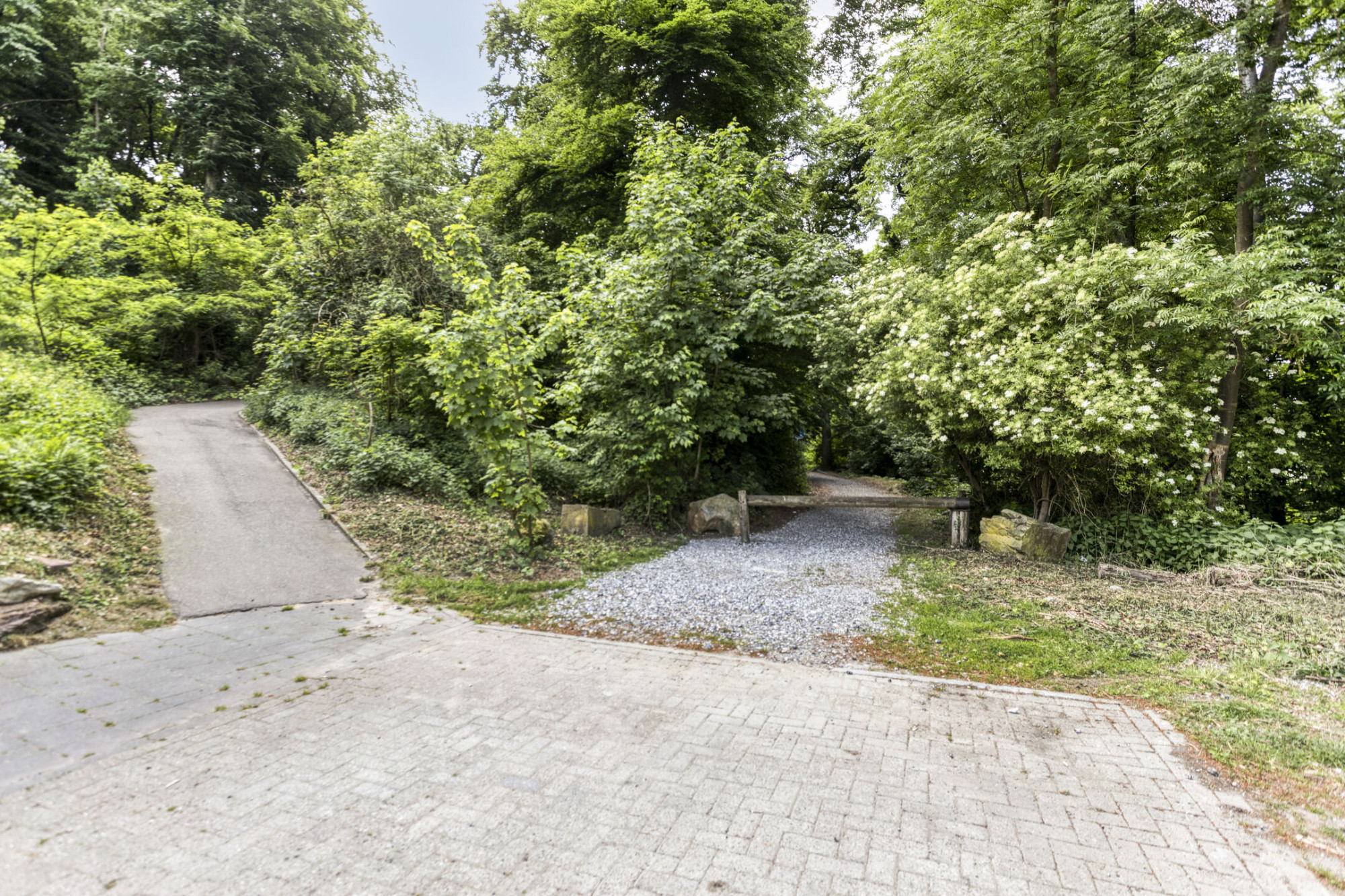 Voortuin met inrit naar ondergelegen achtertuin en garage.