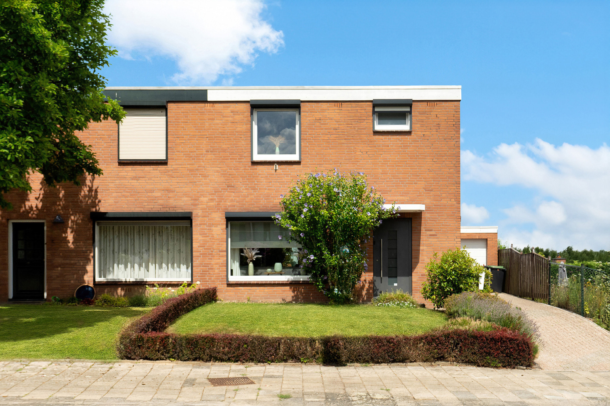 Groene voortuin met naastgelegen oprit (geschikt voor meerdere auto’s).