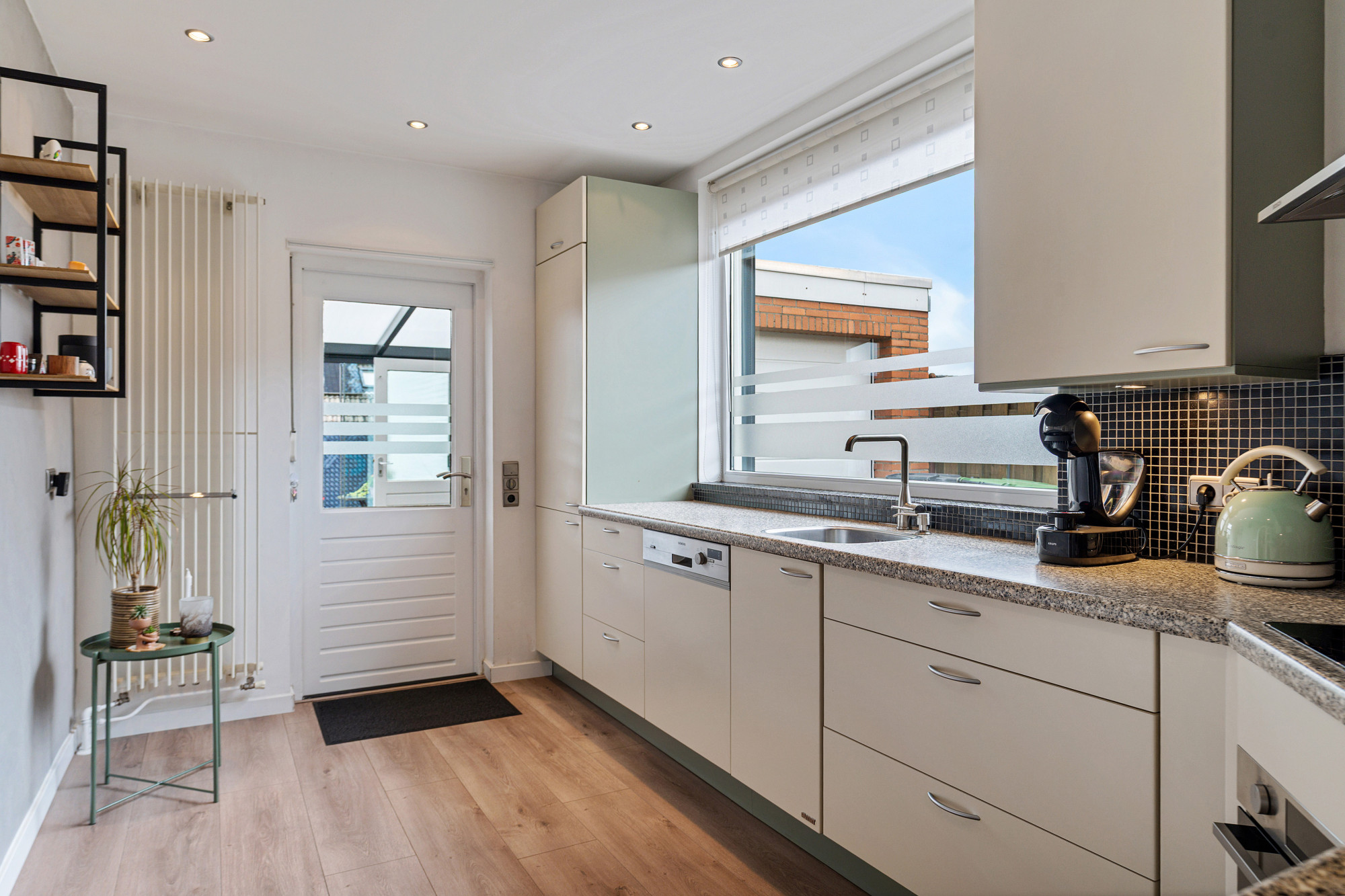 Entree met meterkast en toiletruimte met hangend closet en fonteintje. Woonkamer met veel lichtinval, airco en verdeeld in een eet en zitgedeelte. Halfopen keuken voorzien van moderne keukeninstallatie incl. apparatuur: keramische kookplaat, afzuigkap, magnetron, combi-oven (vernieuwd in 2024), koel-vriescombinatie (vernieuwd in 2021) en vaatwasser (vernieuwd in 2020).