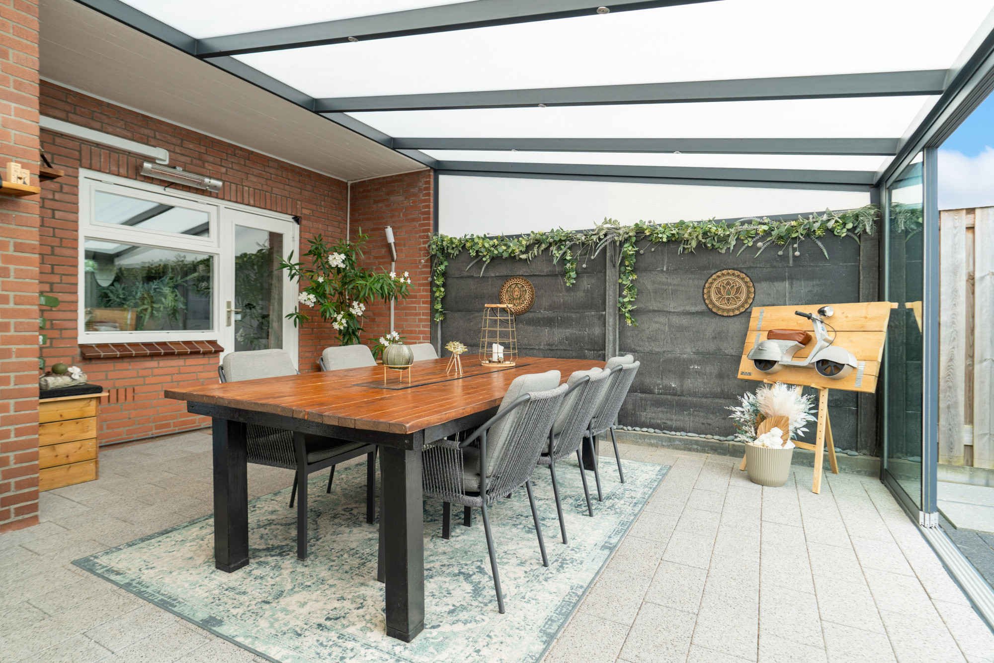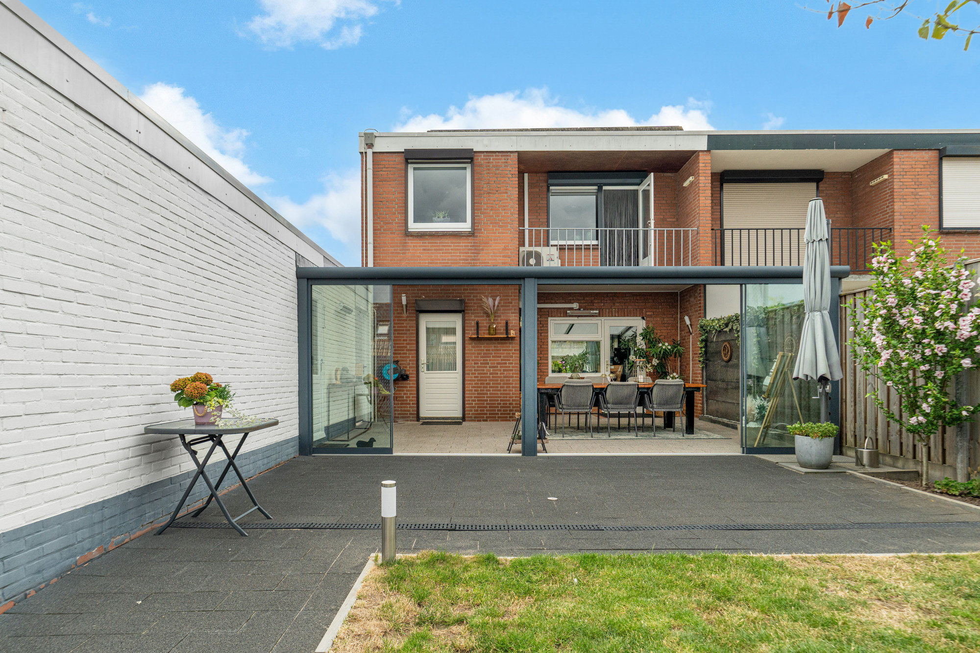 -Glazen schuifpuien in overkapping geplaatst.