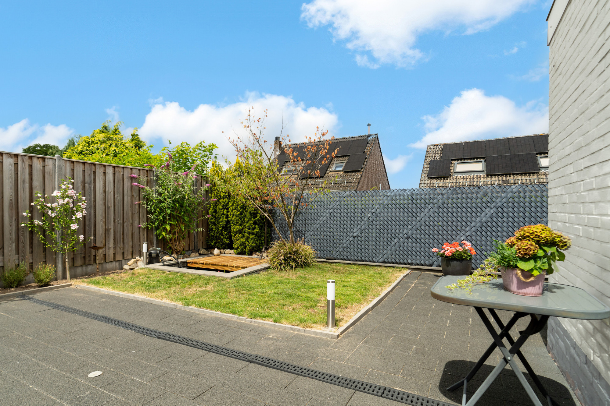 Geheel omsloten tuin met nieuwe schuttingen, vijver, gazon, en toegang tot garage en zij- ingang naar de oprit.