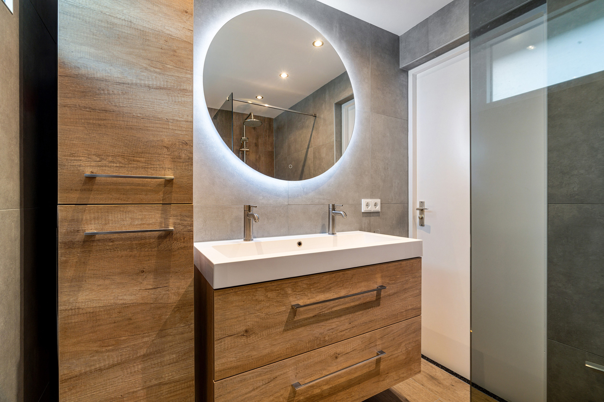 De luxe badkamer is ingericht met een inloopdouche, regendouche, toilet, wastafel in meubel en spiegel.