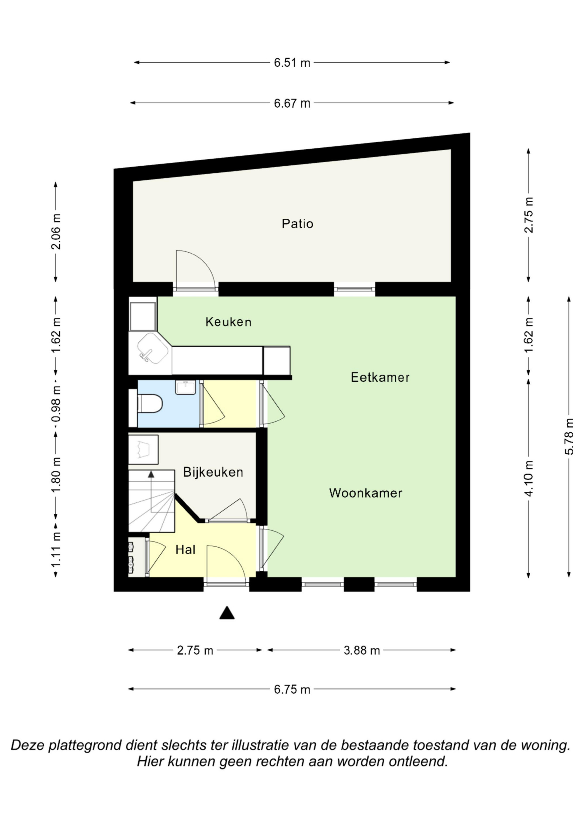 De entree- hal biedt toegang tot living, bijkeuken en trapopgang naar verdieping. De sfeervolle living (5,78 m x 3,88 m) heeft een open verbinding met de keuken en toegang tot halletje v.v. separate moderne toiletruimte. De half open keuken is v.v. de navolgende apparatuur: 4- pits elektrische kookplaat, oven, afzuigkap, vaatwasser en koel-vriescombinatie. Vanuit de keuken heeft men middels openslaande deur toegang tot de patio.