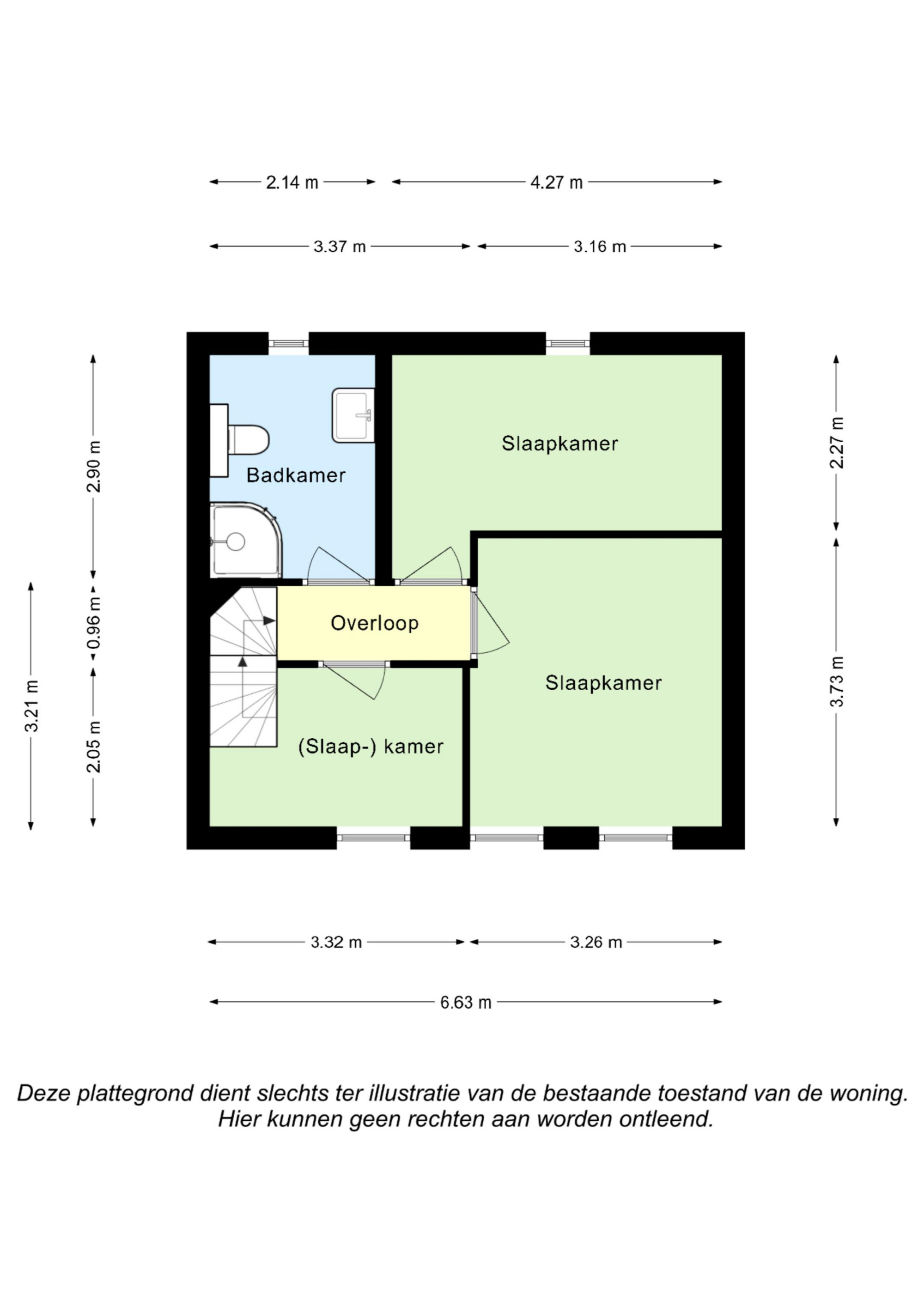 De overloop biedt toegang tot 3 slaapkamers en badkamer. Slaapkamer I (3,32 m x 2,05 m) en slaapkamer II (3,73 m x 3,26 m) zijn beide aan de voorzijde gelegen, vanuit slaapkamer heeft men toegang tot de trap naar 2e verdieping. Slaapkamer III (4,27 m x 2,27 m) aan de achterzijde gelegen. Geheel betegelde badkamer (2,90 m x 2,14 m) is v.v. een 2e toilet, douche en vaste wastafel.