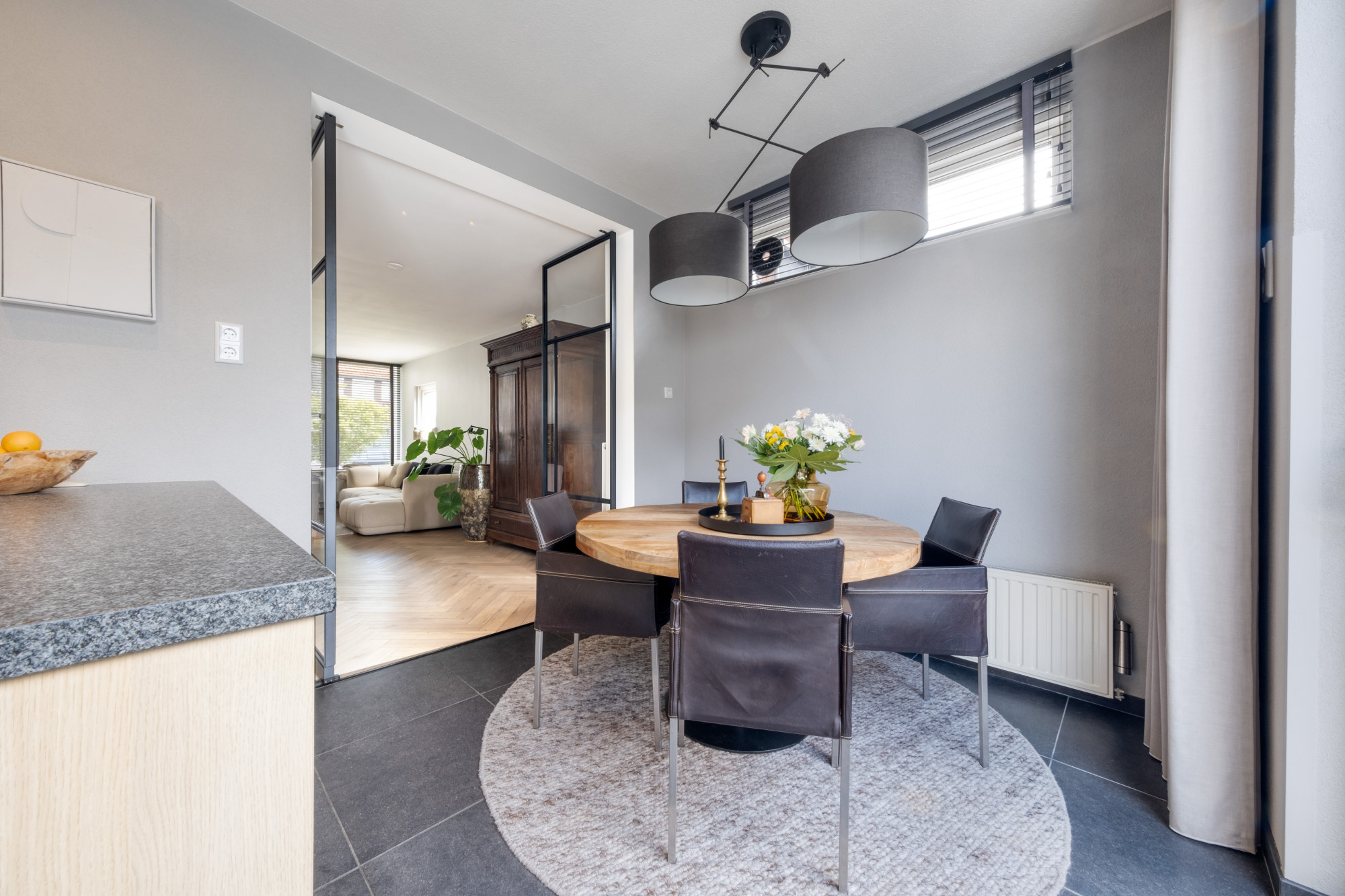 Entree/hal met toegang tot de meterkast, kelder en de woonkamer. De woonkamer is voorzien van een visgraat pvc-vloer en staat middels moderne stalen deuren in verbinding met de ruime keuken met eiland. De keuken is voorzien van een nette tegelvloer en beschikt over de navolgende apparatuur: spoelbak met heet water kraan, koelkast, 5-pits gaskookplaat, afzuigkap, vaatwasser en oven. Vanuit de keuken is de tuin via een schuifpui te bereiken.