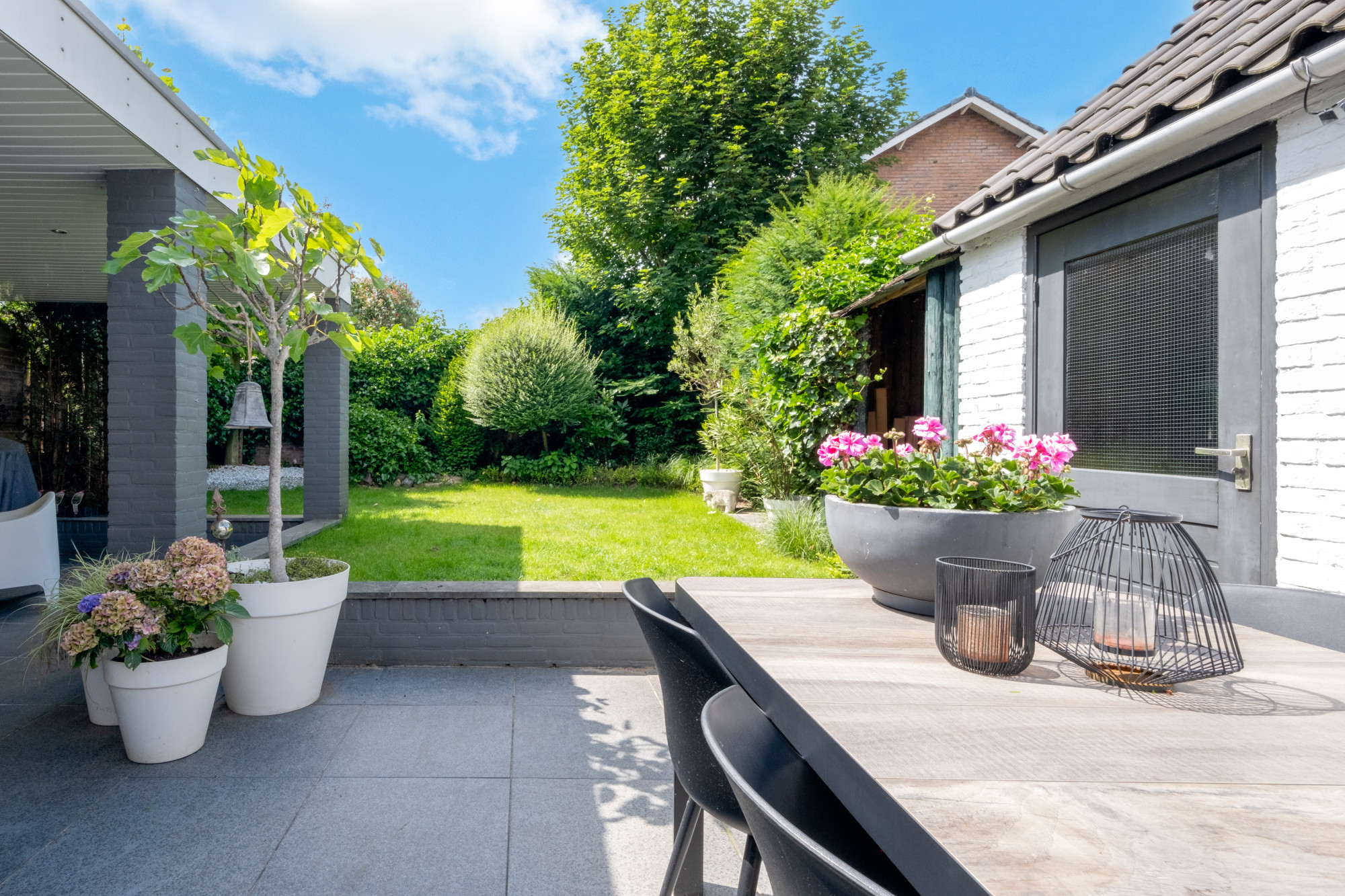Vanuit de keuken middels schuifpui is er toegang tot de tuin met volledige privacy. De voormalig garage is verbouwd tot overkapping. Daarnaast beschikt de tuin over een terras, gazon, borders, zijingang middels stalen poort en een tuinberging.