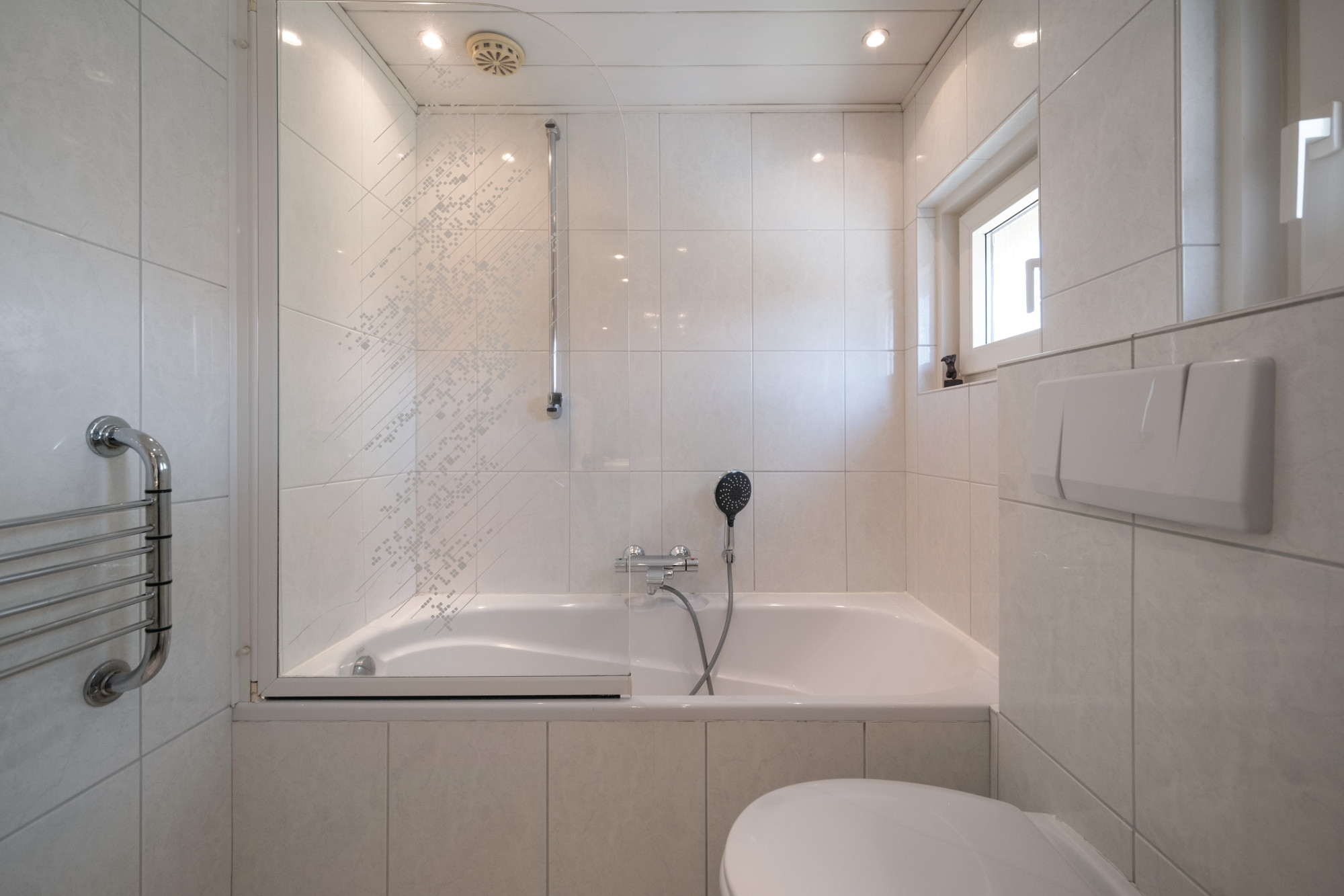 De badkamer is voorzien van een ligbad, tweede toilet en wastafel met meubel.