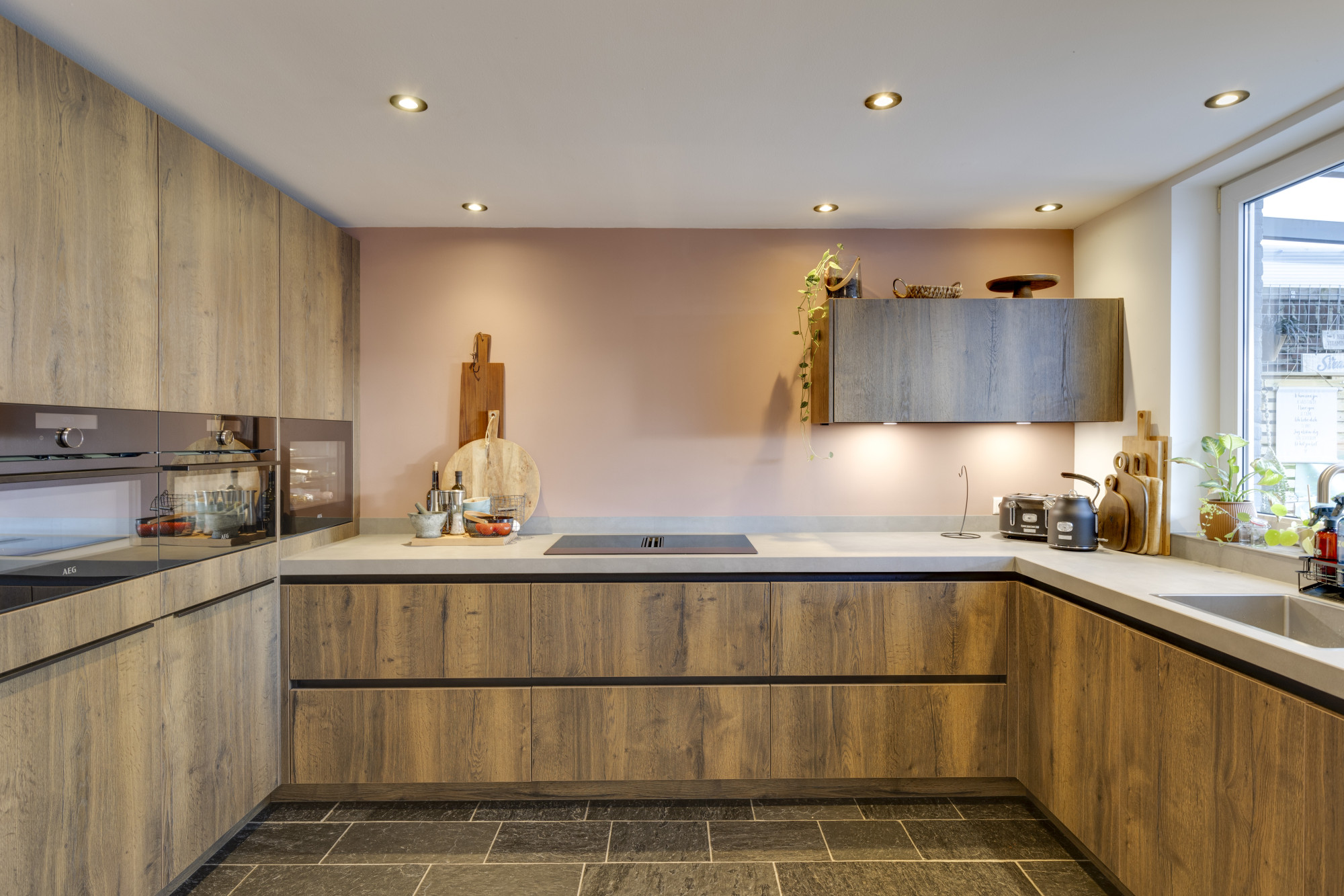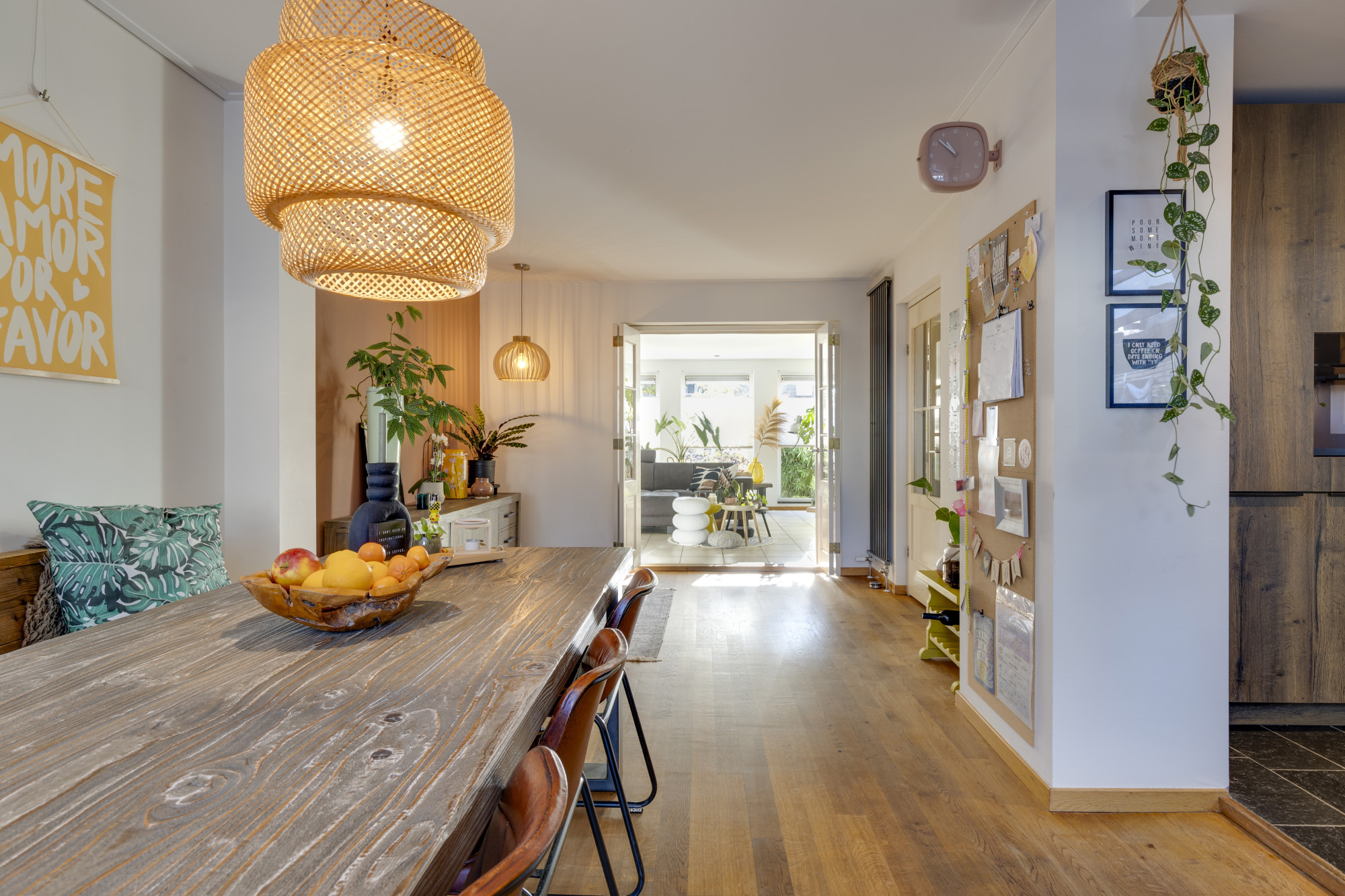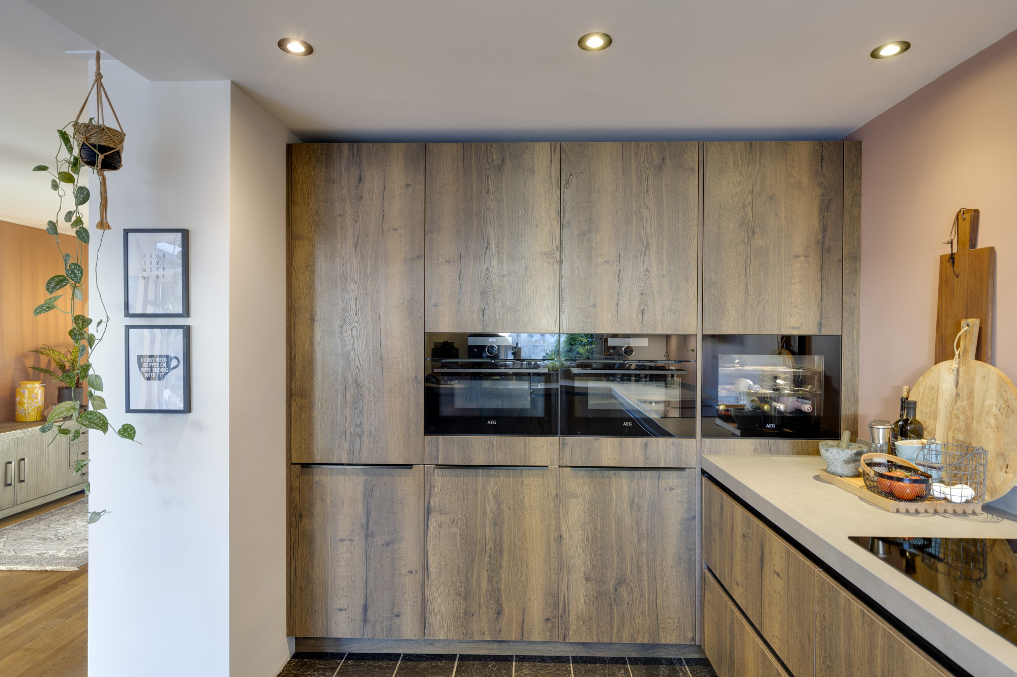 Bij binnenkomst betreedt u een ruime entree met toegang tot de moderne meterkast, uitgerust met krachtstroom en aansluitingen voor zonnepanelen, en een toiletruimte met hangcloset en fontein. De begane grond beschikt over een ruime woonkamer (23 m²) met tegelvloer, vloerverwarming en een spanplafond, die verbonden is middels ensuite deuren met een gezellige eetkamer (22 m²) voorzien van een eiken parketvloer en openslaande deuren naar de achtertuin. De aangrenzende U-vormige keuken (2022, 10 m²) is modern ingericht met diverse hoogwaardige inbouwapparatuur, waaronder een inductiekookplaat met geïntegreerde afzuiging, vaatwasser, twee combi-ovens, wijnkoeler, en koelkast.