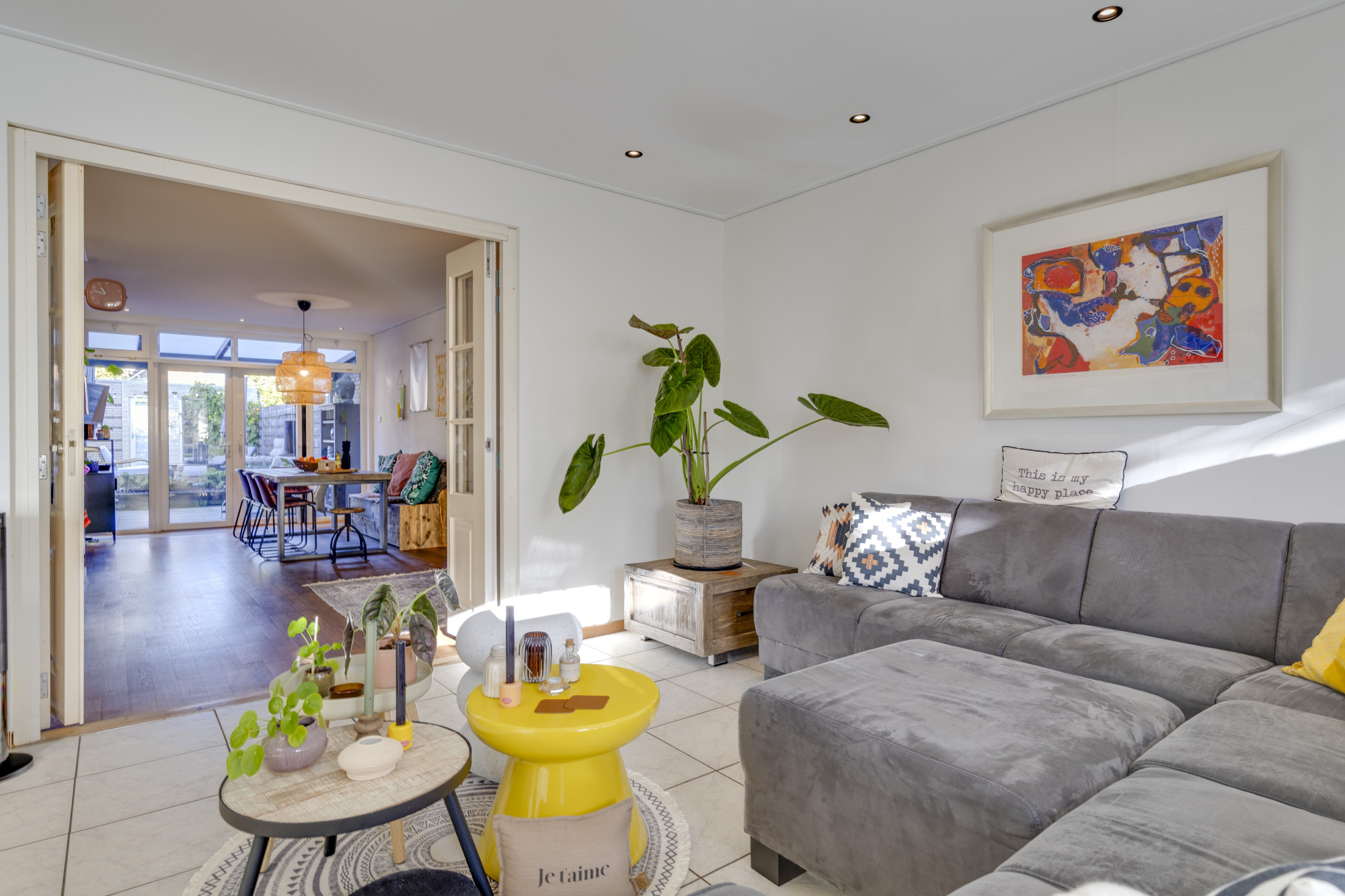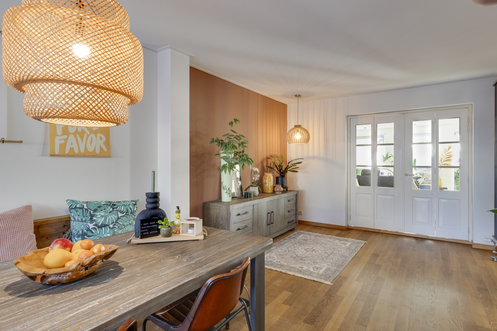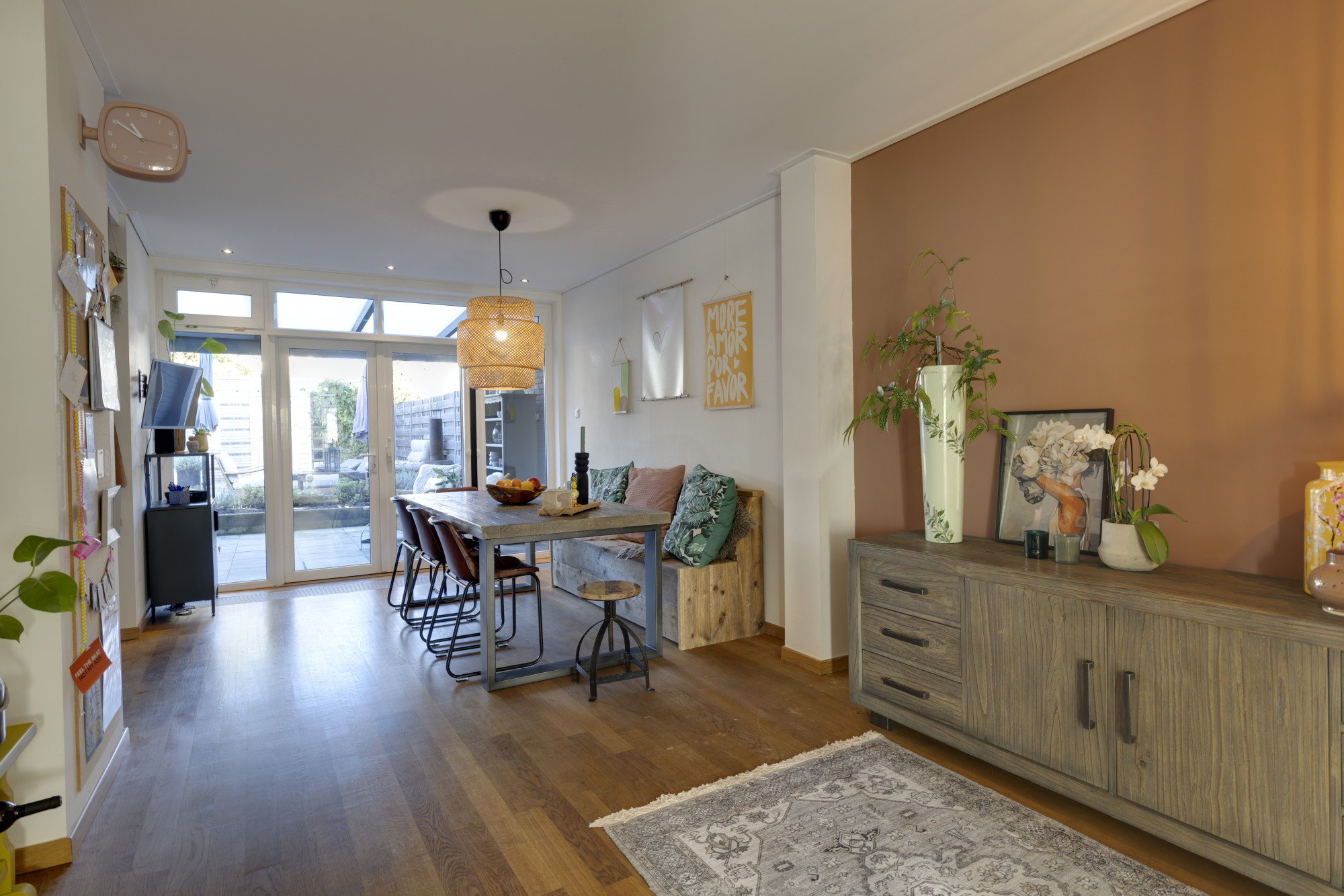 Bij binnenkomst betreedt u een ruime entree met toegang tot de moderne meterkast, uitgerust met krachtstroom en aansluitingen voor zonnepanelen, en een toiletruimte met hangcloset en fontein. De begane grond beschikt over een ruime woonkamer (23 m²) met tegelvloer, vloerverwarming en een spanplafond, die verbonden is middels ensuite deuren met een gezellige eetkamer (22 m²) voorzien van een eiken parketvloer en openslaande deuren naar de achtertuin. De aangrenzende U-vormige keuken (2022, 10 m²) is modern ingericht met diverse hoogwaardige inbouwapparatuur, waaronder een inductiekookplaat met geïntegreerde afzuiging, vaatwasser, twee combi-ovens, wijnkoeler, en koelkast.