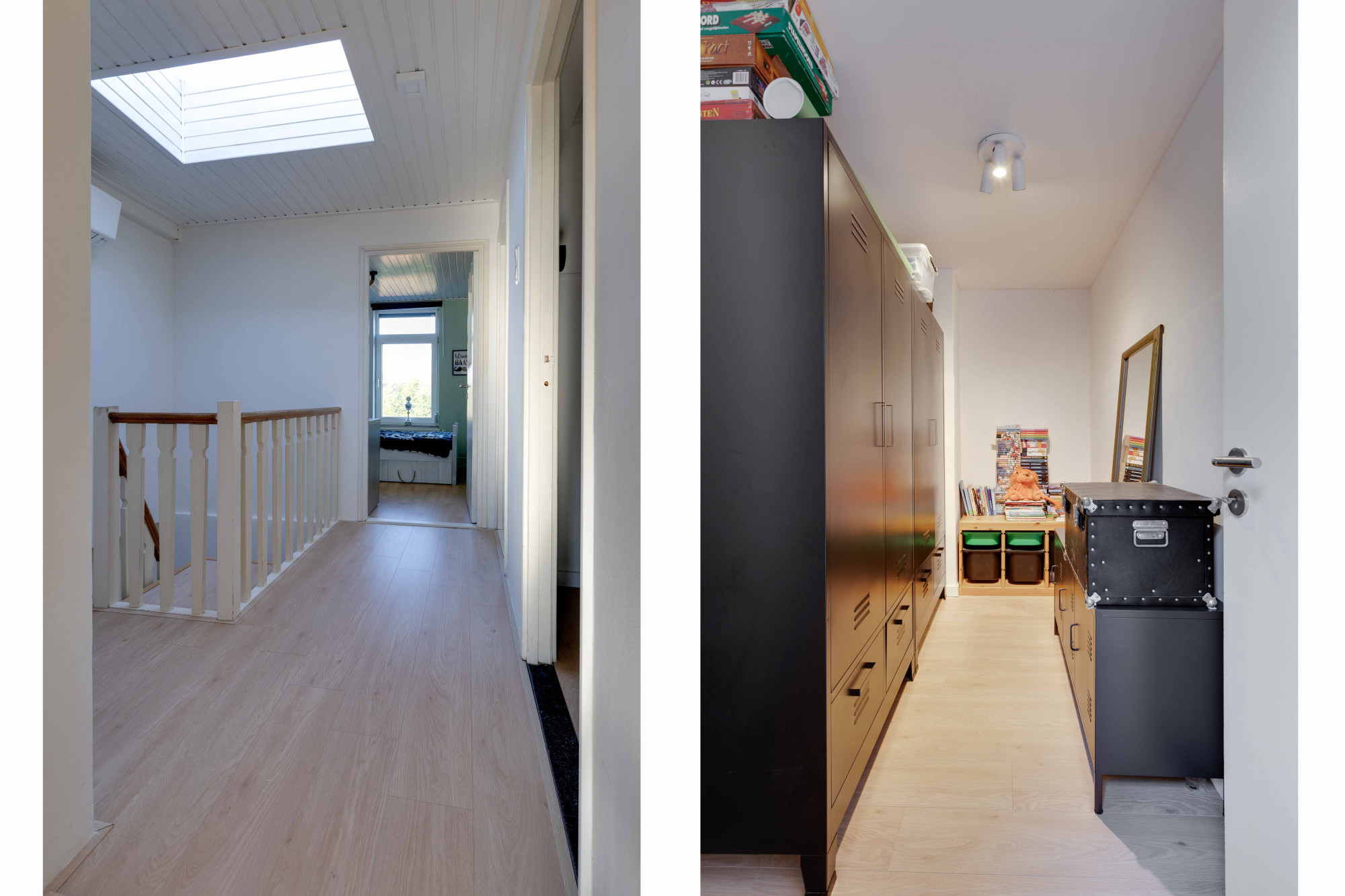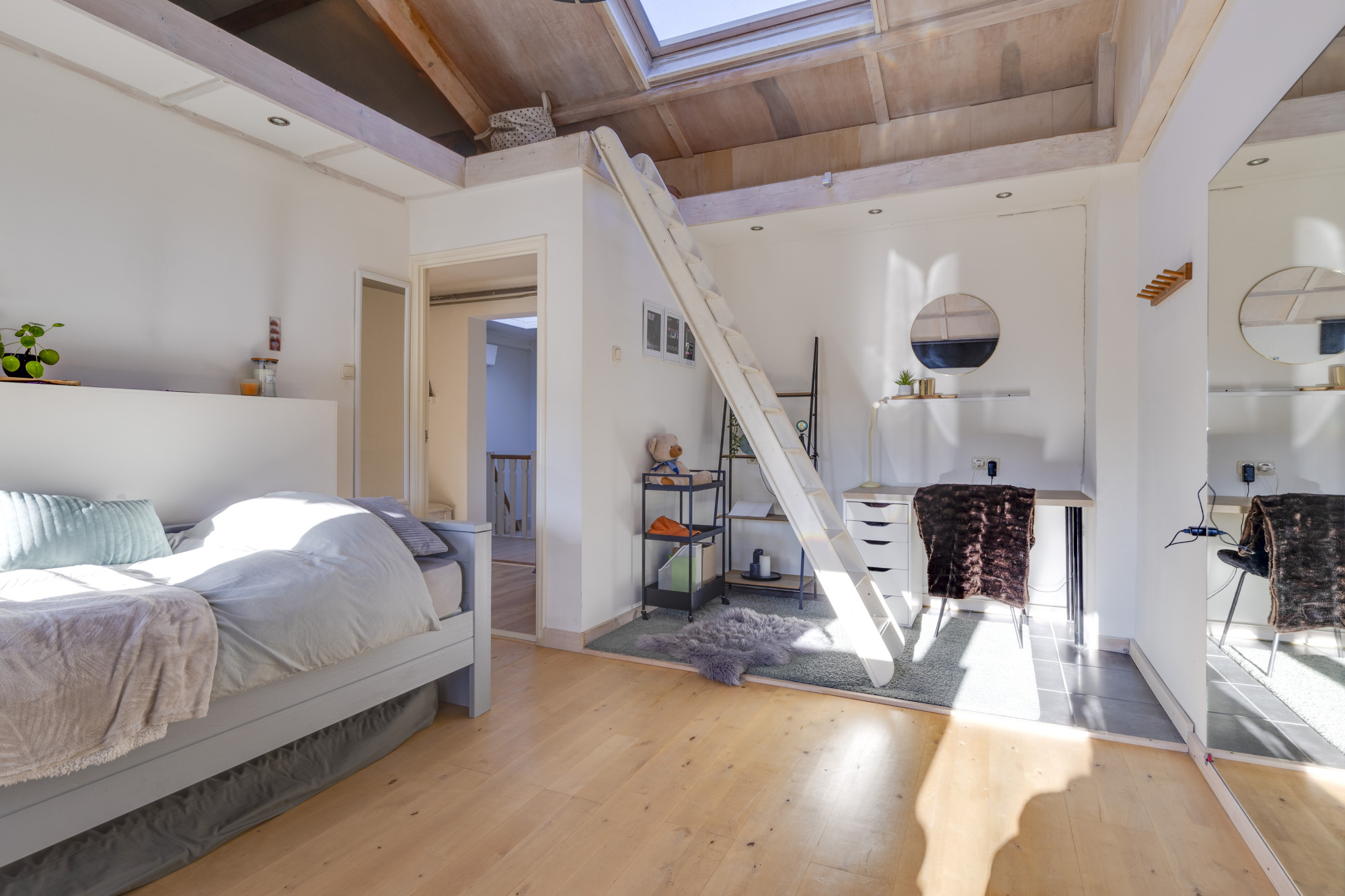 Op de tweede verdieping zijn nog eens vier slaapkamers aanwezig. Aan de achterzijde liggen slaapkamer 4 (14 m²) en slaapkamer 5 (7,5 m²), naast een extra bergruimte/inloopkast (5,5 m²). De hal biedt ruimte voor de CV-ketel (2021) en omvormers voor de zonnepanelen (11 panelen in 2018 en 5 panelen in 2021). Verder bevinden zich aan de voorzijde slaapkamer 6 (17 m²) met vide en een Velux dakraam, en slaapkamer 7 (7,5 m²). Het dak en de dakgoot zijn recentelijk vernieuwd.