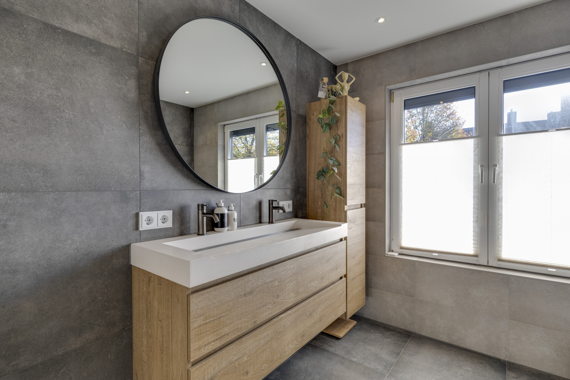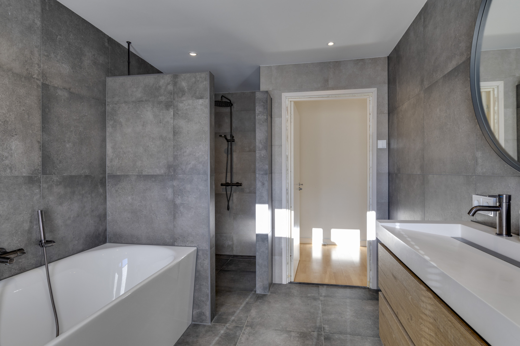 - De ruime badkamer (2022) (13 m²) is uitgerust met een tweepersoons ligbad, aparte inloopdouche, dubbele wastafel met meubel en vloerverwarming. Daarnaast is er een separaat modern toilet.