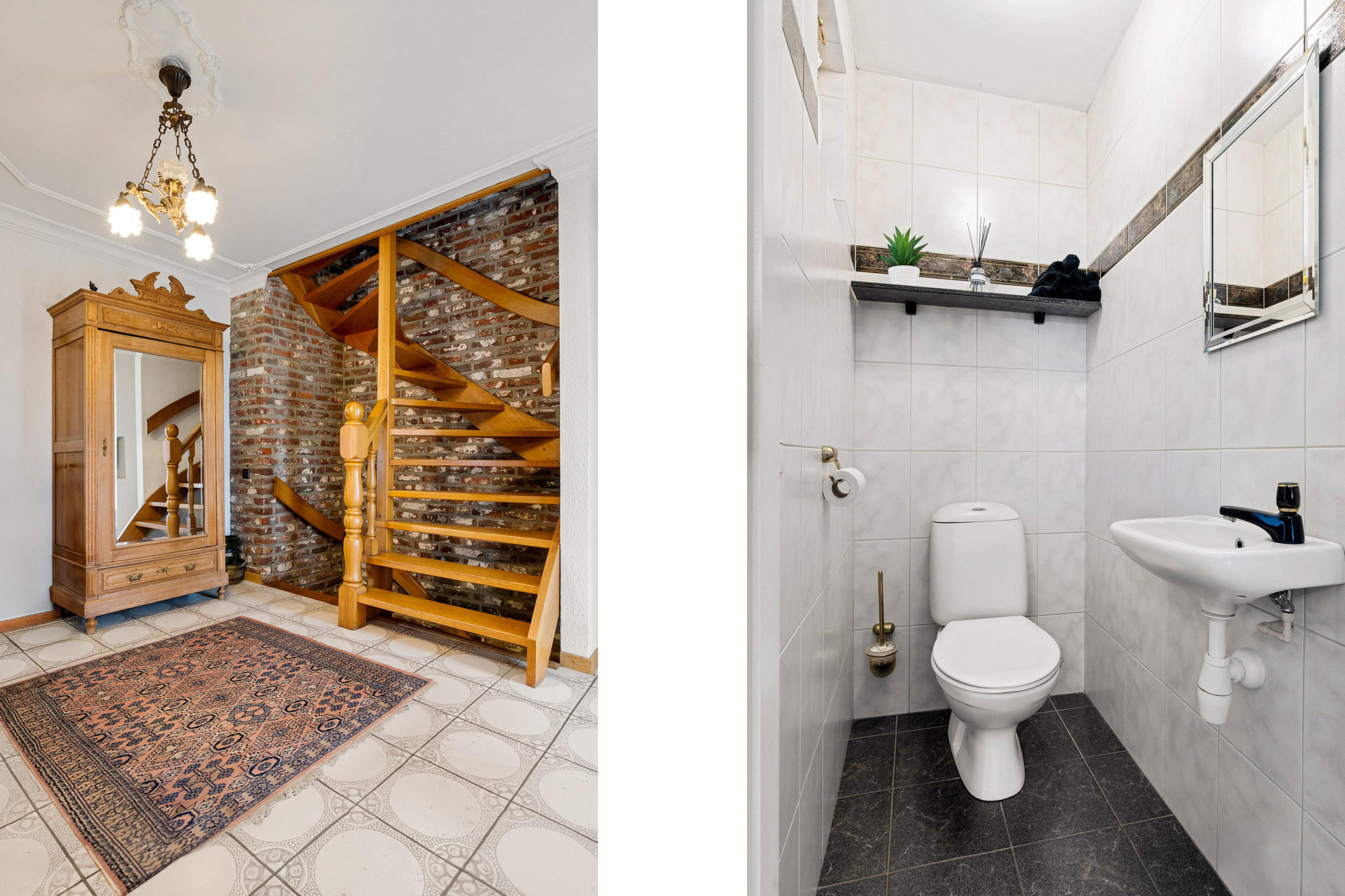 - Sfeervolle hal (3.44mx3.61m) met tegelvloer, volledig nieuwe meterkast en toilet met fonteintje.