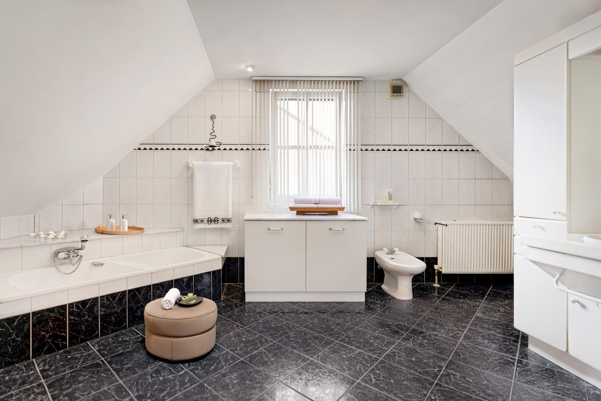 - Volledig betegelde riante badkamer (5.70mx3.60m), voorzien van een ligbad, 2 vaste wastafels en een 2e toilet en bidet.