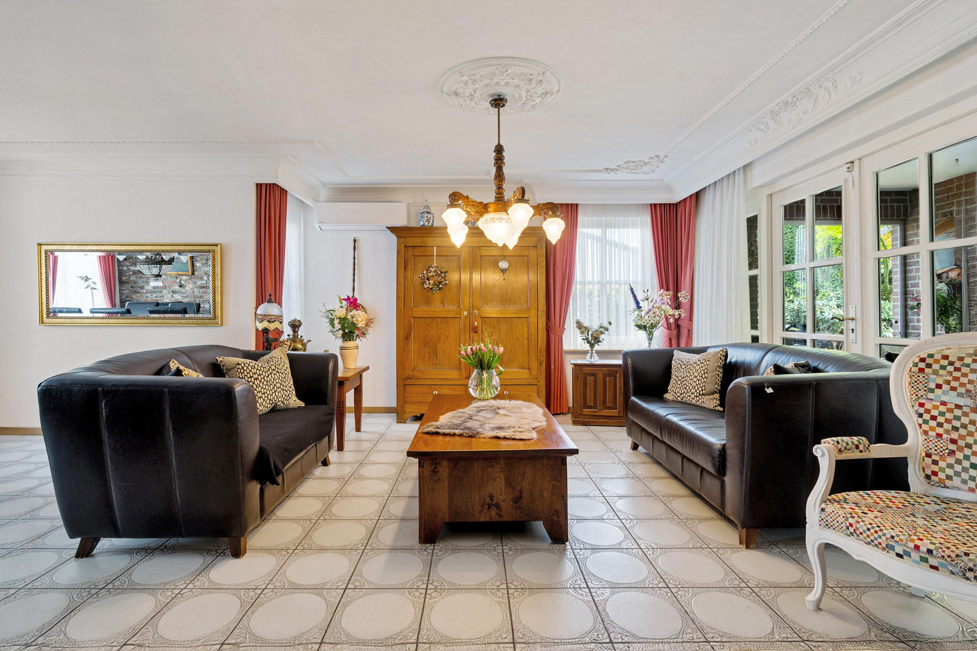- Royale L-woonkamer(9.08mx3.22mx8.63mx3.76m) airco, tegelvloer, mooi tuincontact naar serre(4.94mx4.84m), terras en tuin.