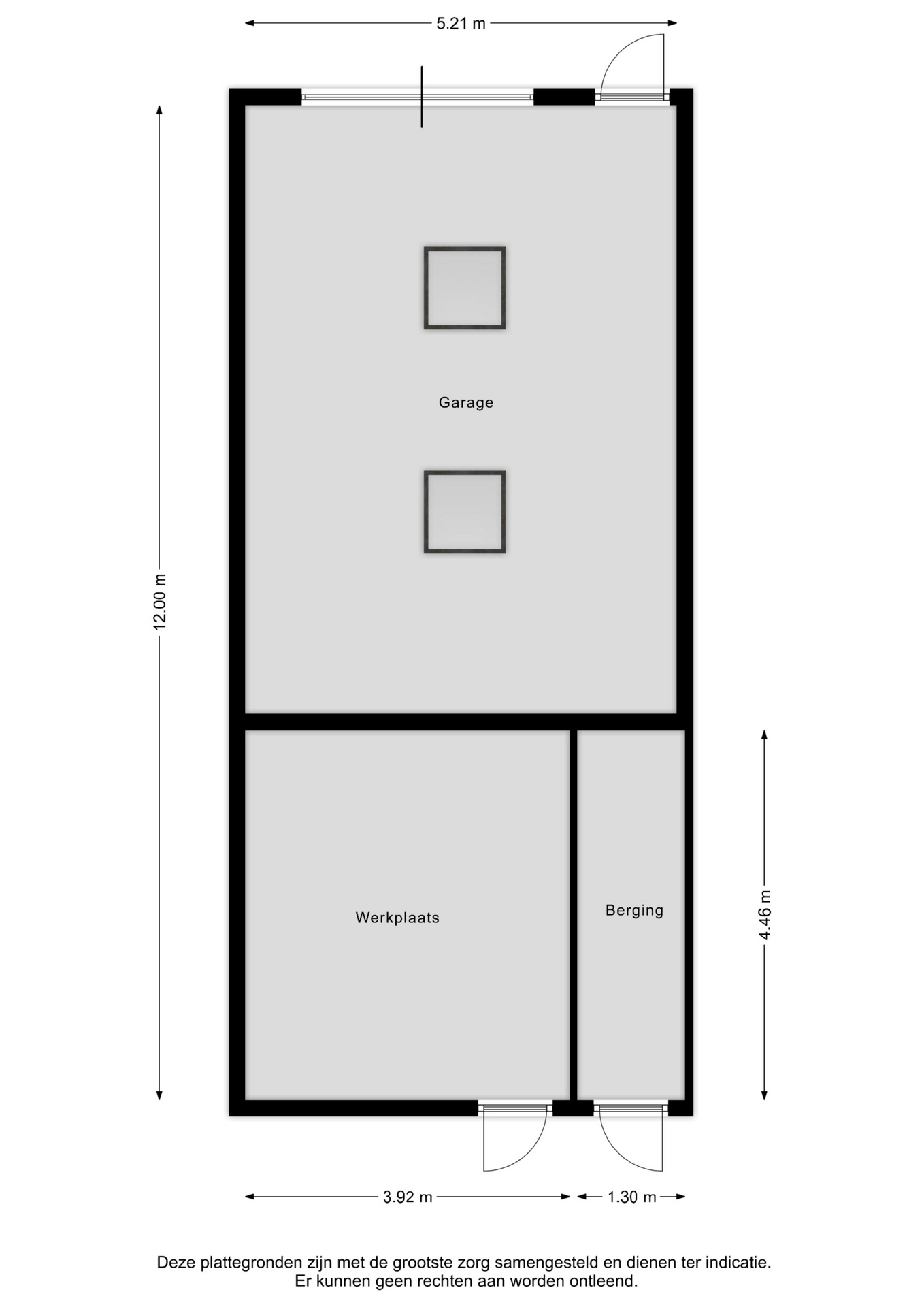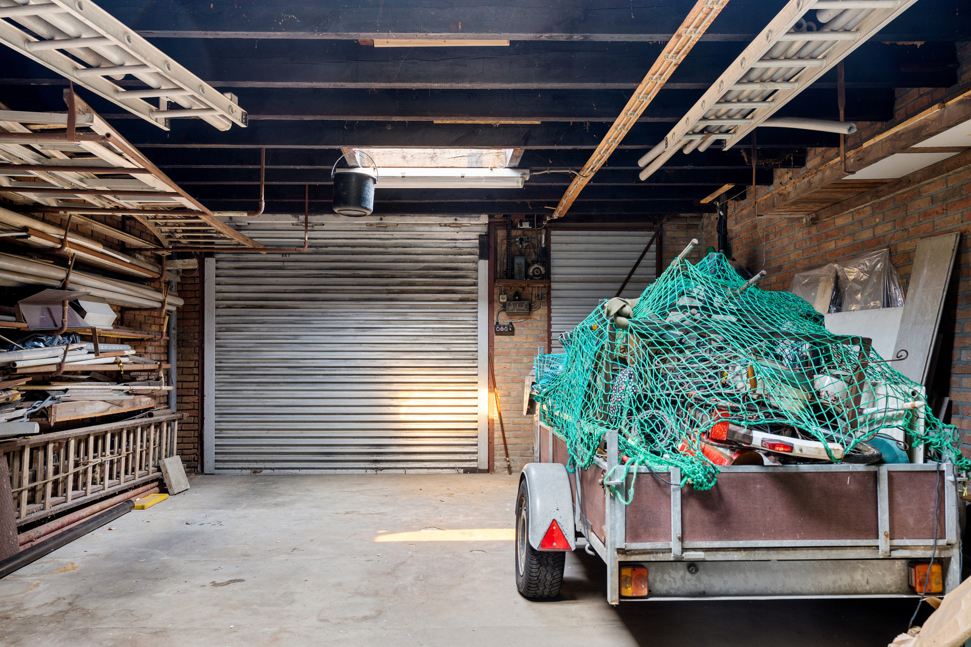 Achter de woning bevindt zich een zeer ruime, tweedelige garage met een elektrisch bedienbare aluminium rolpoort. De garage beschikt over eigen nutsvoorzieningen en biedt moeiteloos plaats aan minimaal twee auto's.