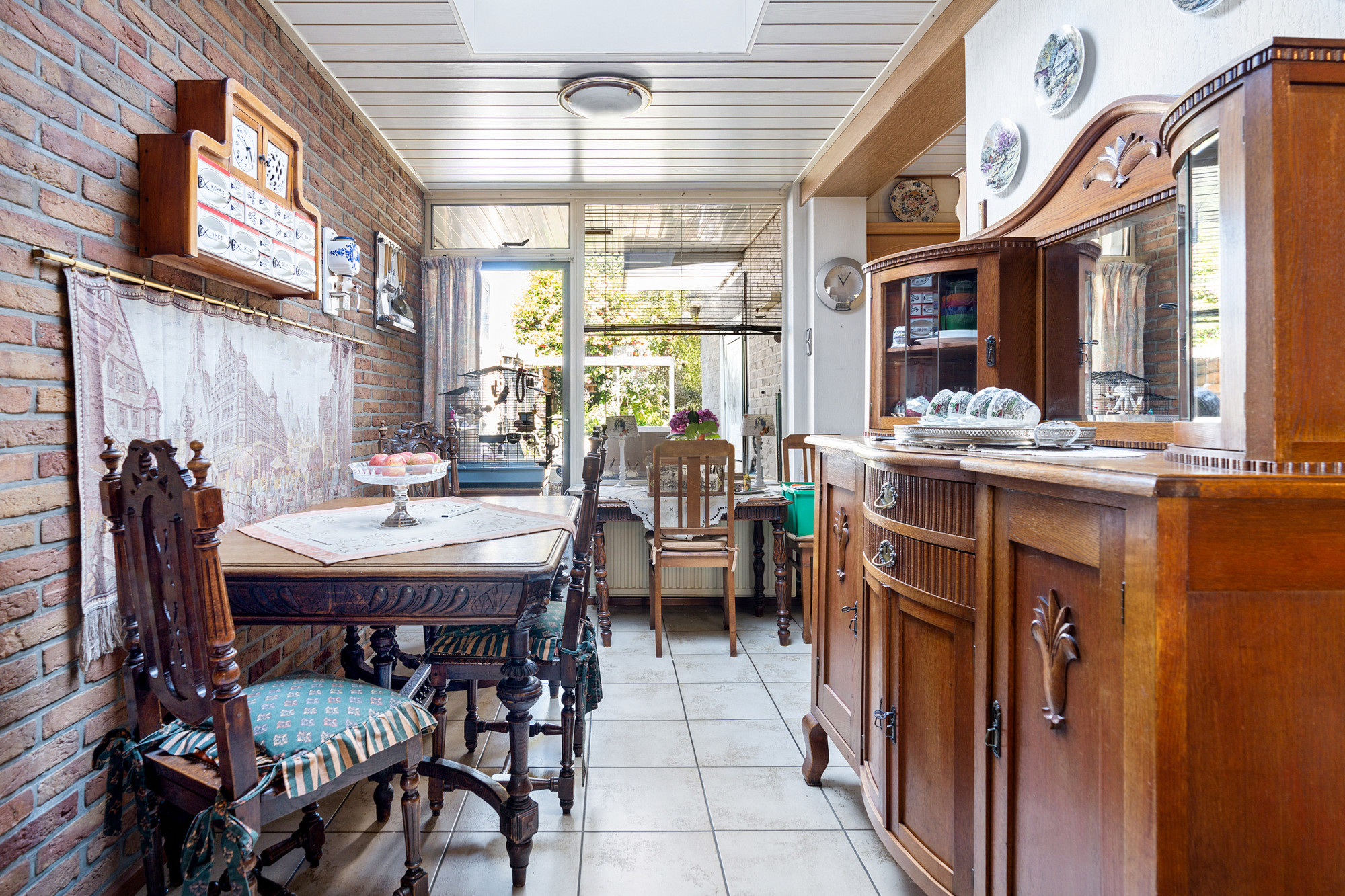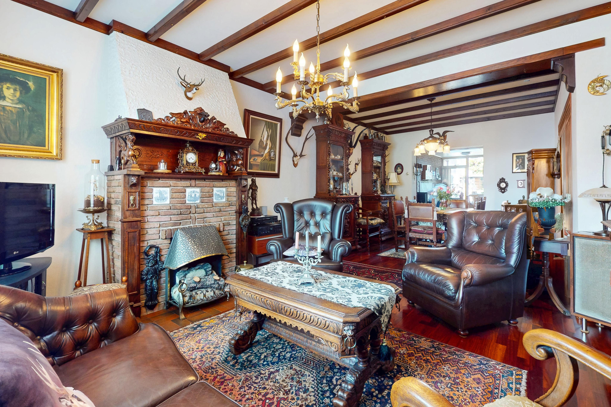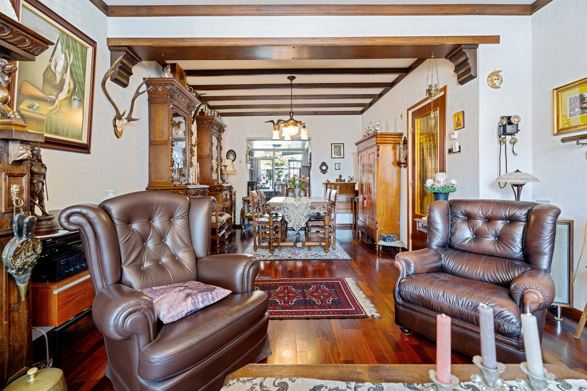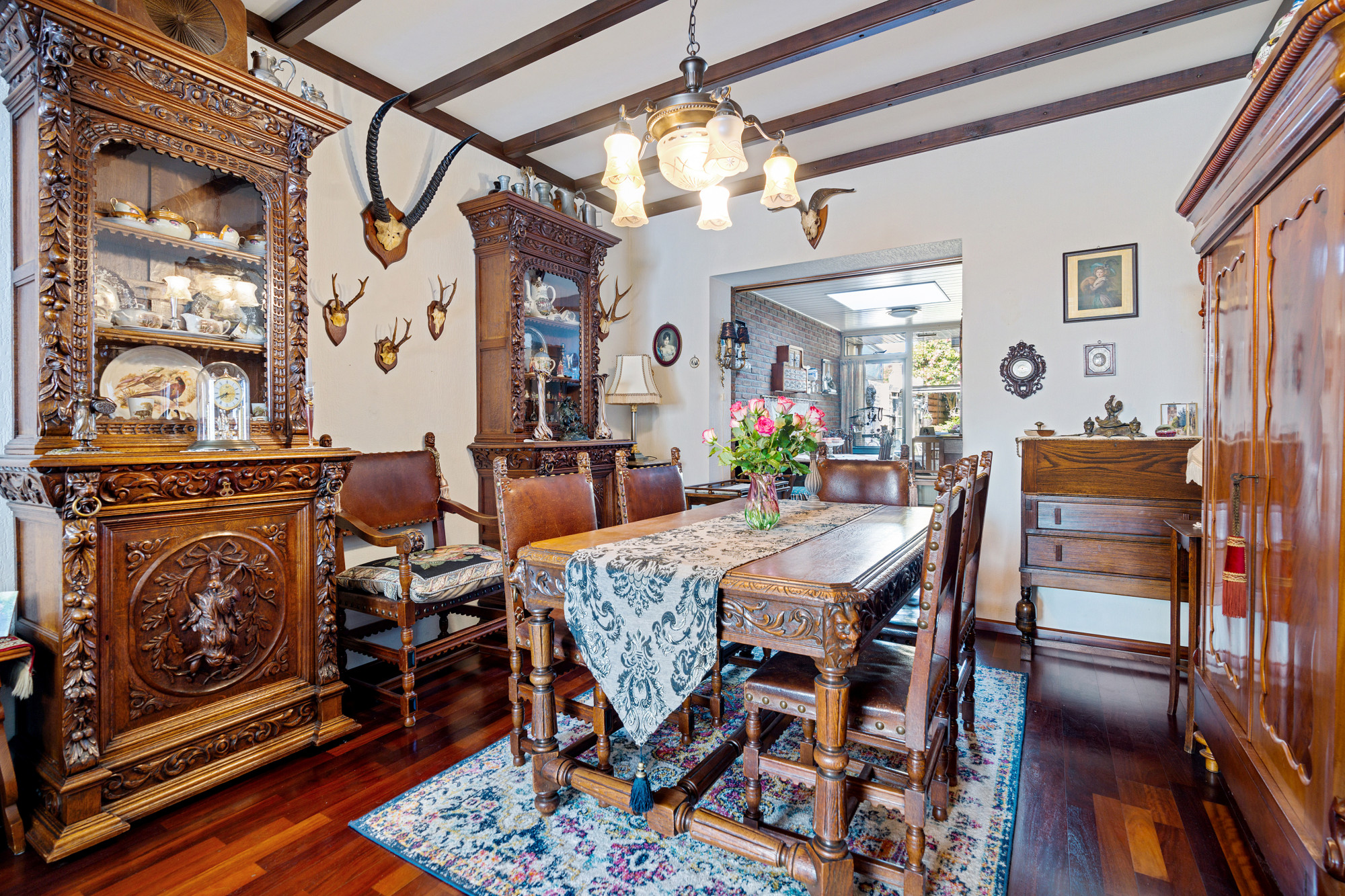 De mahoniehouten binnendeuren door het hele huis versterken de warme en klassieke sfeer.