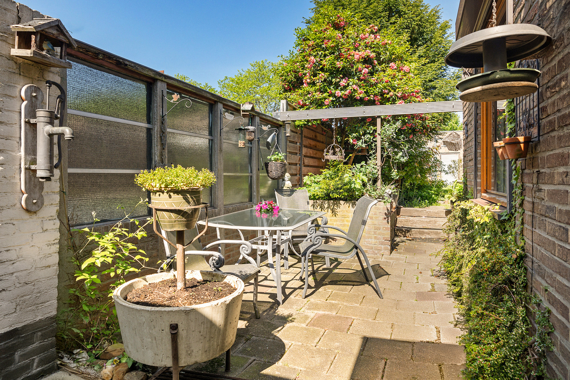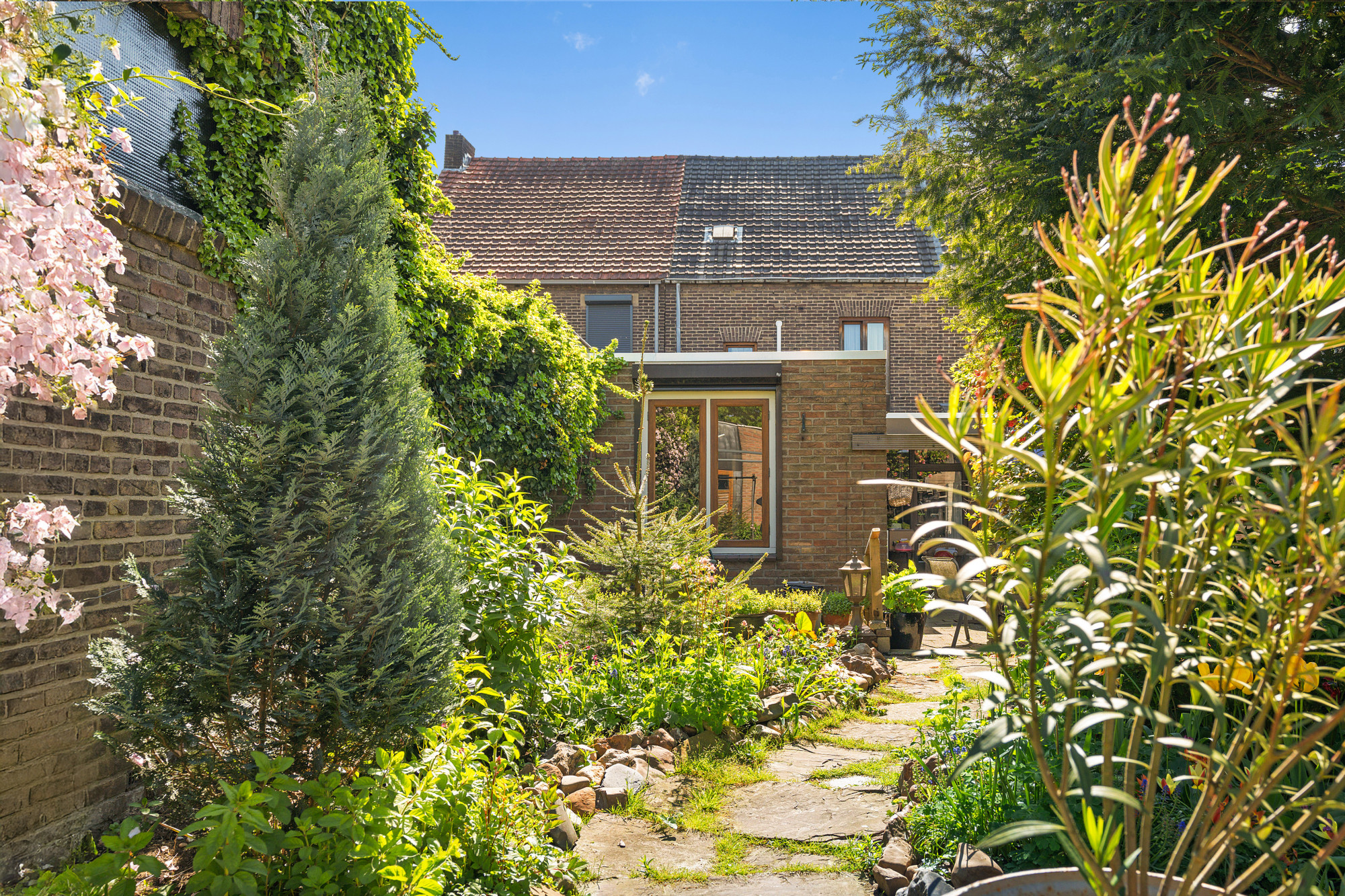 Sfeervolle en zonnige achtertuin met doorgang en toegang tot de garage.
