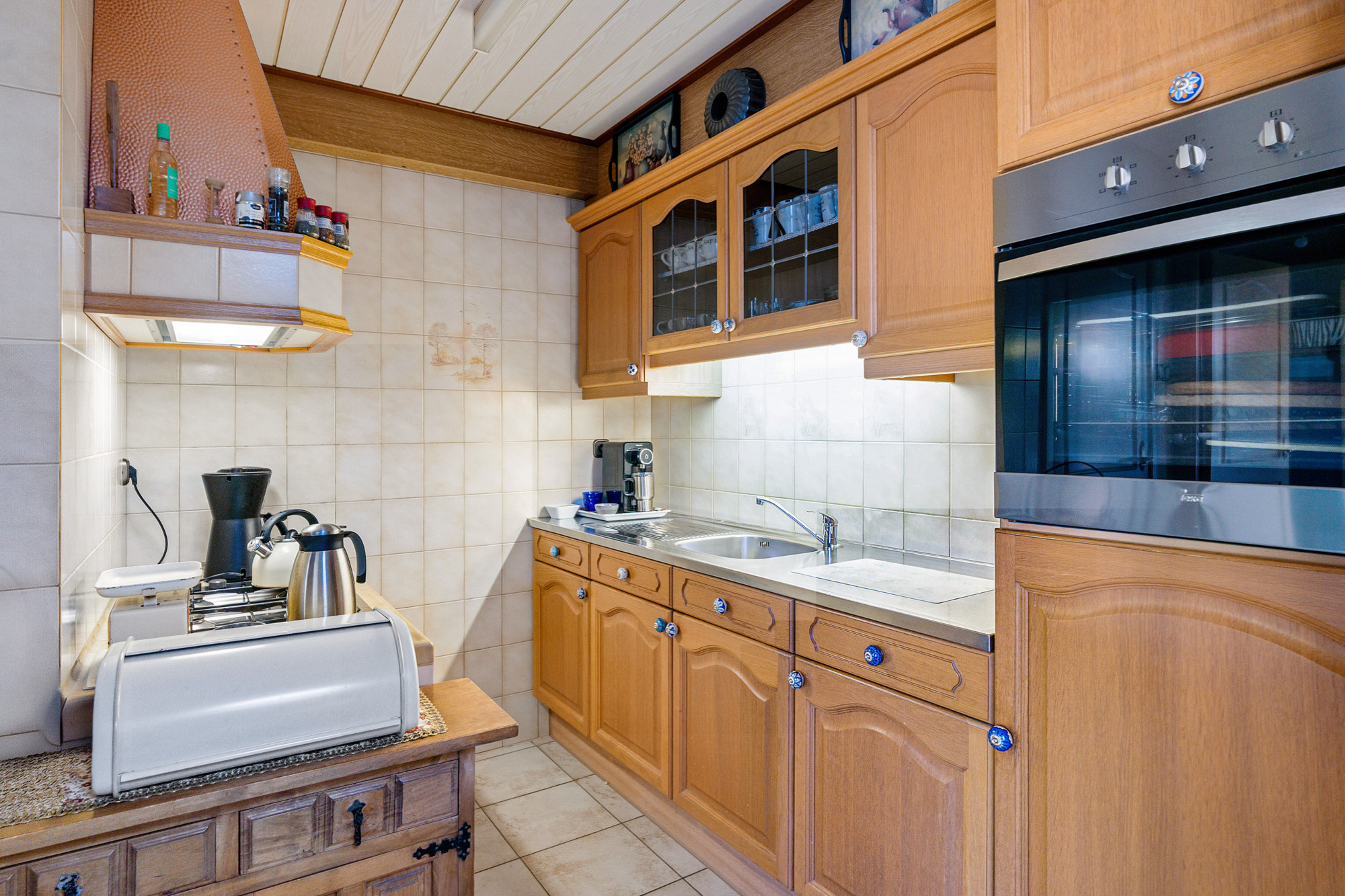 De halfopen keuken (tegelvloer met vloerverwarming) voorzien van een rechte keukenopstelling uitgerust met kookplaat, wasemkap, oven en koelkast.