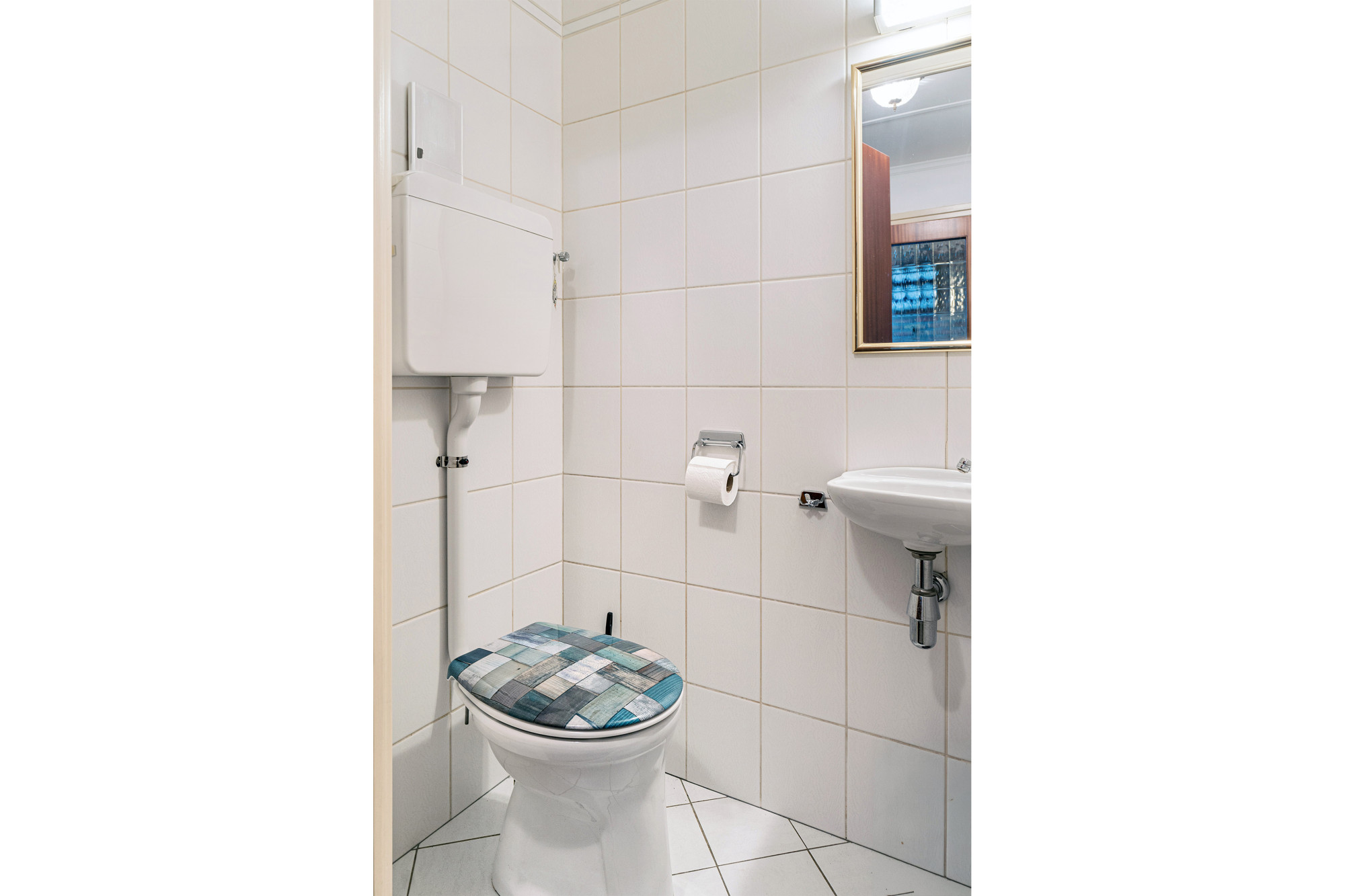 Hal met fraai Olmenhout trappenhuis en toilet.