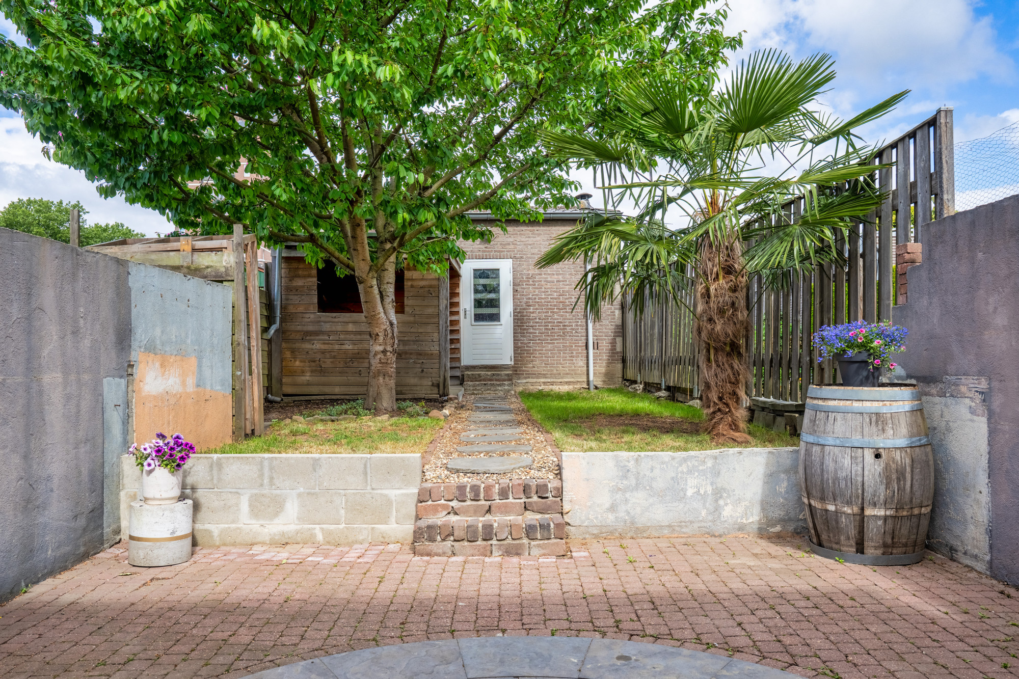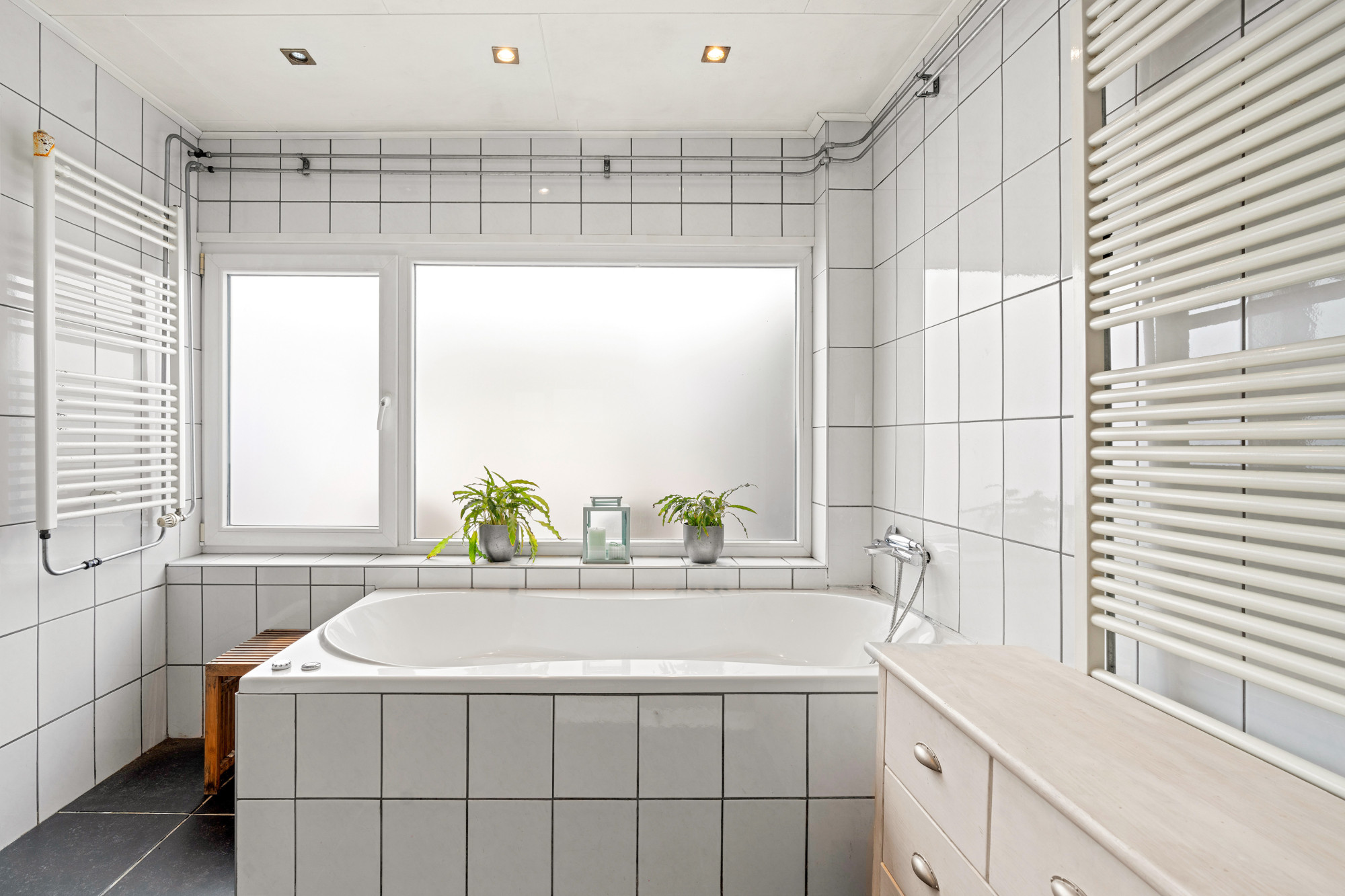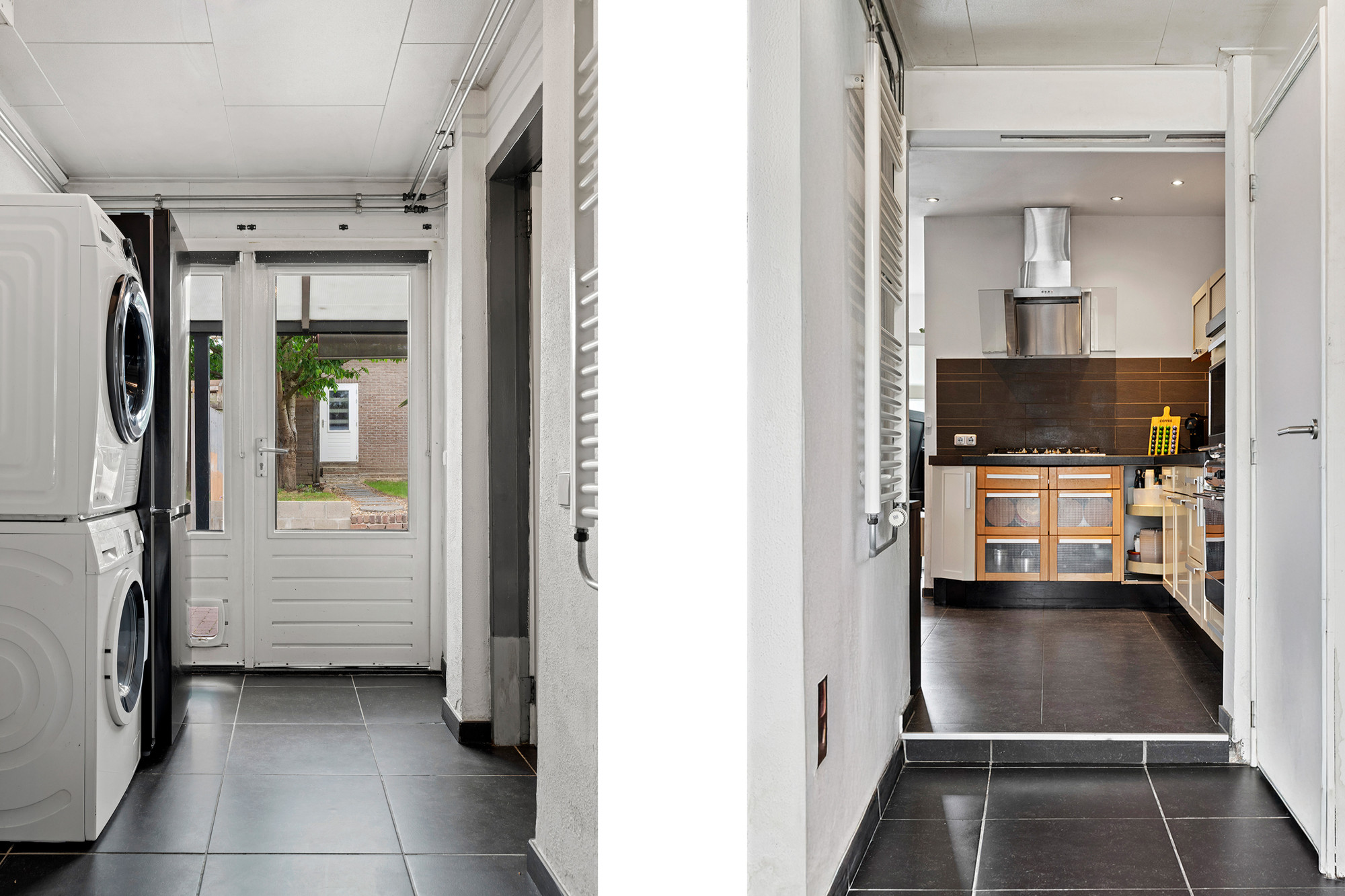 Aangrenzend ligt de praktische bijkeuken (ca. 3.65 x 1.83 m, hoogte ca. 2.10 m) met witgoedaansluitingen en CV-opstelling (HR-combiketel, Remeha). Vanuit de bijkeuken stap je zo het overdekte terras op, dat grenst aan de diepe achtertuin.