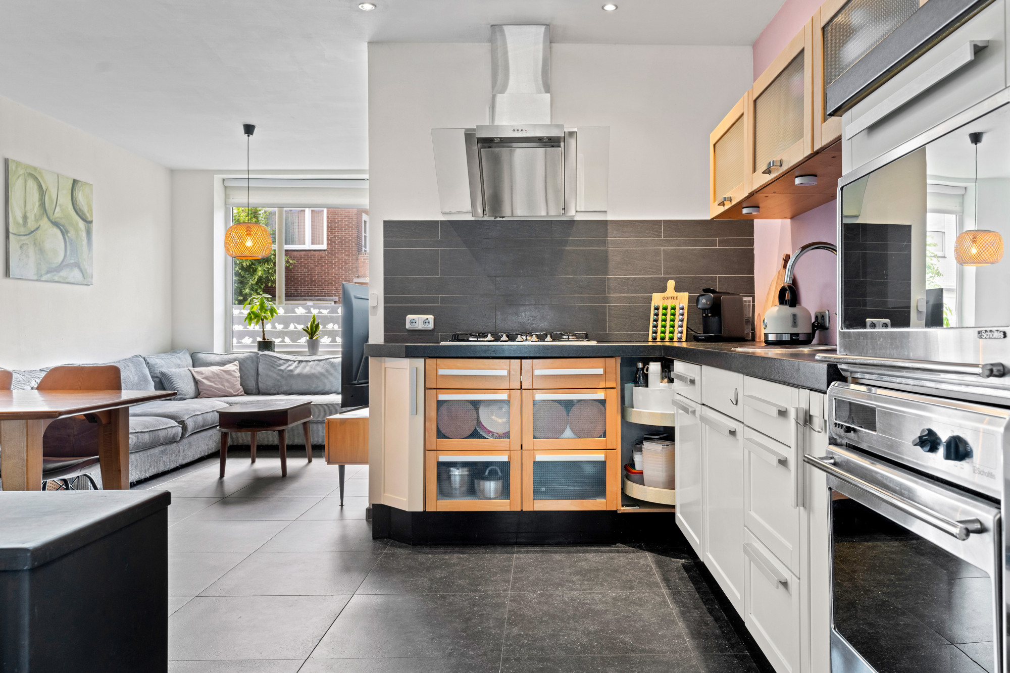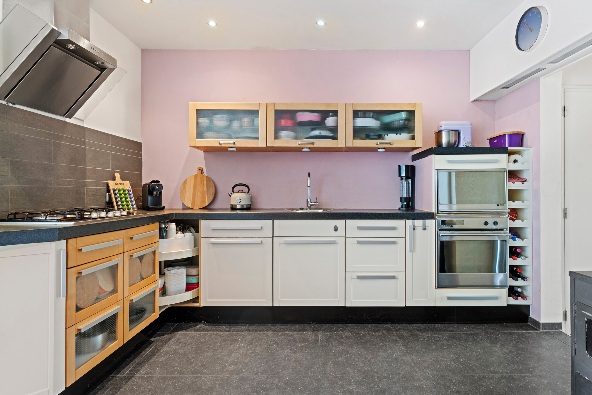 De open leefkeuken is strak ingericht en voorzien van moderne inbouwapparatuur: een 5-pits gaskookplaat, afzuigkap, heteluchtoven-magnetron, vaatwasser en veel bergruimte in de vaste kastenwand.