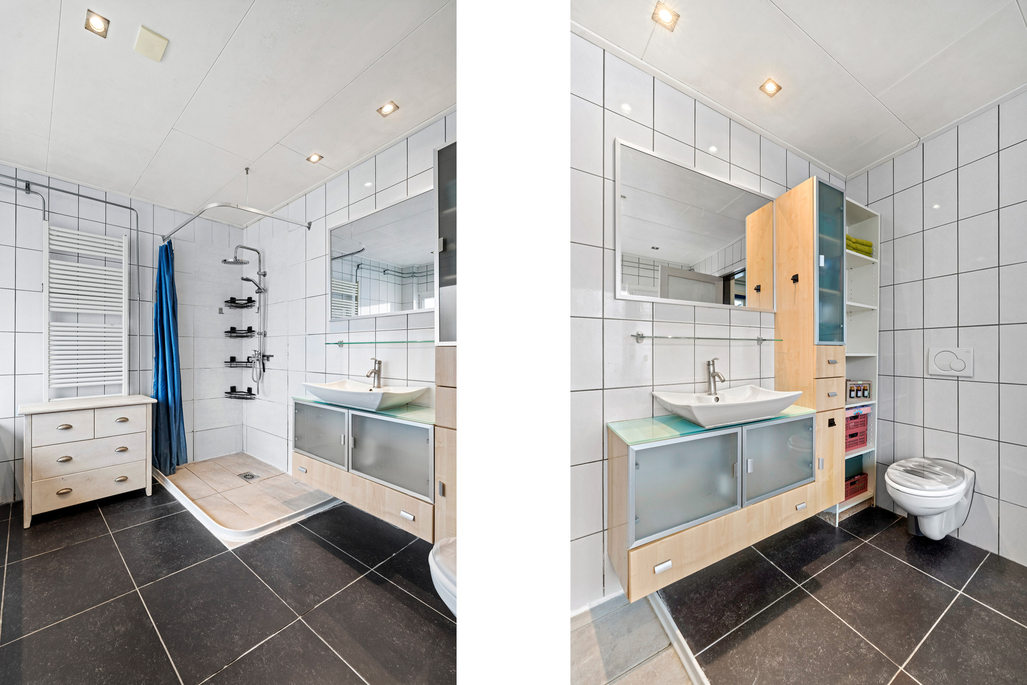 De moderne, geheel betegelde badkamer (ca. 3.16 x 2.68 m, hoogte ca. 2.25 m) is uitgerust met een kunststof ligbad, een ruime inloopdouche, een wastafelmeubel en toilet.