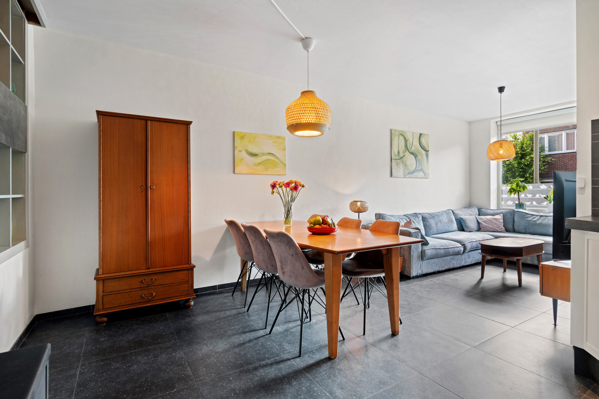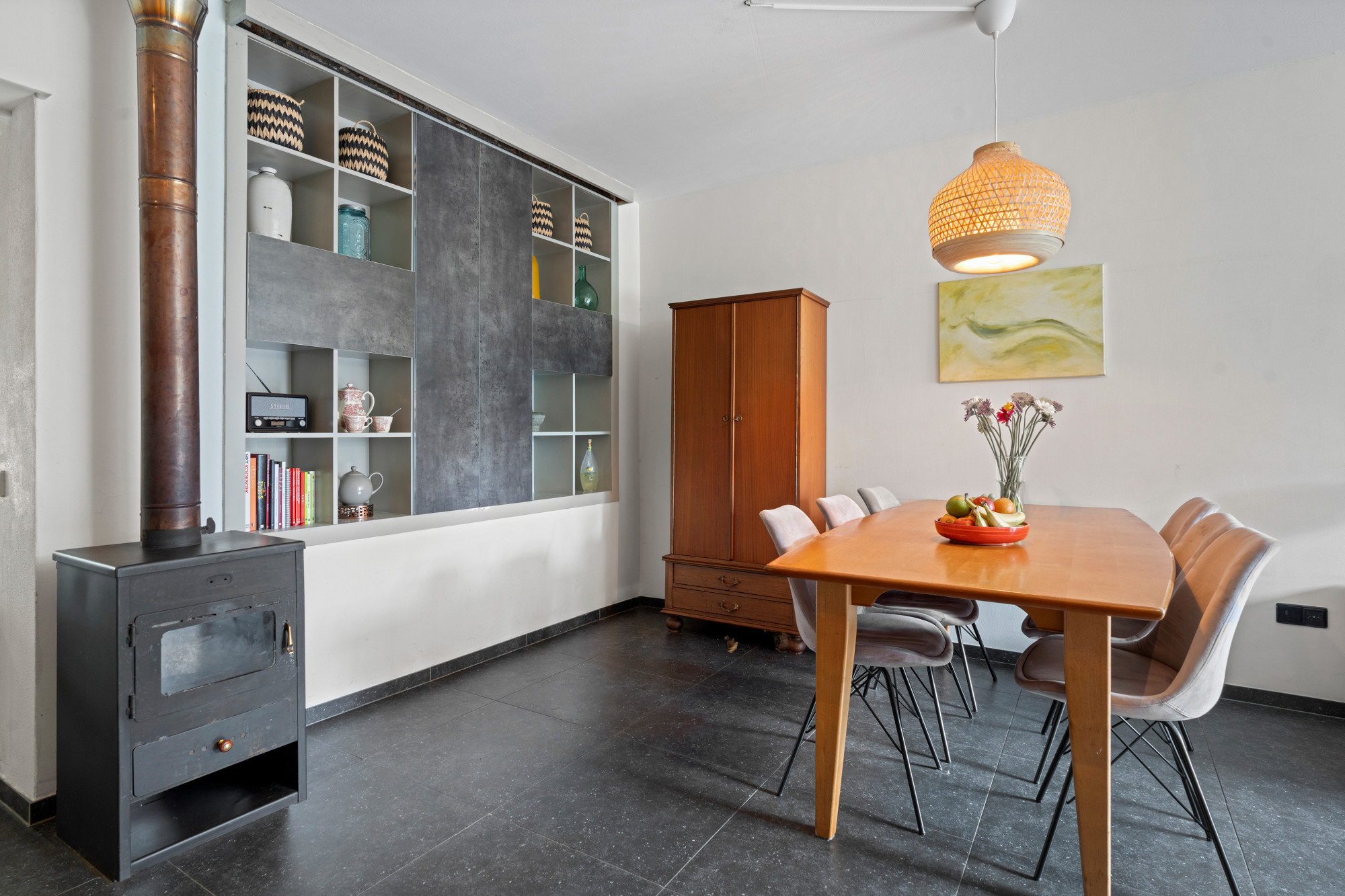 De ruime woonkamer (ca. 6.88 x 4.74 / 2.87 m, hoogte ca. 2.45 m) is voorzien van een stijlvolle plavuizen vloer met vloerverwarming en een sfeervolle houtkachel.