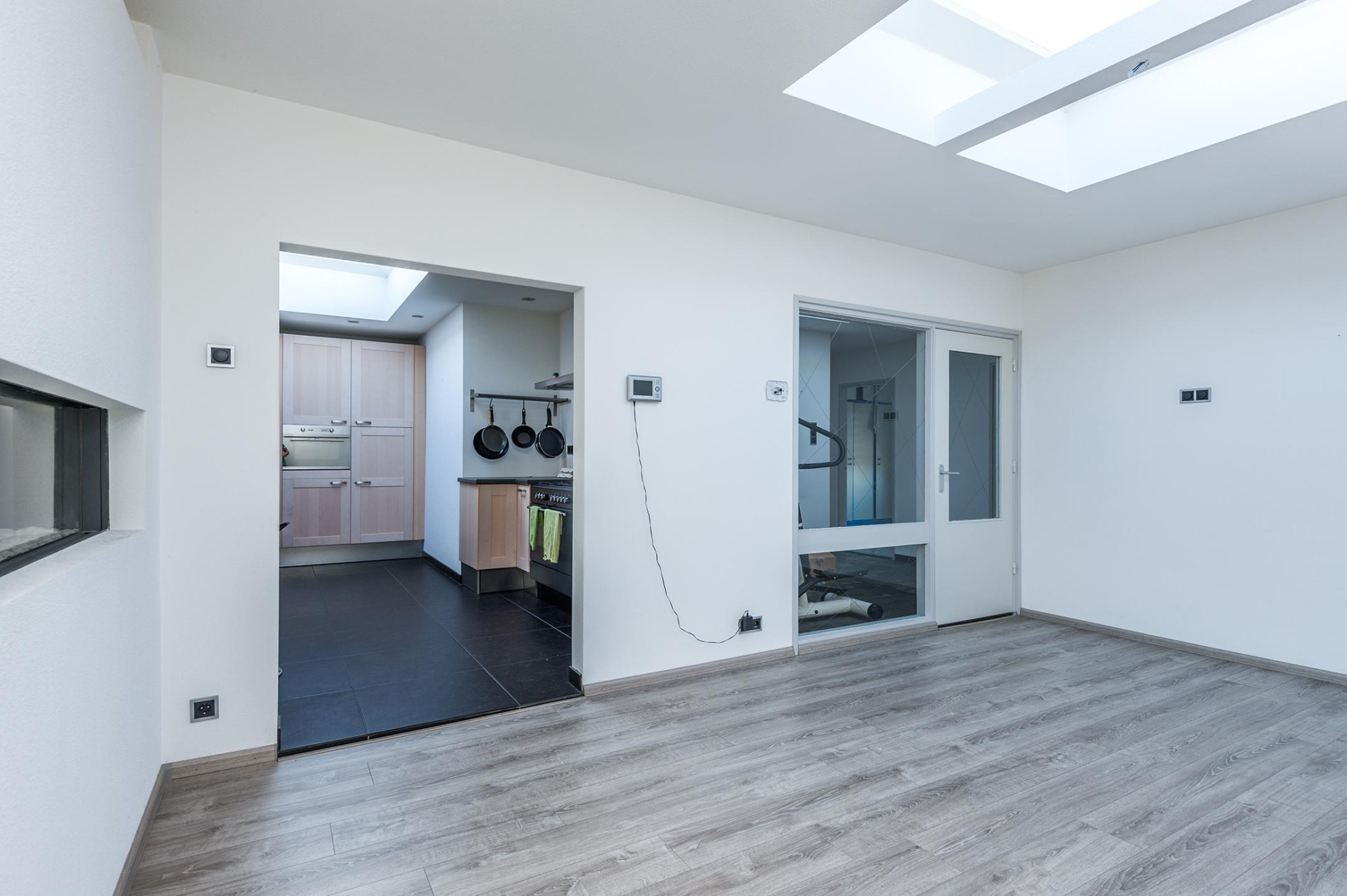 - Woonkamer (10.34mx3.57/8.92mx4.74m)met laminaatvloer en niveauverschil en gashaardpartij(doorkijk naar terras, woonkamer en keuken).