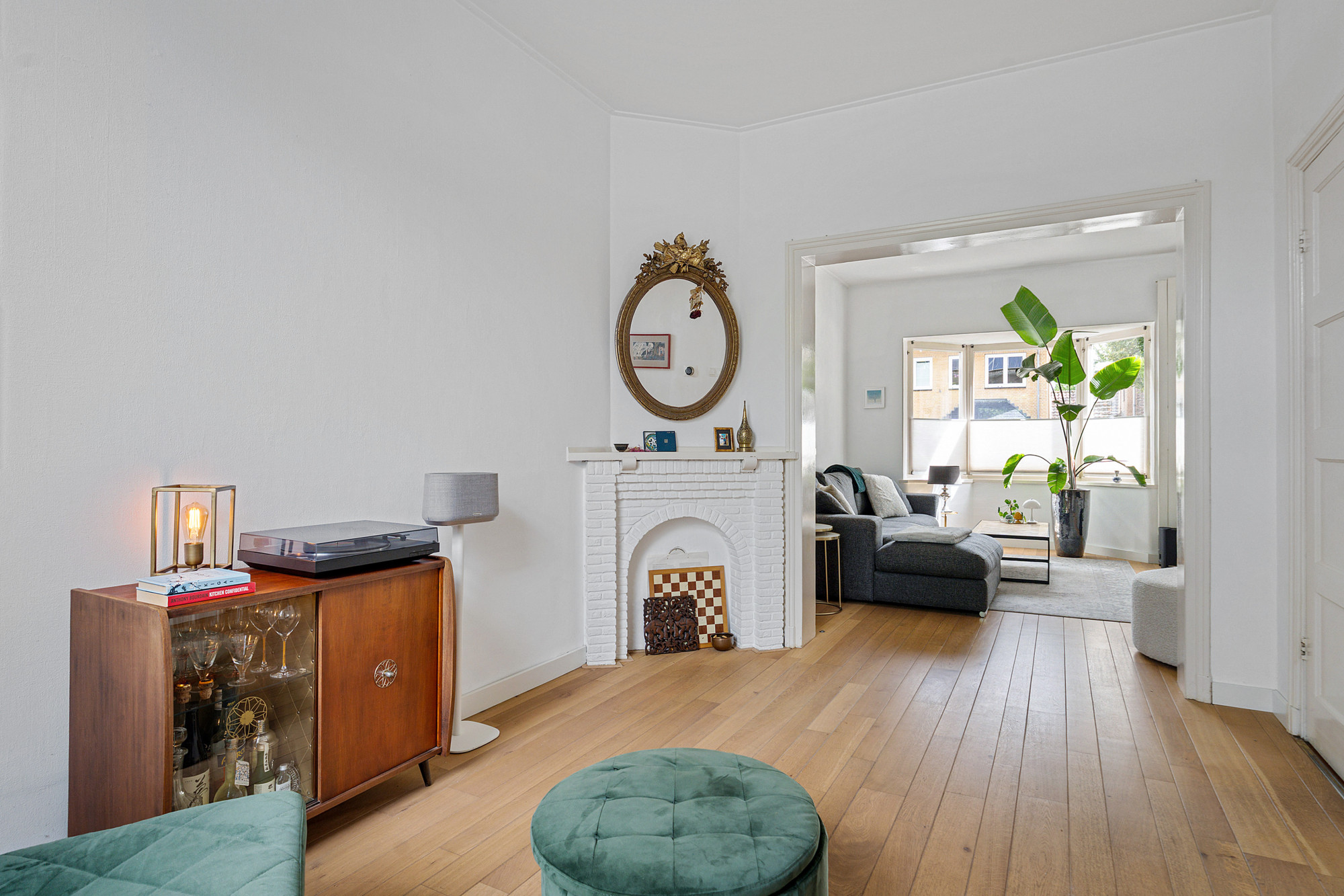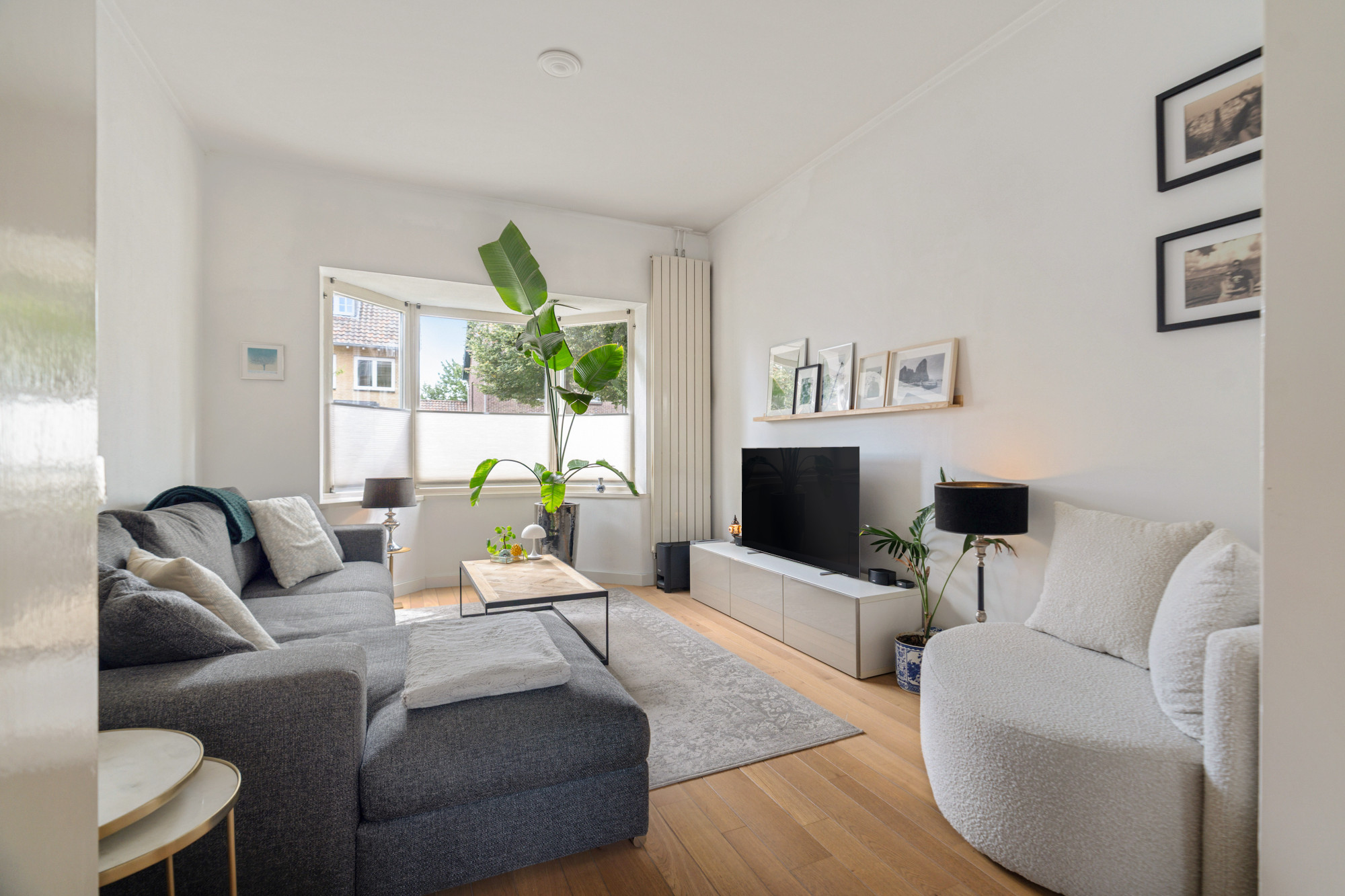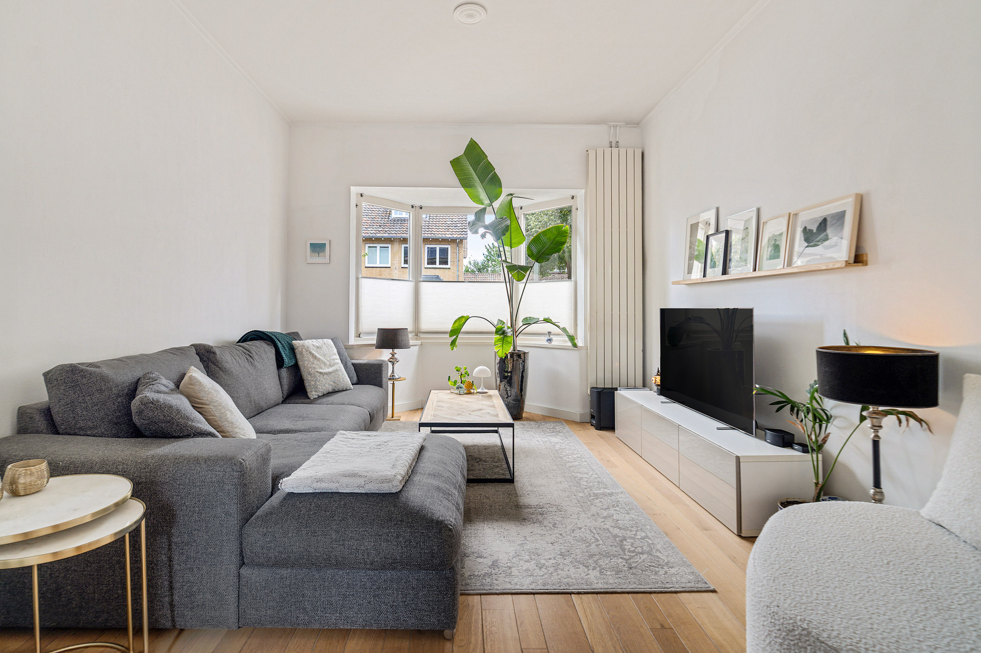 De lichte woonkamer is voorzien van een houten vloer en staat in open verbinding met de moderne keuken, wat zorgt voor een ruimtelijk en verbonden geheel.