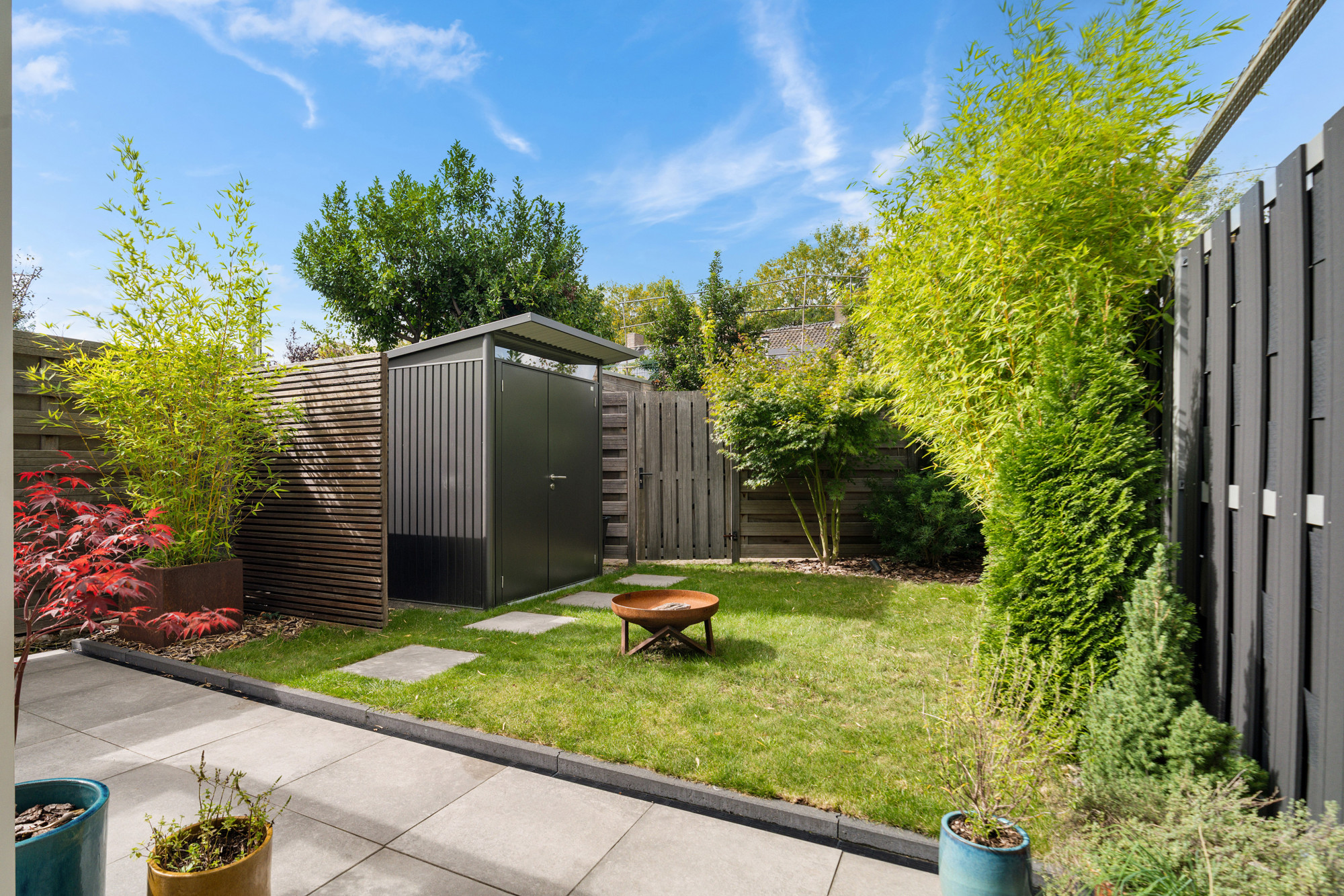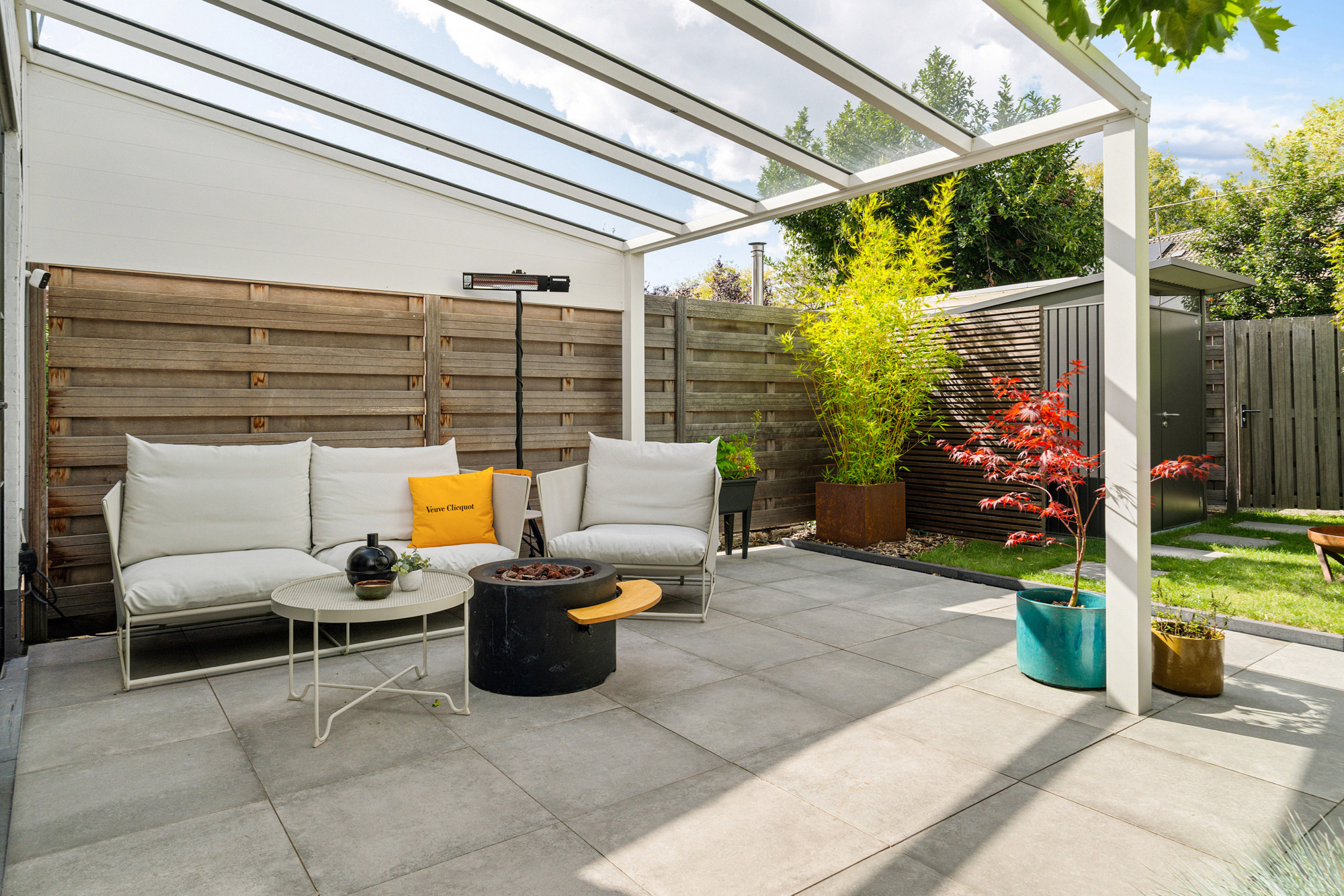 De tuin is onderhoudsvriendelijk aangelegd met een grasveld, betegeling en een gezellige overkapping – de ideale plek om buiten te ontspannen.