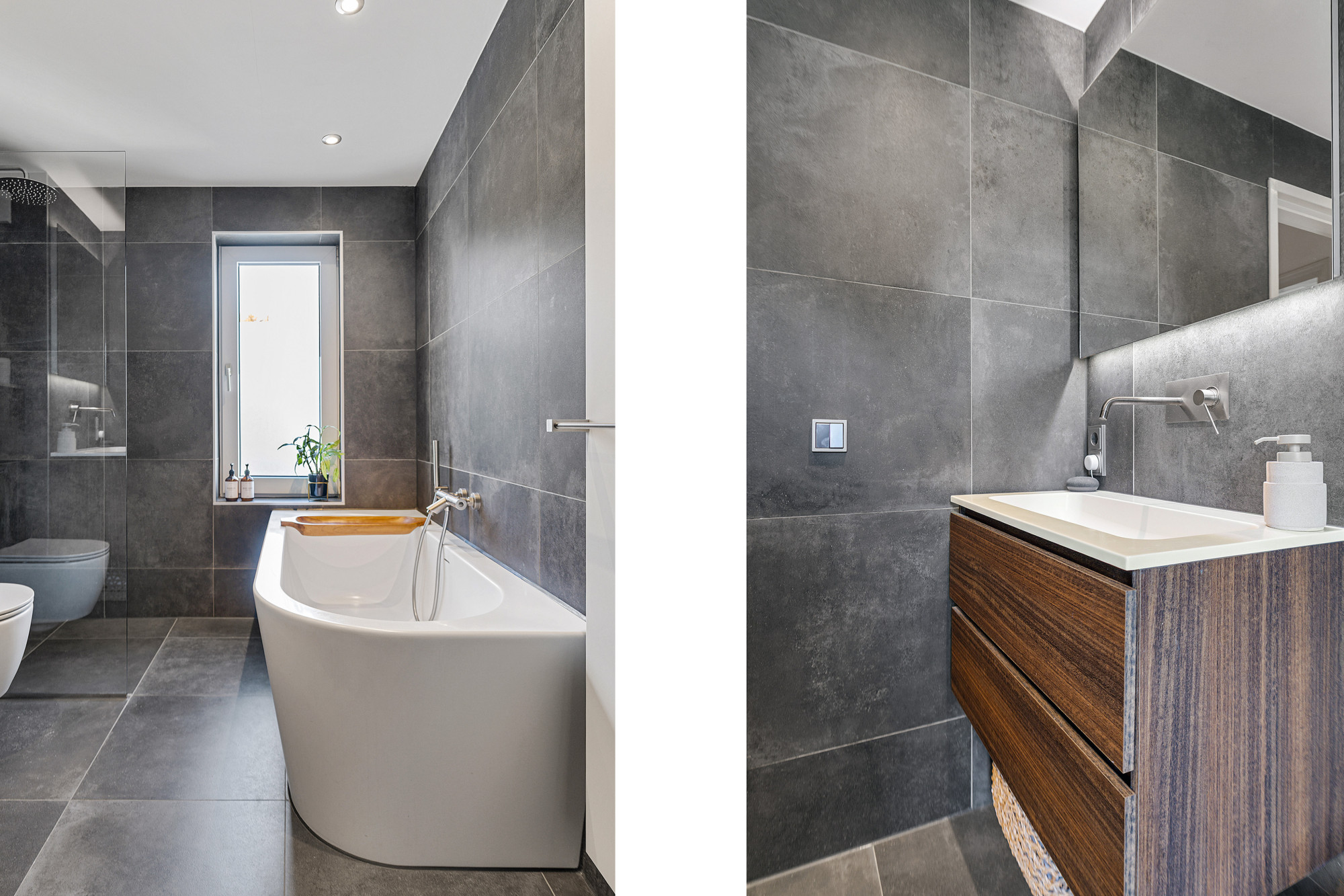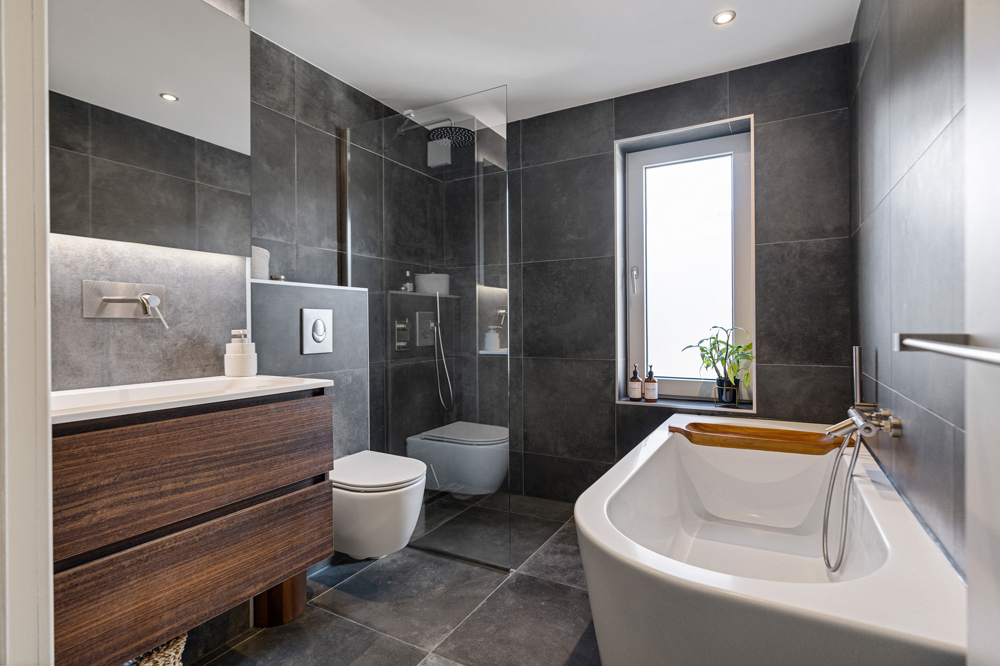 Deze badkamer is volledig betegeld en voorzien van een ligbad, inloopdouche, toilet, wastafel en wastafelmeubel – een comfortabele plek om heerlijk te ontspannen.
