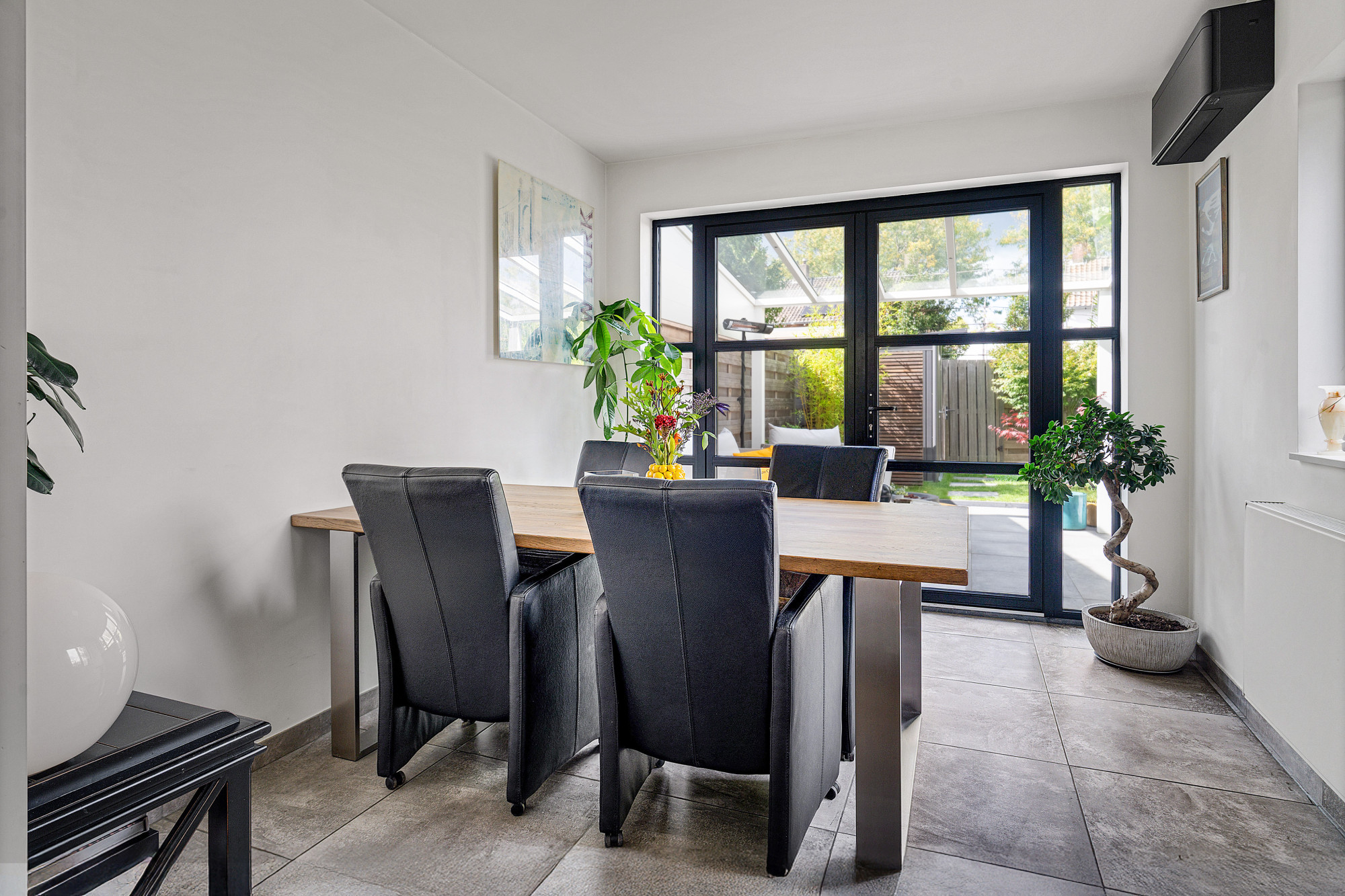 De achtertuin is bereikbaar via de dubbele tuindeuren in de eetkamer én via de tweede hal.