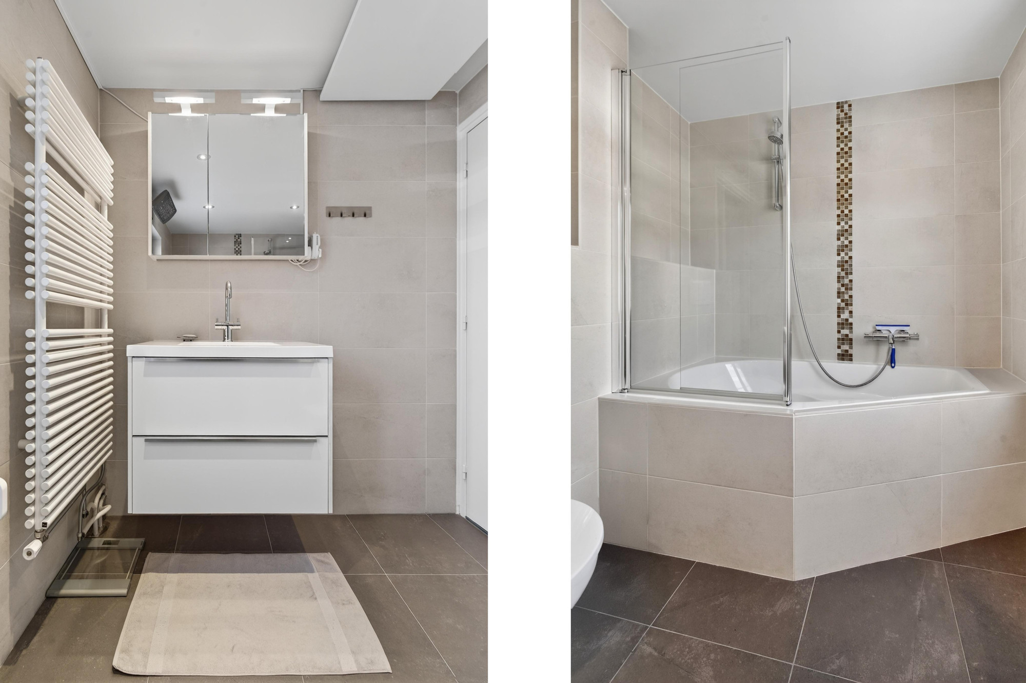 Volledig betgelde badkamer(3.00mx1.86m) is voorzien van ligbad/douche combinatie, zwevend toilet en vaste wastafel, sierradiator.