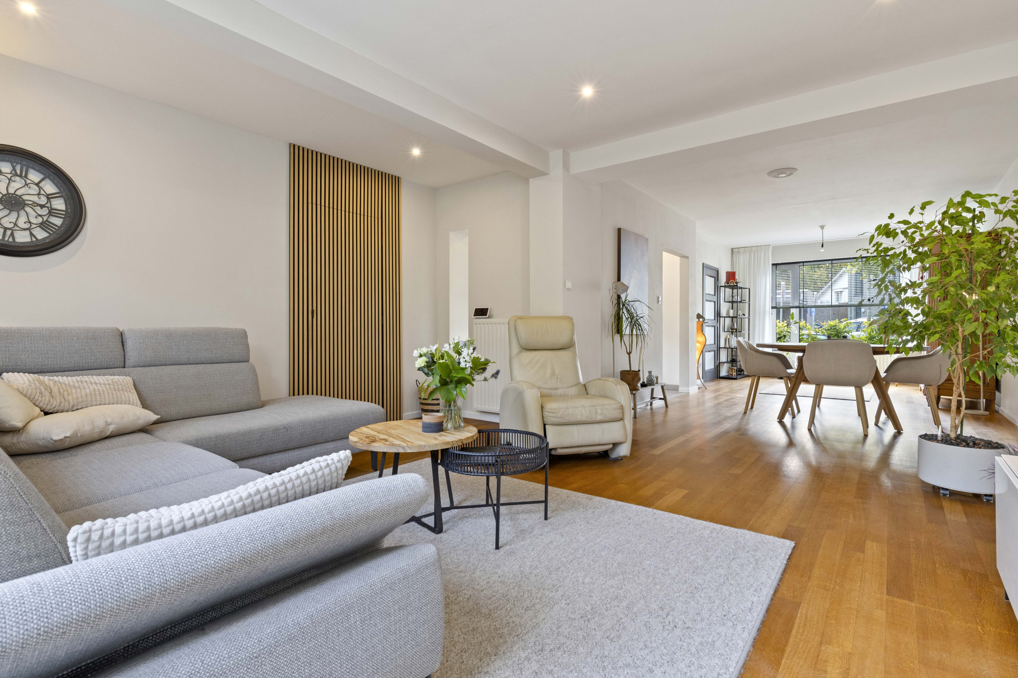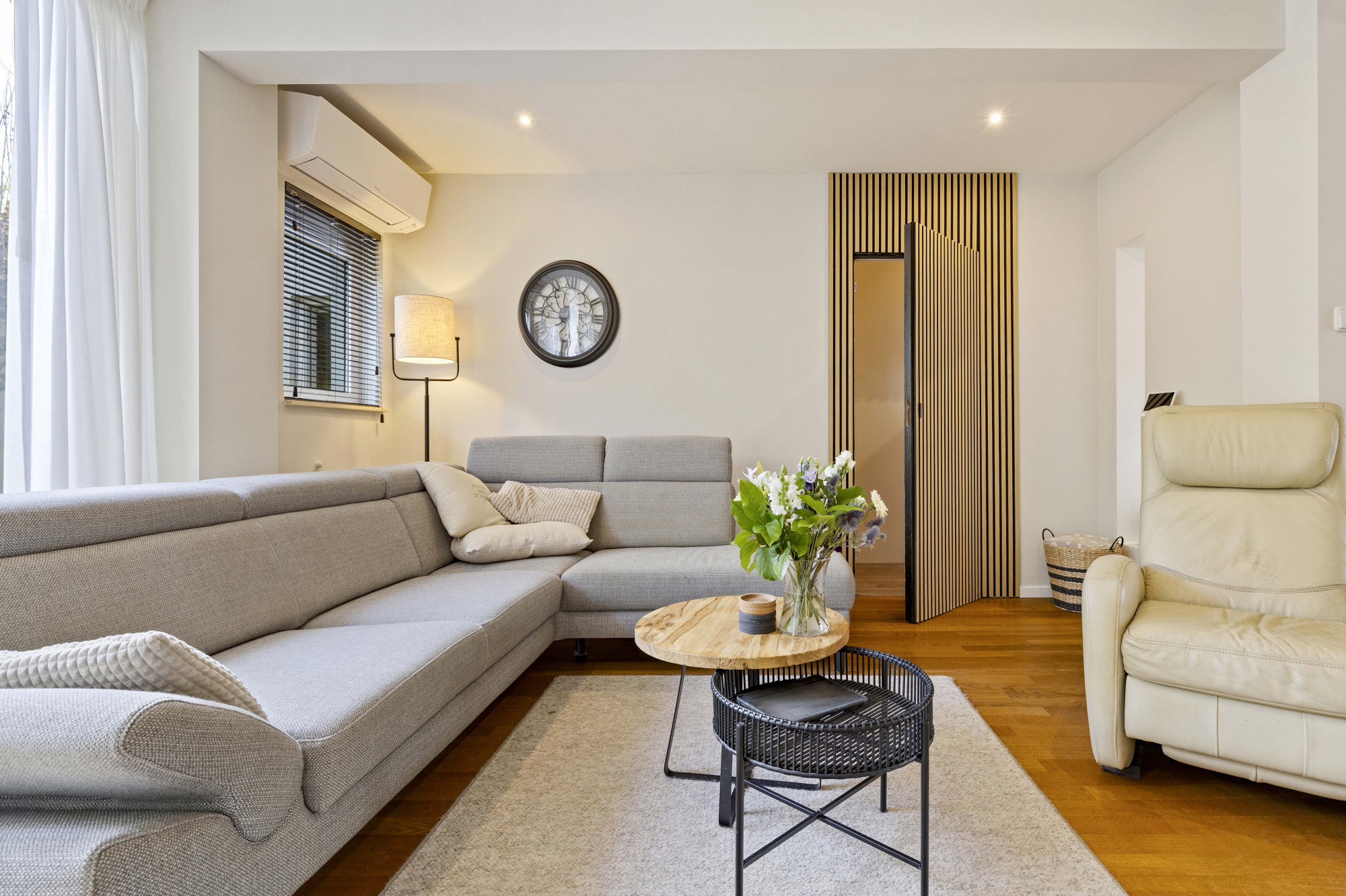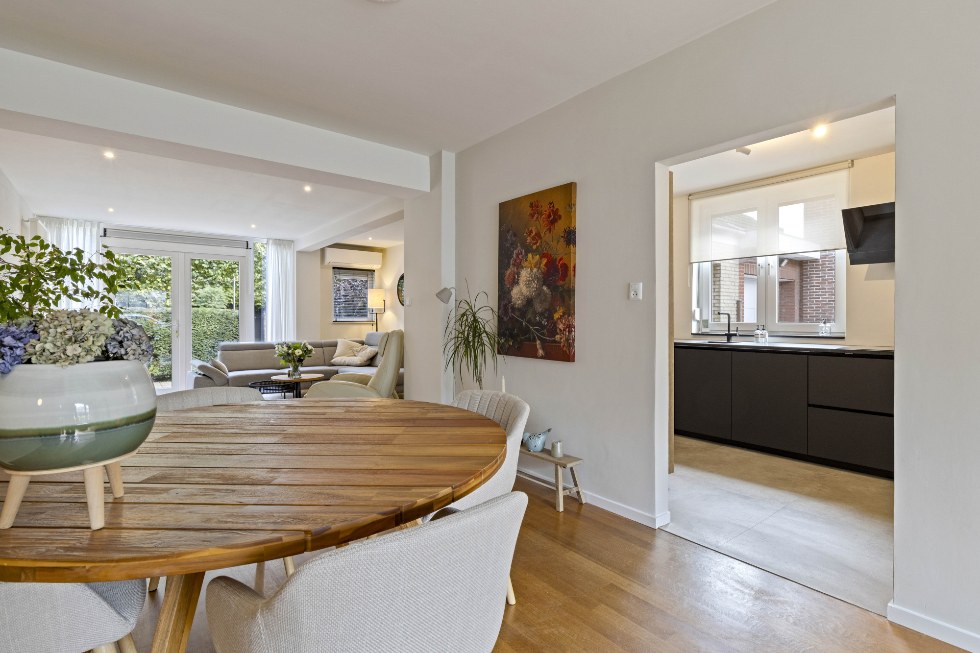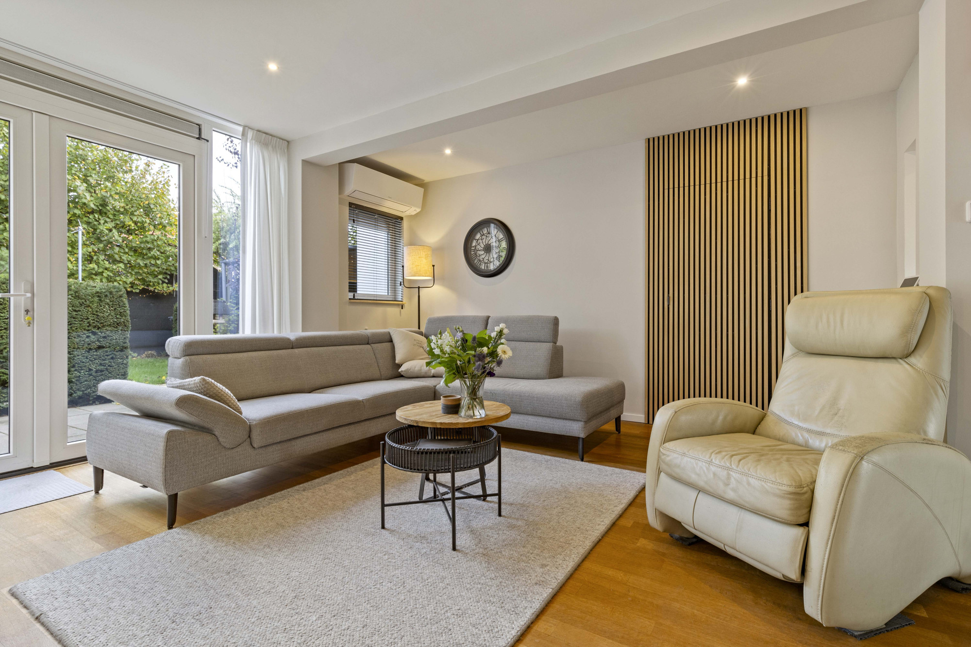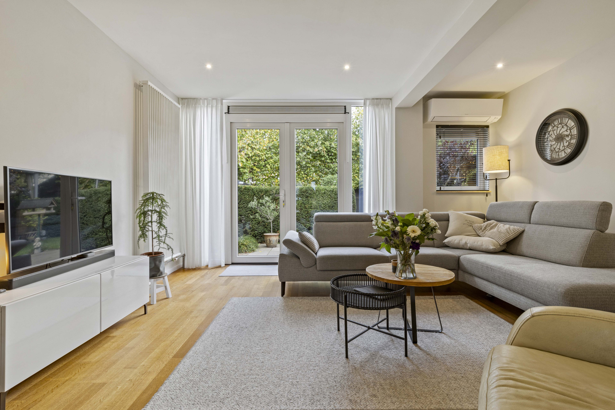 Via de ruime hal met tegelvloer, moderne meterkast en trapopgang bereikt u de royale woonkamer met parketvloer, airconditioning en openslaande tuindeuren naar de sfeervolle, omsloten tuin.
