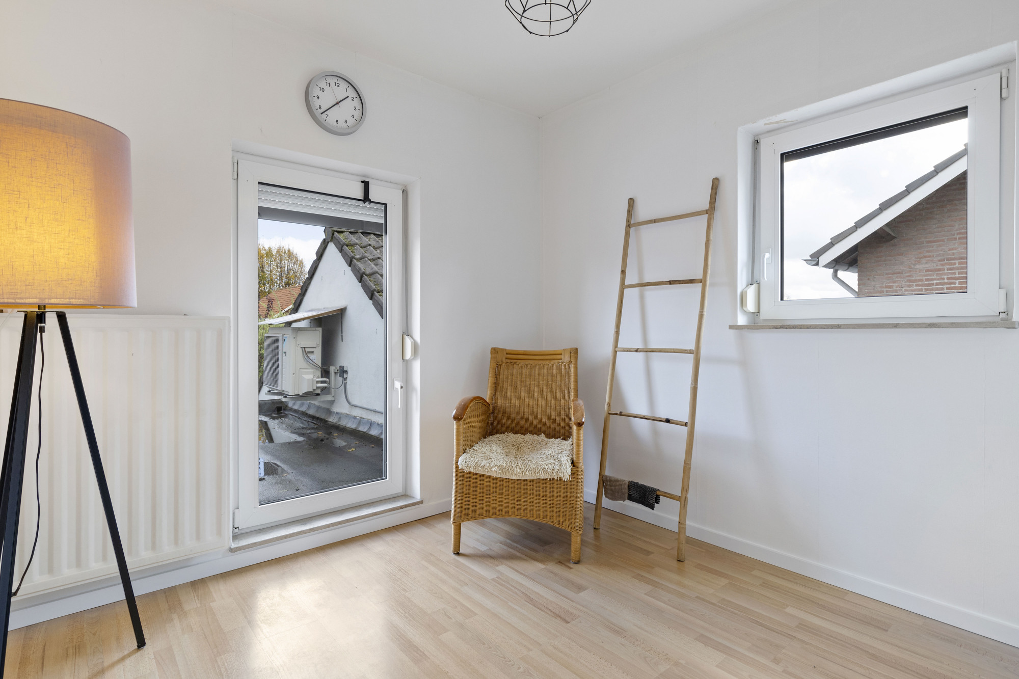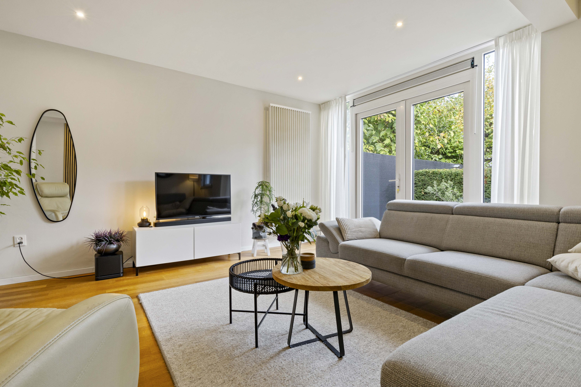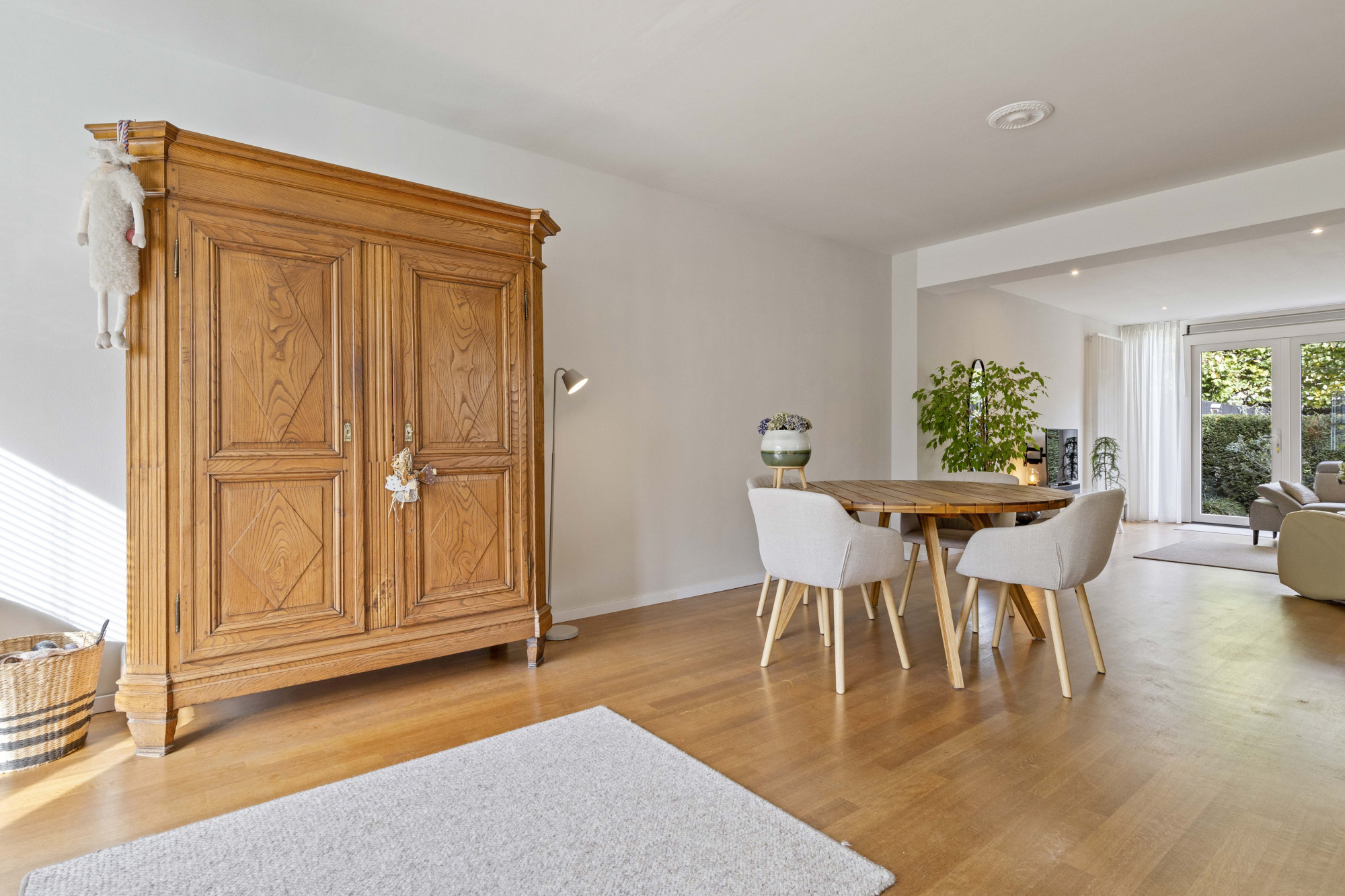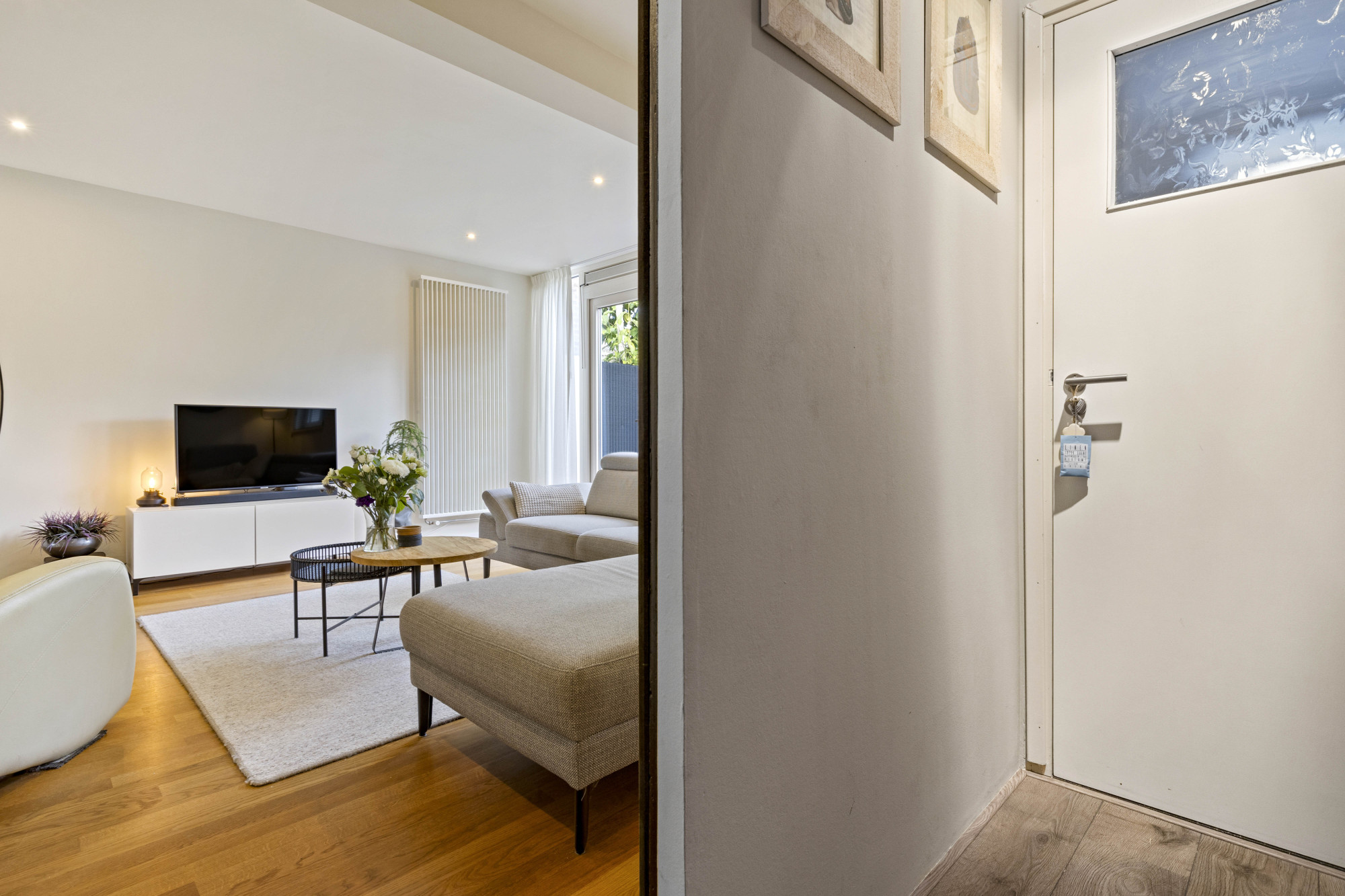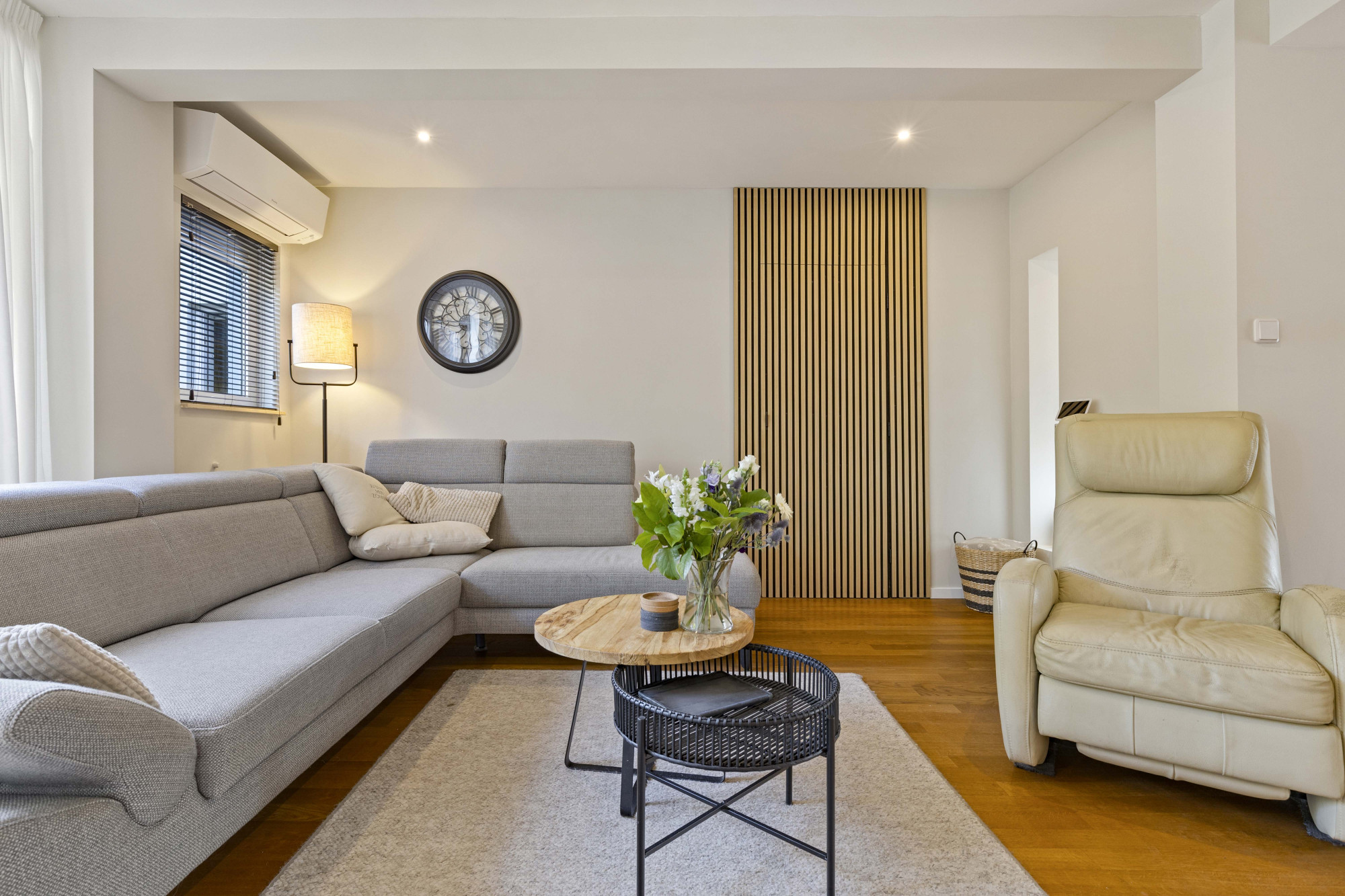 Via de ruime hal met tegelvloer, moderne meterkast en trapopgang bereikt u de royale woonkamer met parketvloer, airconditioning en openslaande tuindeuren naar de sfeervolle, omsloten tuin.