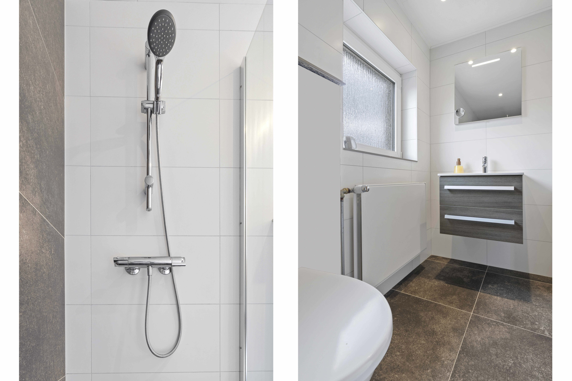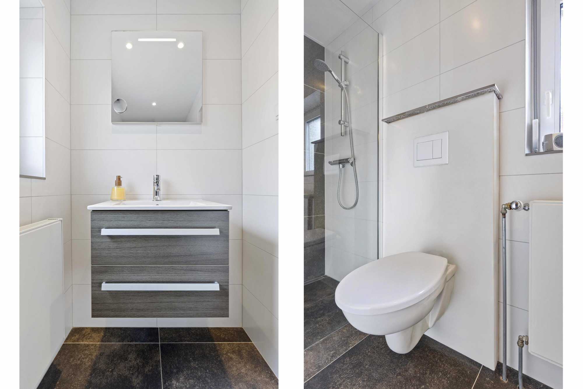 De moderne badkamer beschikt over een inloopdouche, wastafelmeubel en tweede toilet.