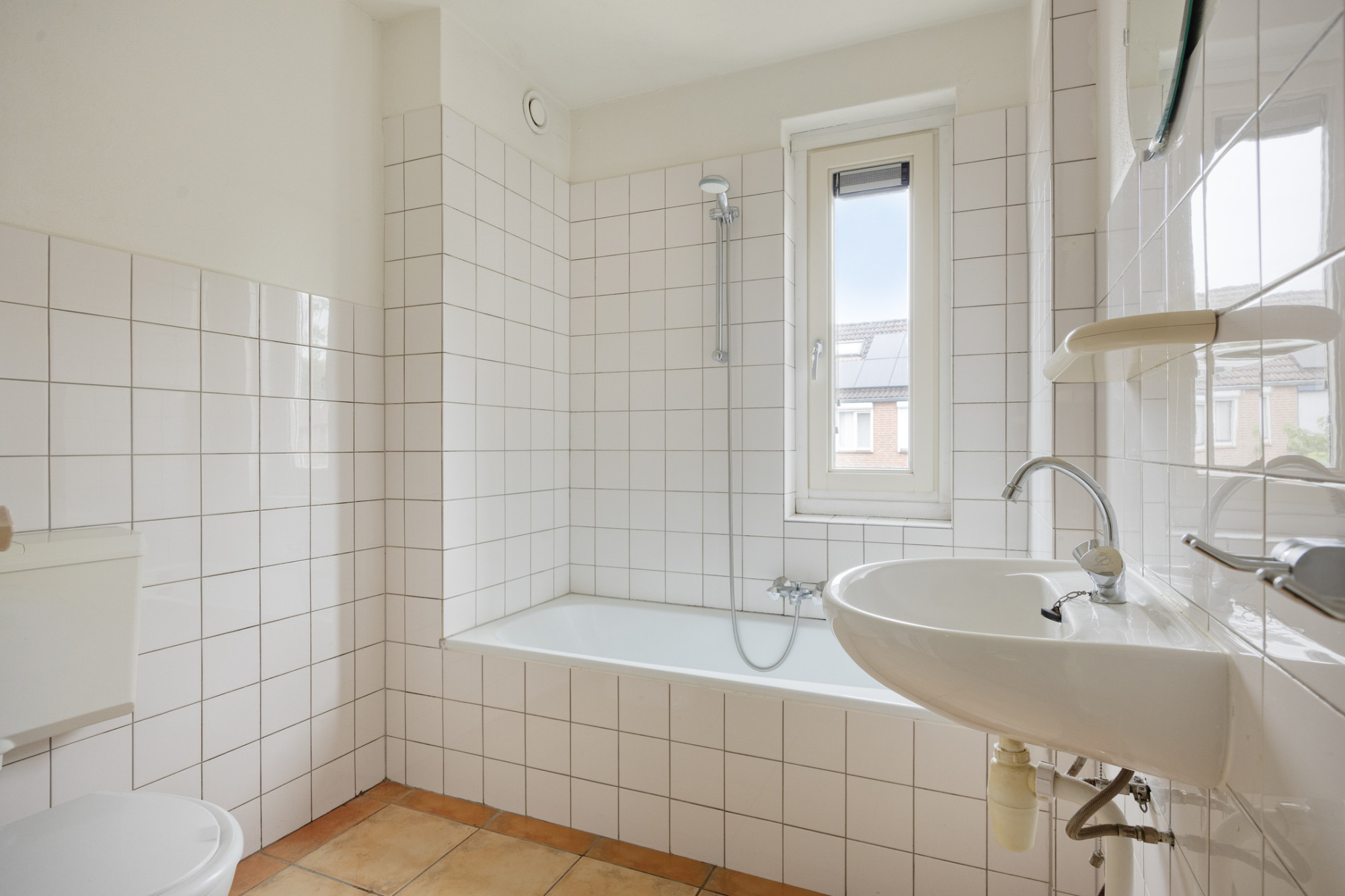 Overloop met drie slaapkamers en badkamer. De badkamer is voorzien van ligbad met douche, wastafel en daglichttoetreding.