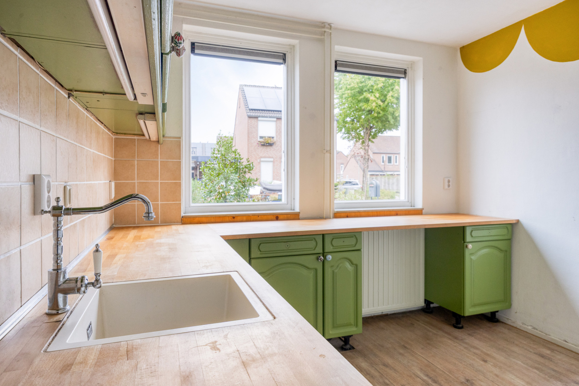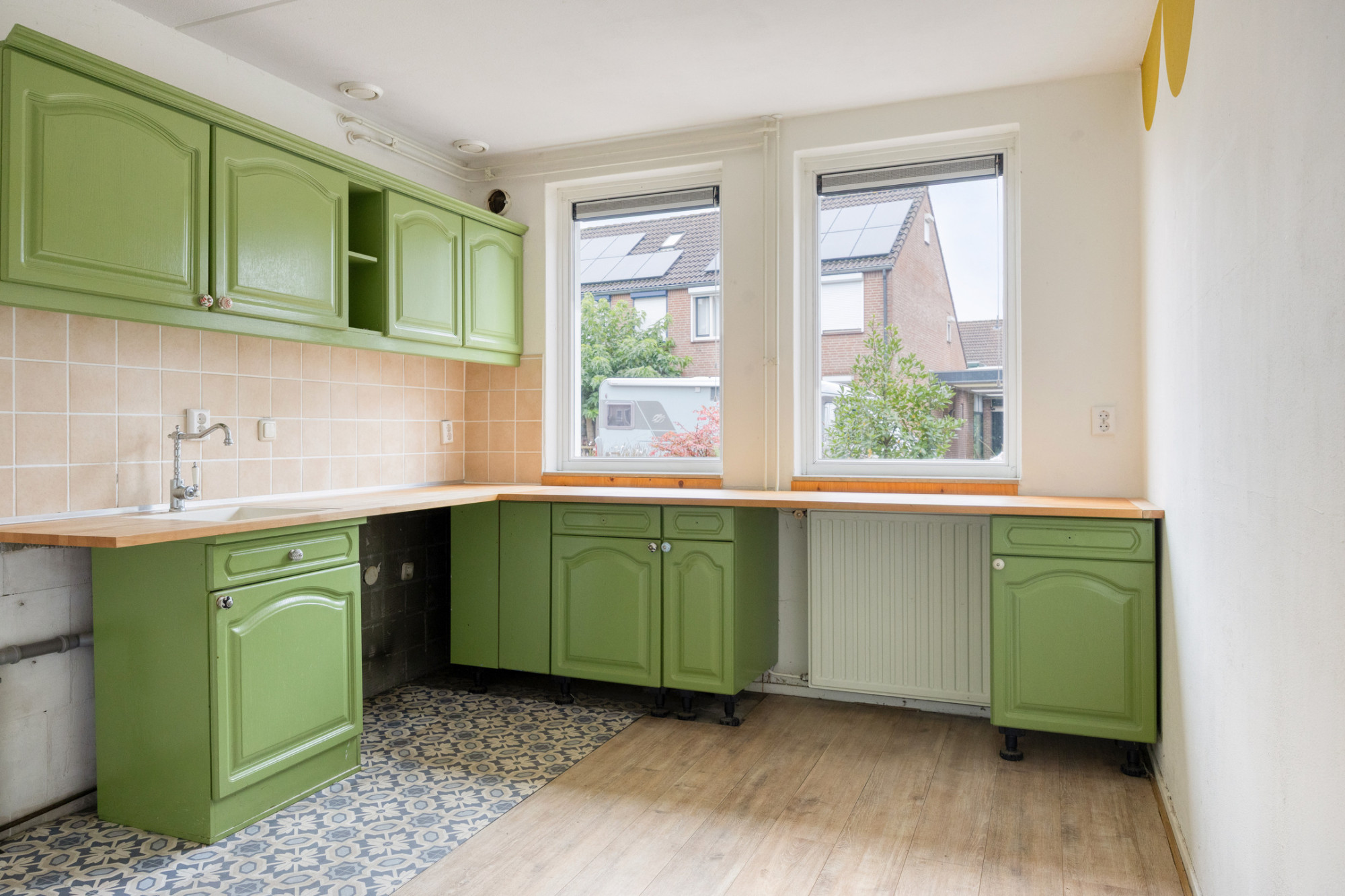 De woning is voorzien van energielabel B en biedt een goede basis om geheel naar eigen wens te moderniseren. De lichte woonkamer heeft grote raampartijen en een directe verbinding met de tuin. De keuken bevindt zich aan de voorzijde van de woning en is uitgevoerd met groene kastfronten, een houten werkblad en lichte wandtegels. De badkamer beschikt over een ligbad met douche, wastafel en raam voor natuurlijke ventilatie.