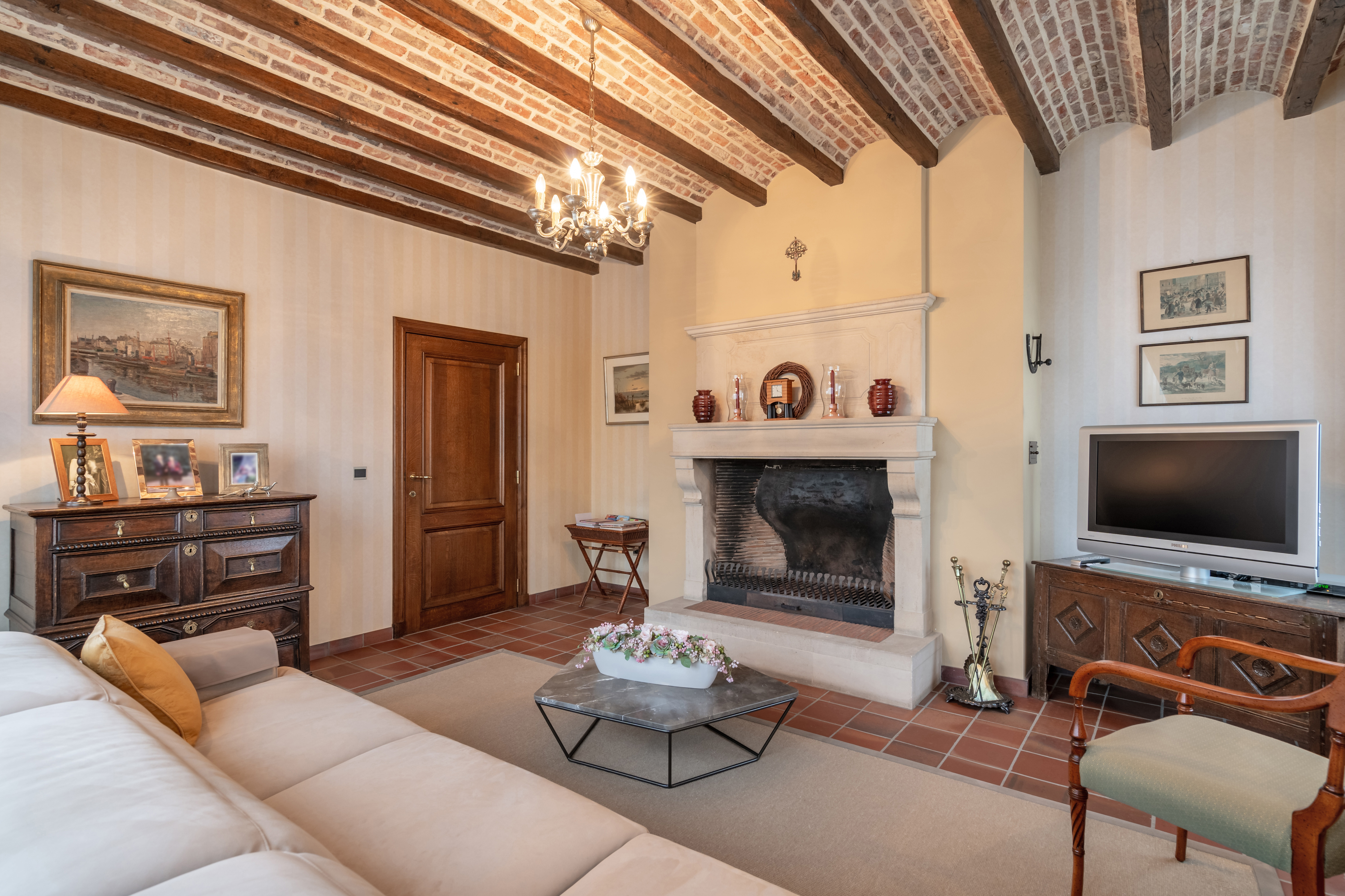 - Aparte zitruimte/tv-ruimte met open haard op hout en mooi gewelfd plafond