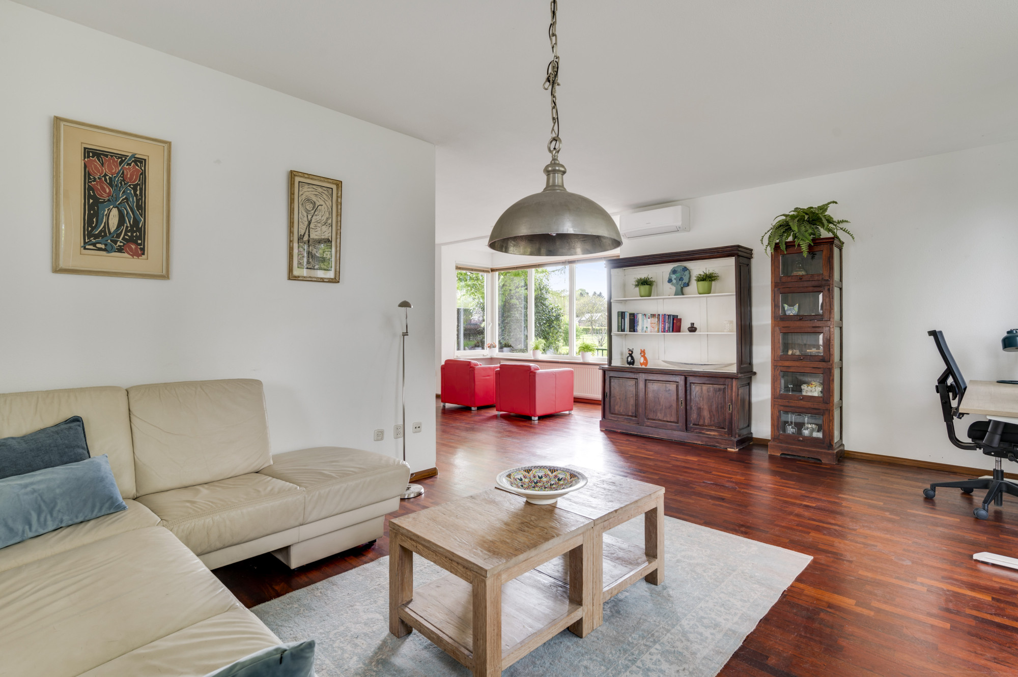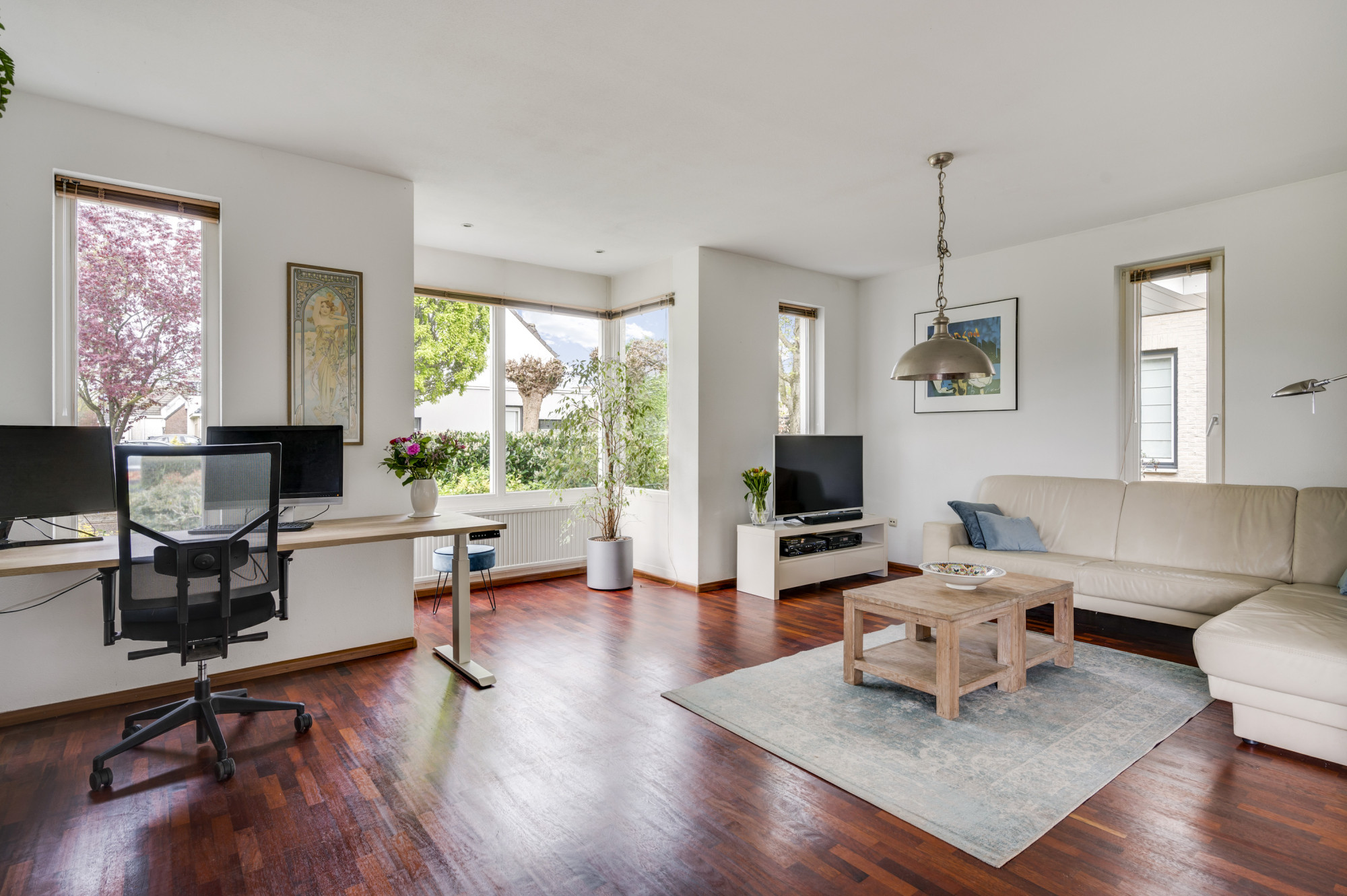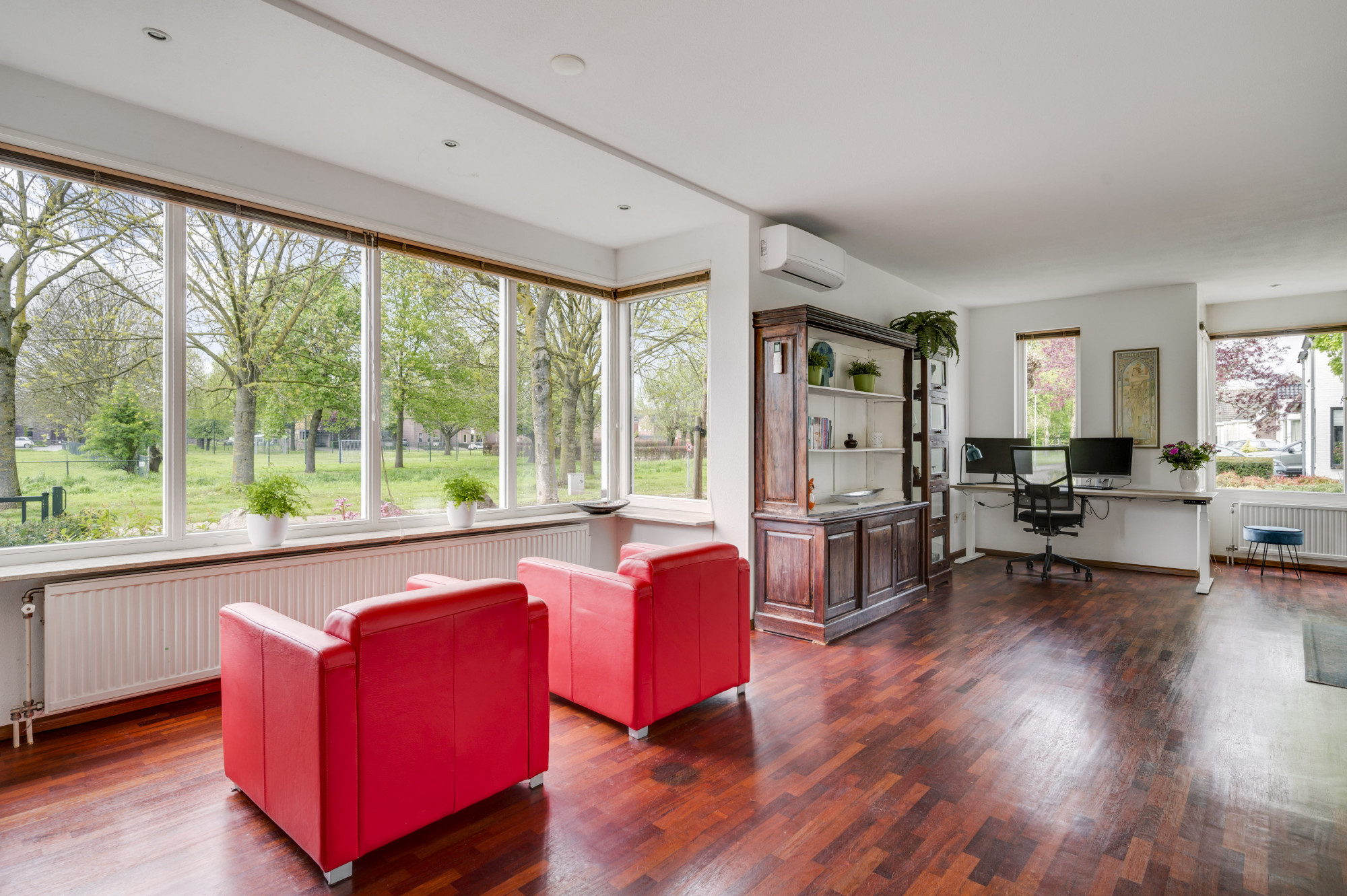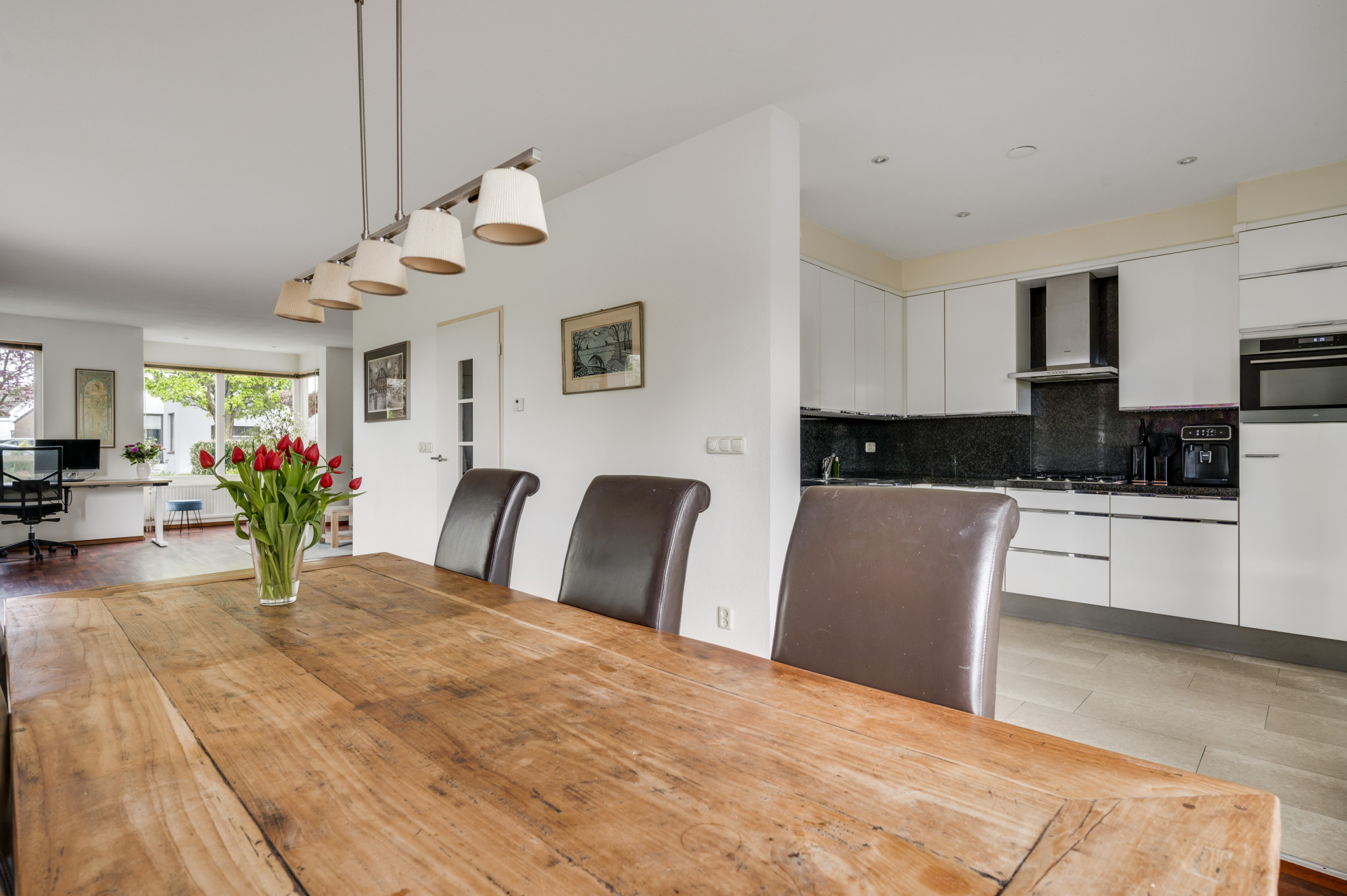 Bij binnenkomst word je verwelkomd door een ruime entree met een elegante beige marmeren vloer, een moderne meterkast en een trap naar de eerste verdieping. Hier vind je ook een toiletruimte met een vrij hangend toilet en fonteintje. De L-vormige woonkamer, toegankelijk vanuit de hal, is slim ontworpen met een zitgedeelte aan de voorzijde en een eetgedeelte aan de achterzijde. Grote ramen, waaronder een erker aan de voor- en zijgevel en een schuifpui aan de achterzijde, zorgen voor veel natuurlijk licht. Deze fraaie erker biedt wijds uitzicht over de prachtige groenvoorziening nabij de Sleybeek. Een prachtig plekje om heerlijk tot rust te komen en te genieten van de natuur. Via een schuifpui heb je toegang tot het overdekte terras en de achtertuin. De keuken, in open verbinding met de woonkamer, is voorzien van moderne apparatuur, namelijk een 4-pits gaskookplaat, RVS afzuigkap, combi-oven, koelkast, vaatwasser, inbouwspots en een stijlvol hardstenen aanrechtblad. Via de keuken is er toegang tot een handige bijkeuken met loopdeur naar het terras. Deze bijkeuken is voorzien van een schuifwandkast met witgoedaansluiting en biedt inpandig toegang tot de multifuctionele ruimte. De voormalige garage is omgebouwd tot een multifunctionele kamer, ideaal als thuiskantoor, hobbyruimte of extra slaapkamer. Vaste kasten zorgen voor veel handige bergruimte.