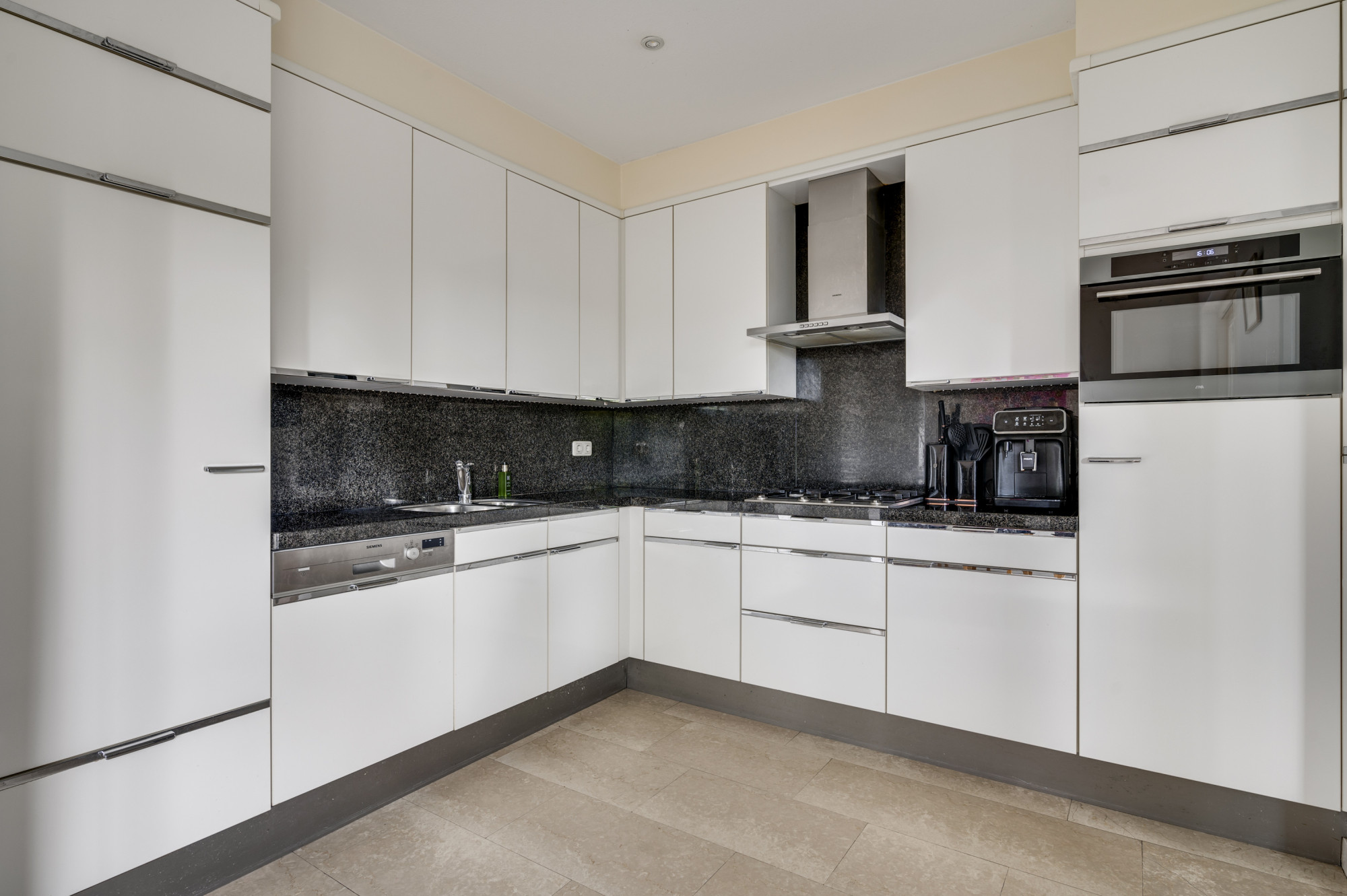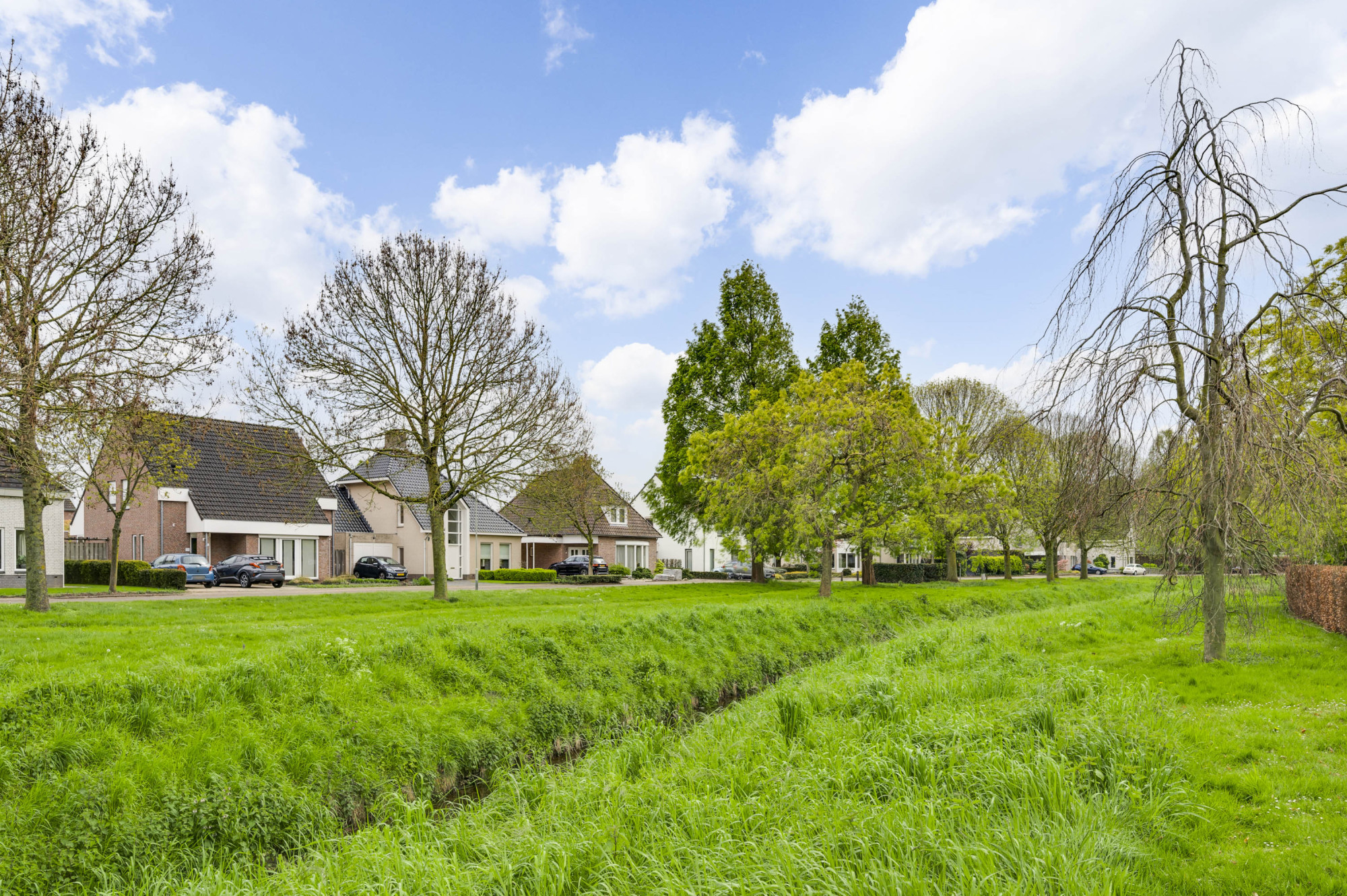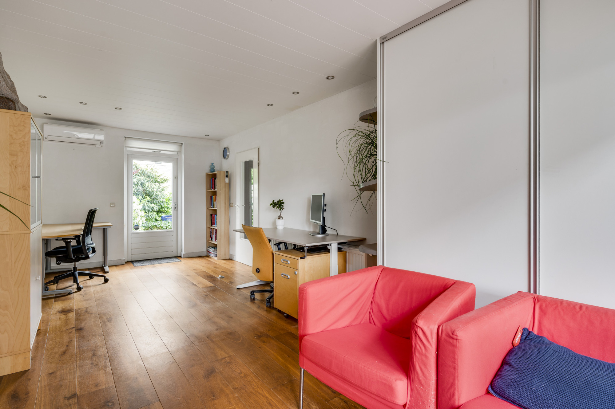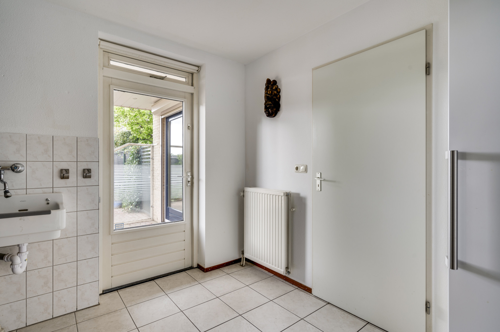 Bij binnenkomst word je verwelkomd door een ruime entree met een elegante beige marmeren vloer, een moderne meterkast en een trap naar de eerste verdieping. Hier vind je ook een toiletruimte met een vrij hangend toilet en fonteintje. De L-vormige woonkamer, toegankelijk vanuit de hal, is slim ontworpen met een zitgedeelte aan de voorzijde en een eetgedeelte aan de achterzijde. Grote ramen, waaronder een erker aan de voor- en zijgevel en een schuifpui aan de achterzijde, zorgen voor veel natuurlijk licht. Deze fraaie erker biedt wijds uitzicht over de prachtige groenvoorziening nabij de Sleybeek. Een prachtig plekje om heerlijk tot rust te komen en te genieten van de natuur. Via een schuifpui heb je toegang tot het overdekte terras en de achtertuin. De keuken, in open verbinding met de woonkamer, is voorzien van moderne apparatuur, namelijk een 4-pits gaskookplaat, RVS afzuigkap, combi-oven, koelkast, vaatwasser, inbouwspots en een stijlvol hardstenen aanrechtblad. Via de keuken is er toegang tot een handige bijkeuken met loopdeur naar het terras. Deze bijkeuken is voorzien van een schuifwandkast met witgoedaansluiting en biedt inpandig toegang tot de multifuctionele ruimte. De voormalige garage is omgebouwd tot een multifunctionele kamer, ideaal als thuiskantoor, hobbyruimte of extra slaapkamer. Vaste kasten zorgen voor veel handige bergruimte.