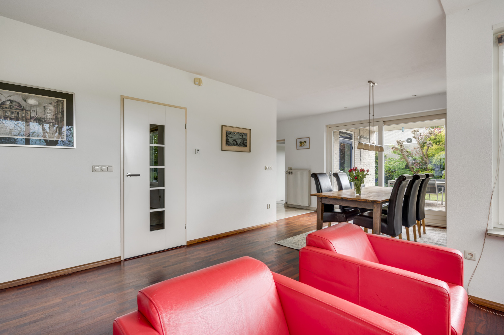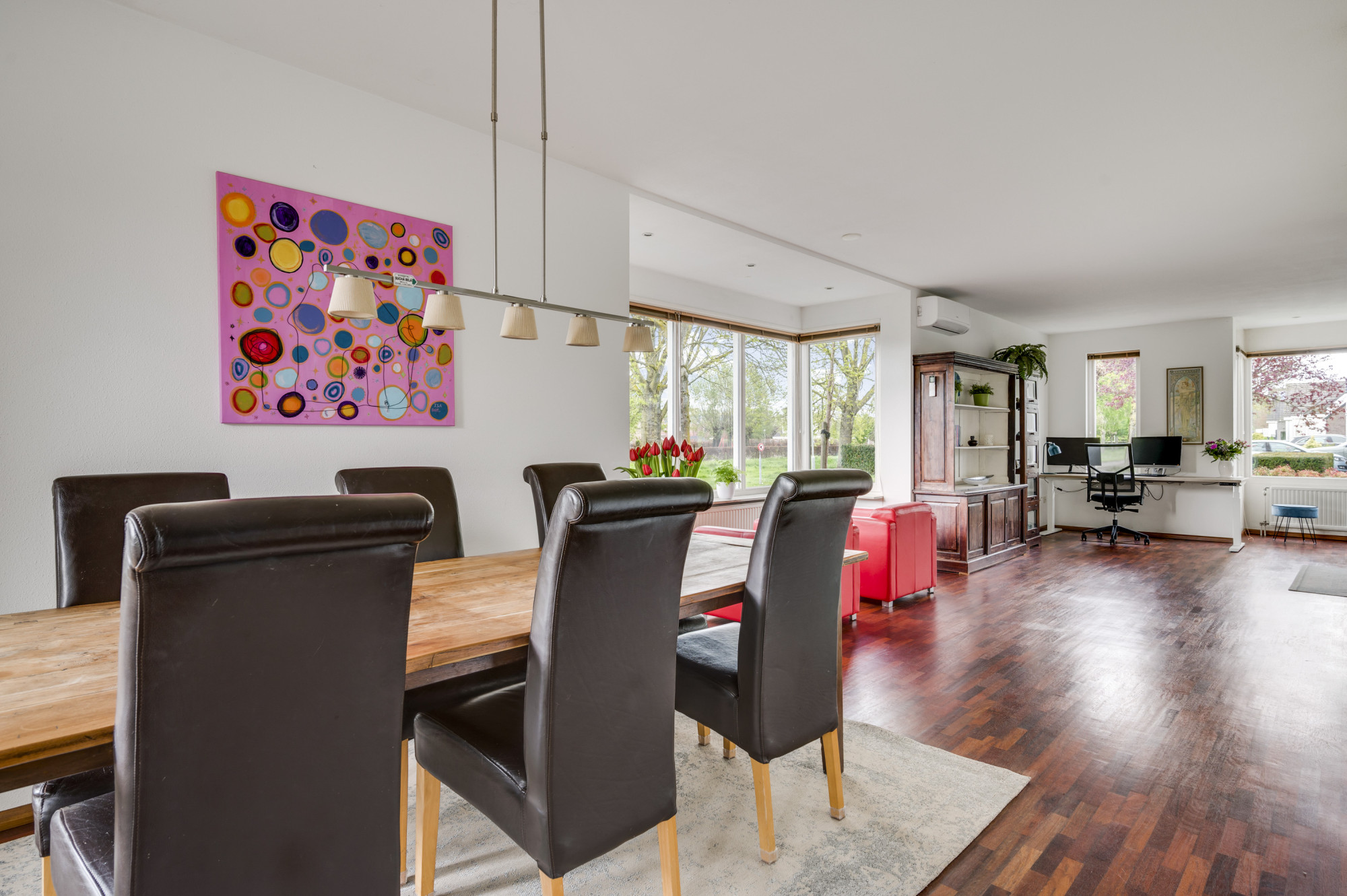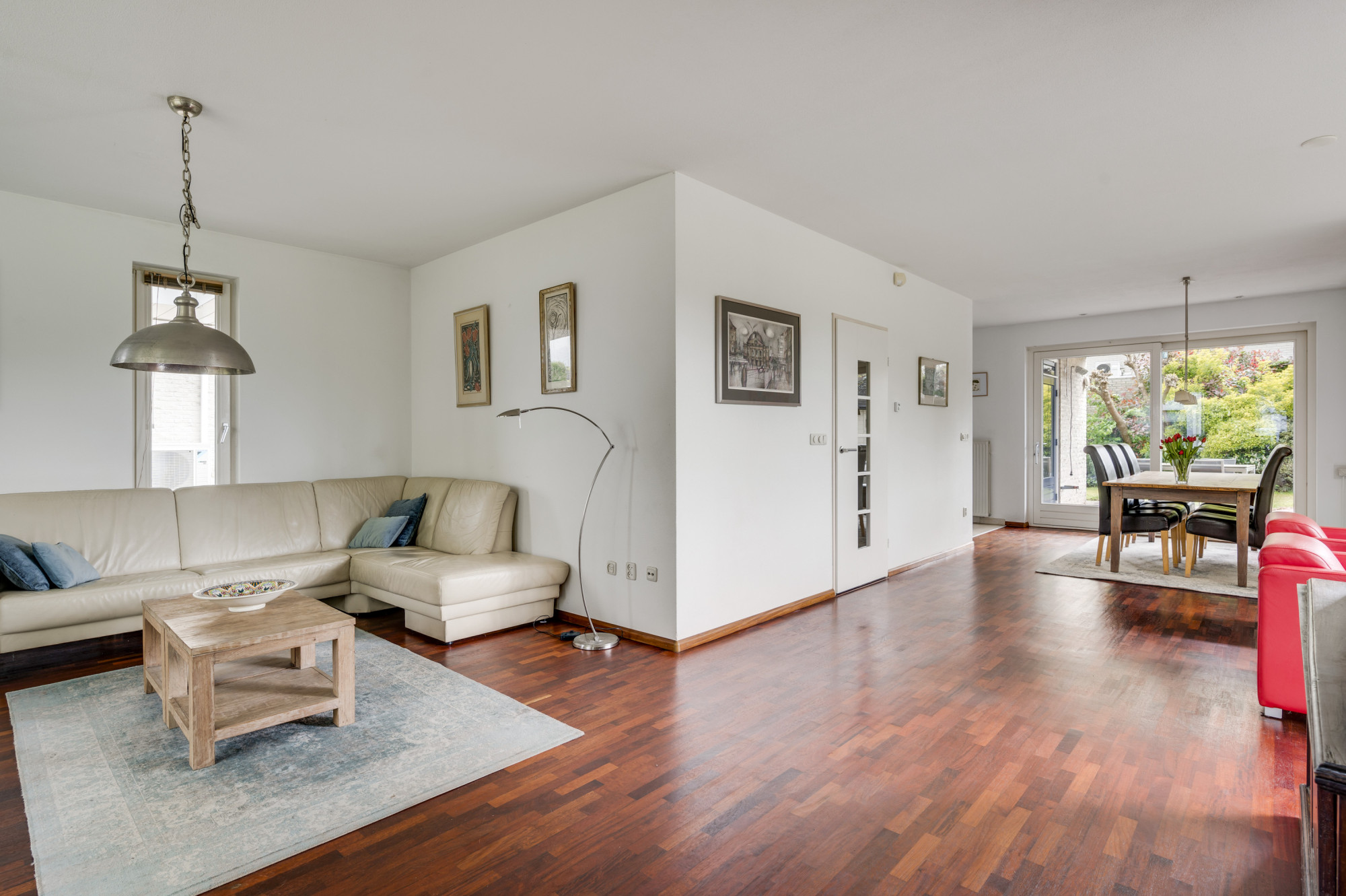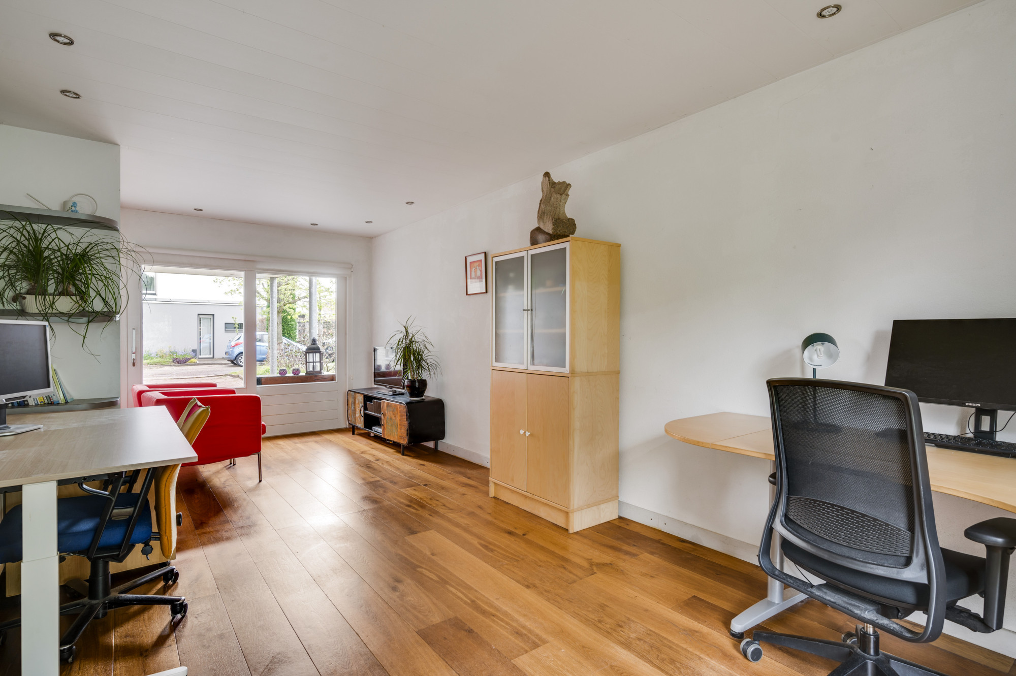 Bij binnenkomst word je verwelkomd door een ruime entree met een elegante beige marmeren vloer, een moderne meterkast en een trap naar de eerste verdieping. Hier vind je ook een toiletruimte met een vrij hangend toilet en fonteintje. De L-vormige woonkamer, toegankelijk vanuit de hal, is slim ontworpen met een zitgedeelte aan de voorzijde en een eetgedeelte aan de achterzijde. Grote ramen, waaronder een erker aan de voor- en zijgevel en een schuifpui aan de achterzijde, zorgen voor veel natuurlijk licht. Deze fraaie erker biedt wijds uitzicht over de prachtige groenvoorziening nabij de Sleybeek. Een prachtig plekje om heerlijk tot rust te komen en te genieten van de natuur. Via een schuifpui heb je toegang tot het overdekte terras en de achtertuin. De keuken, in open verbinding met de woonkamer, is voorzien van moderne apparatuur, namelijk een 4-pits gaskookplaat, RVS afzuigkap, combi-oven, koelkast, vaatwasser, inbouwspots en een stijlvol hardstenen aanrechtblad. Via de keuken is er toegang tot een handige bijkeuken met loopdeur naar het terras. Deze bijkeuken is voorzien van een schuifwandkast met witgoedaansluiting en biedt inpandig toegang tot de multifuctionele ruimte. De voormalige garage is omgebouwd tot een multifunctionele kamer, ideaal als thuiskantoor, hobbyruimte of extra slaapkamer. Vaste kasten zorgen voor veel handige bergruimte.