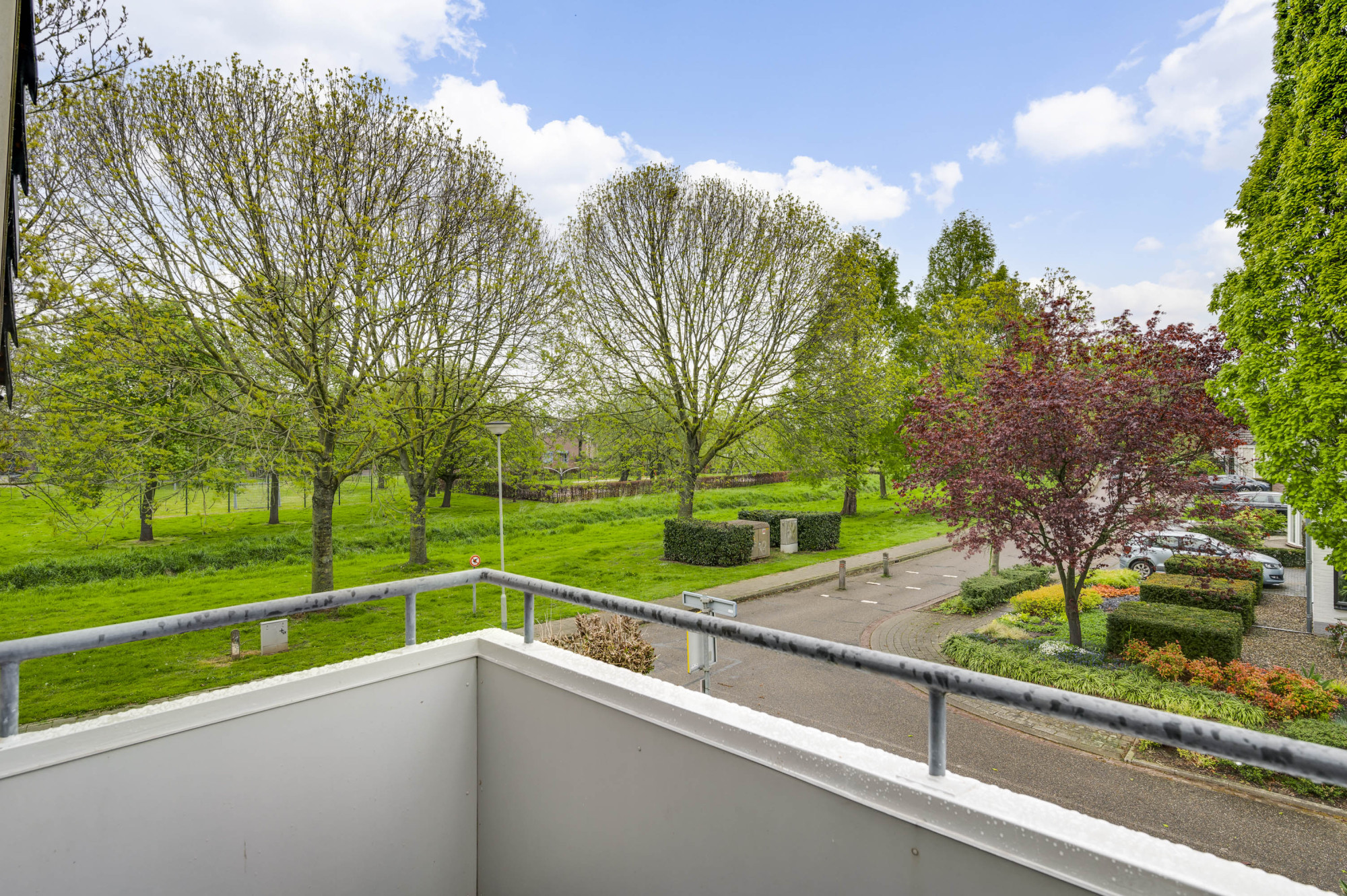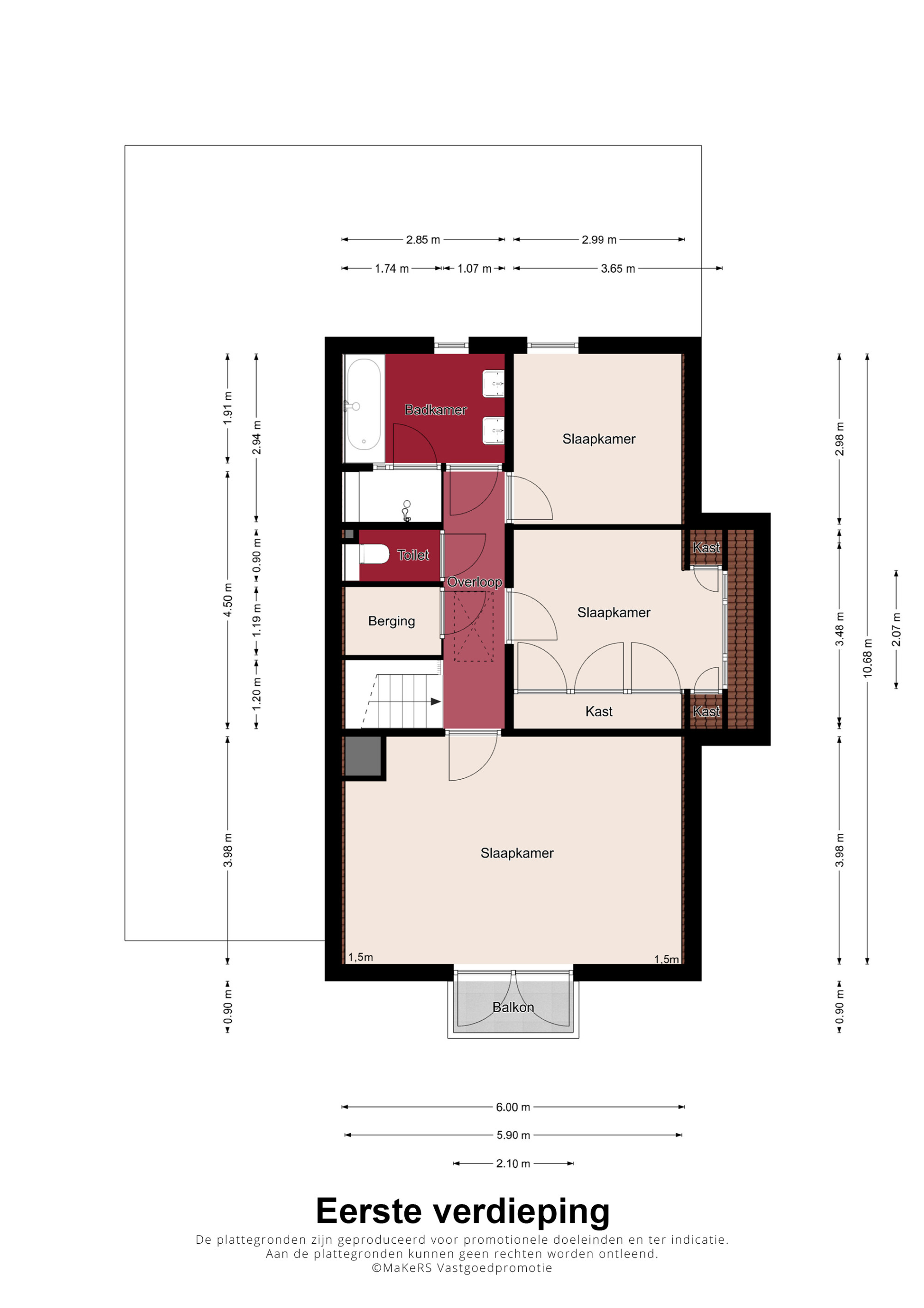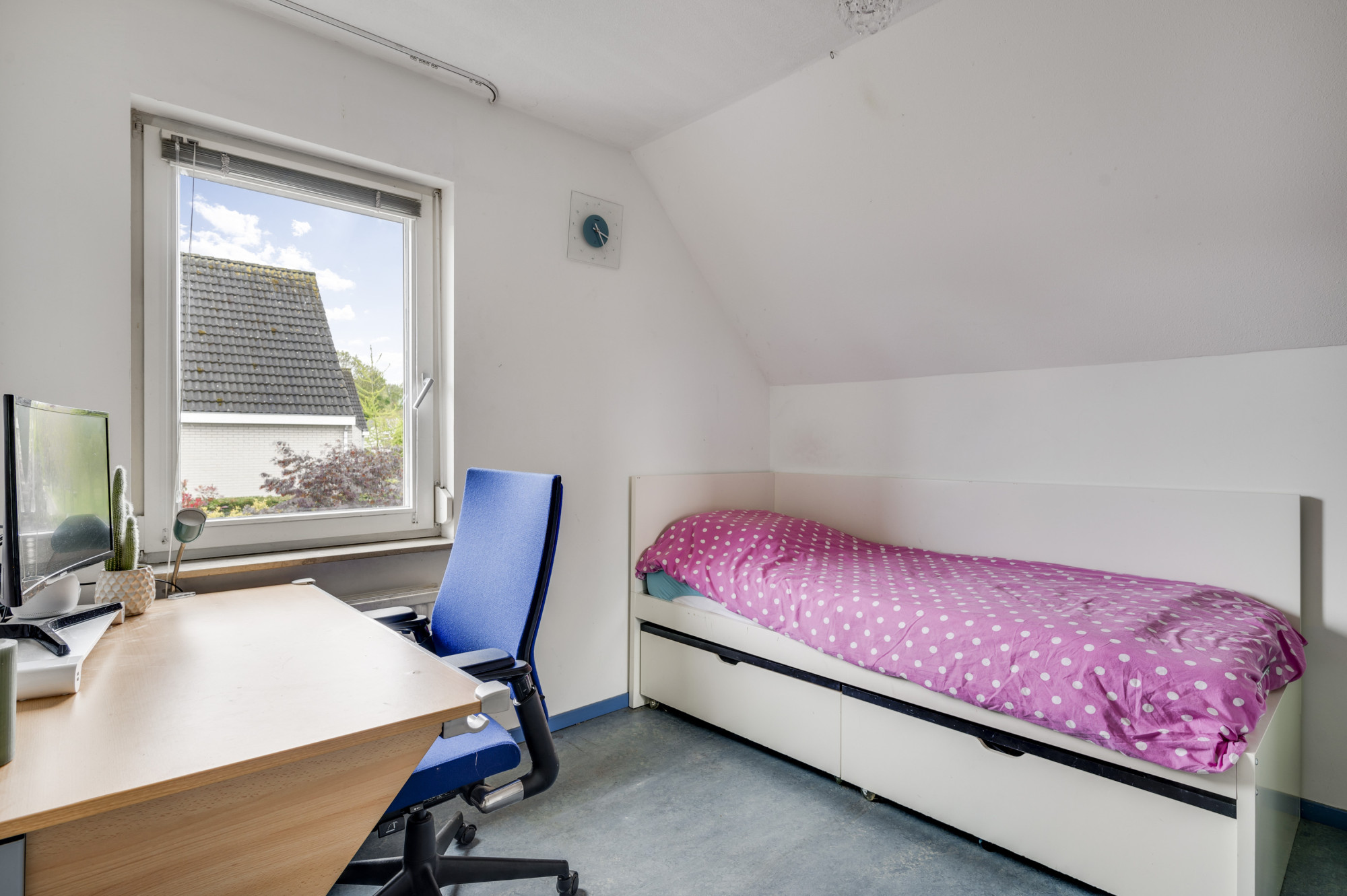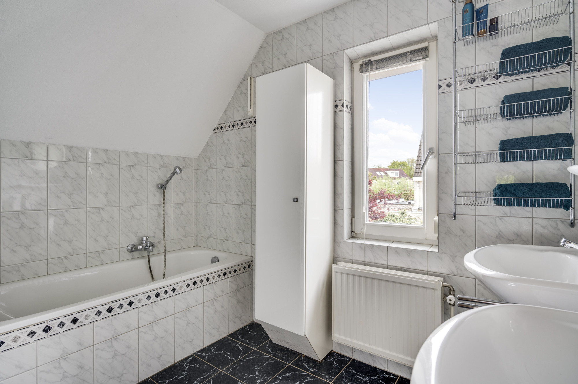 Op de eerste verdieping kom je bij een overloop met een berging en een aparte toiletruimte met een vrijhangend toilet. Verder zijn hier 3 slaapkamers en de badkamer gelegen. De ruime hoofdslaapkamer bevindt zich aan de voorzijde van de woning en heeft openslaande deuren naar het balkon. De zijslaapkamer is uitgerust met een dakkapel en heeft een vaste kastenwand. Aan de achterzijde bevindt zich de derde slaapkamer, die beschikt over een raam met rolluik voor de nodige privacy en lichtregulering. De badkamer is volledig betegeld en heeft een tijdloze uitstraling dankzij de witte kleurstelling. Hier vind je een ligbad met thermostaatkraan, een aparte ruime douche met thermostaatkraan en twee vaste wastafels met spiegels.